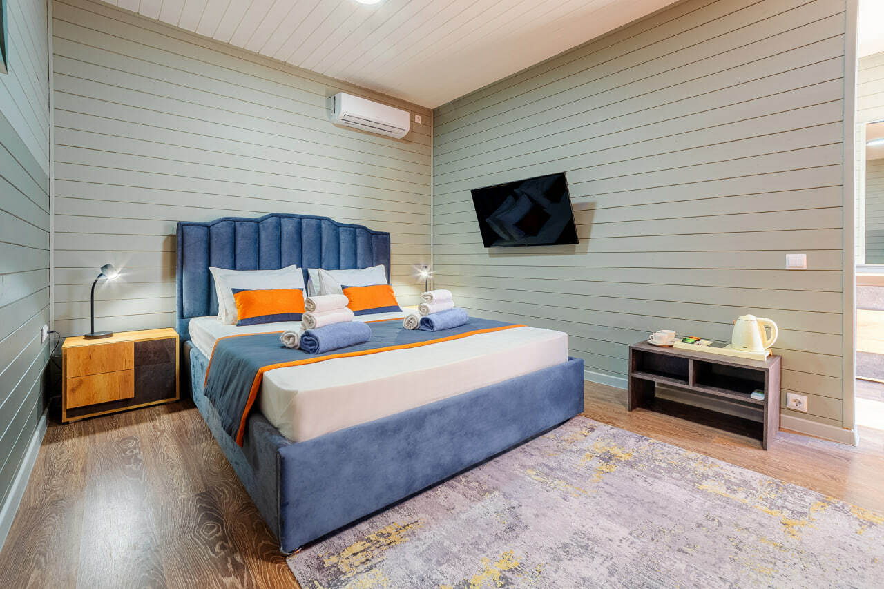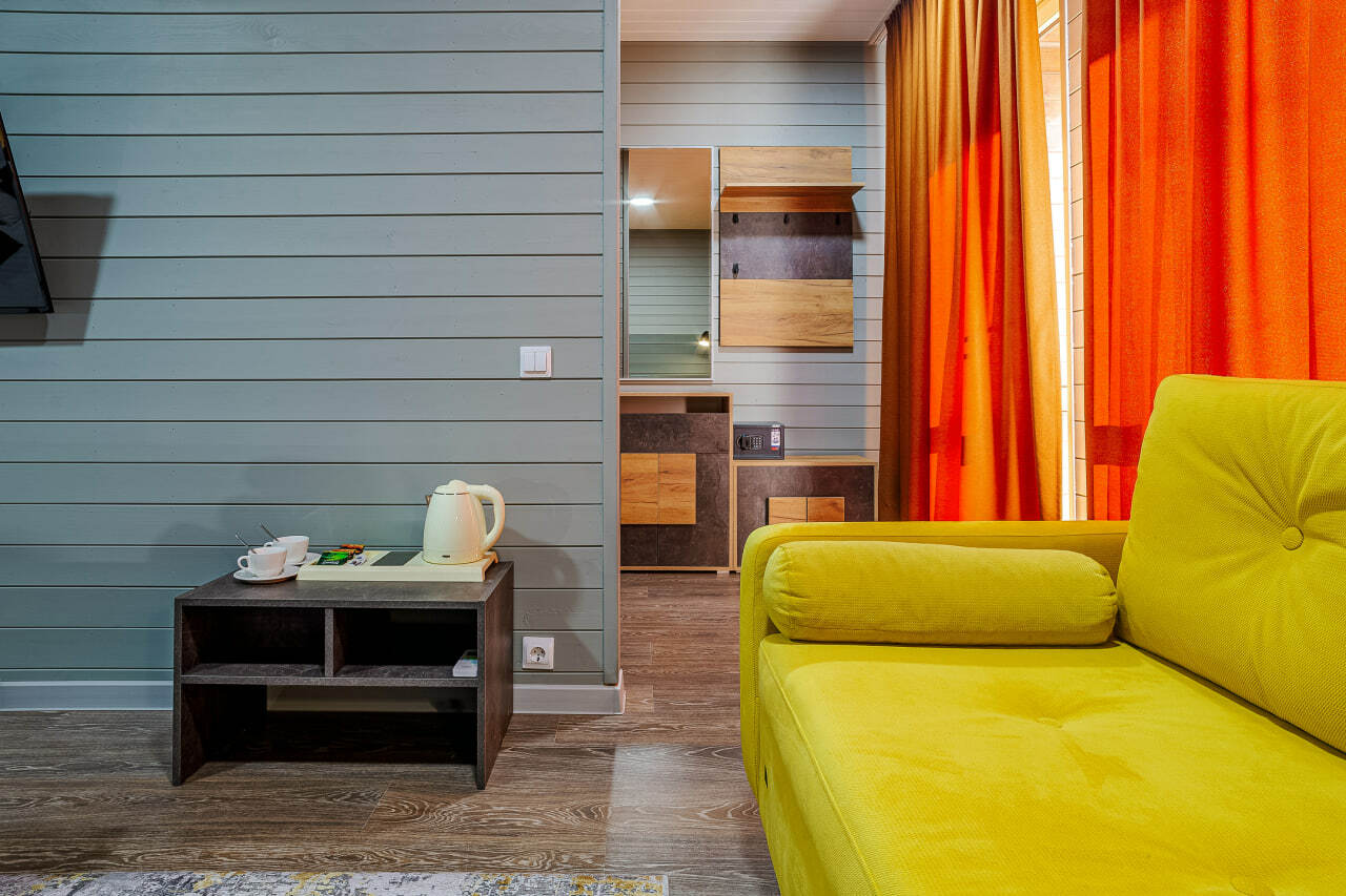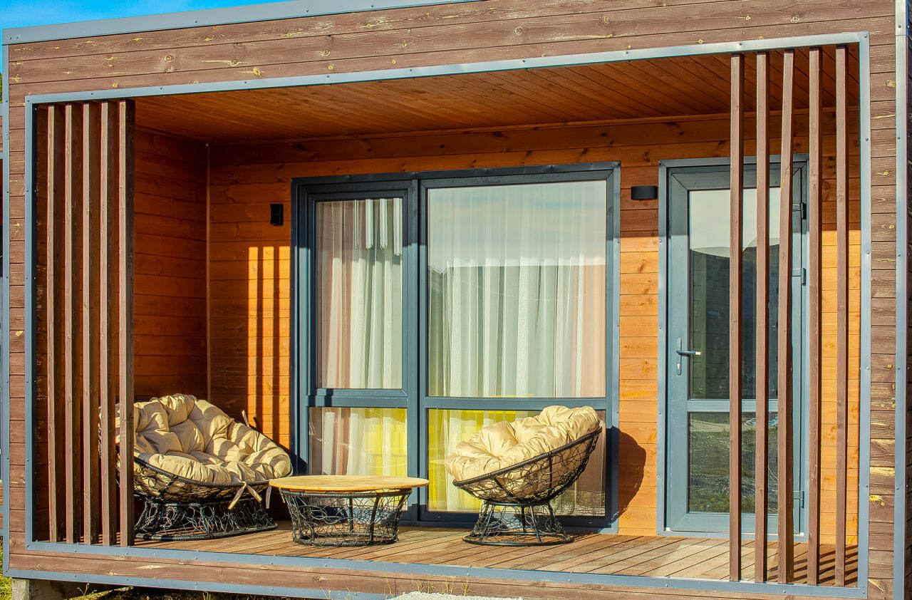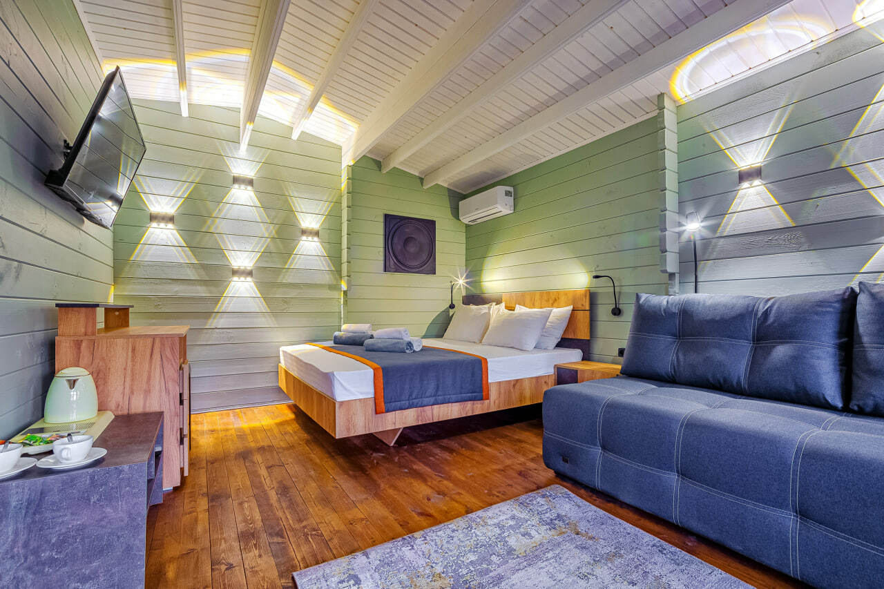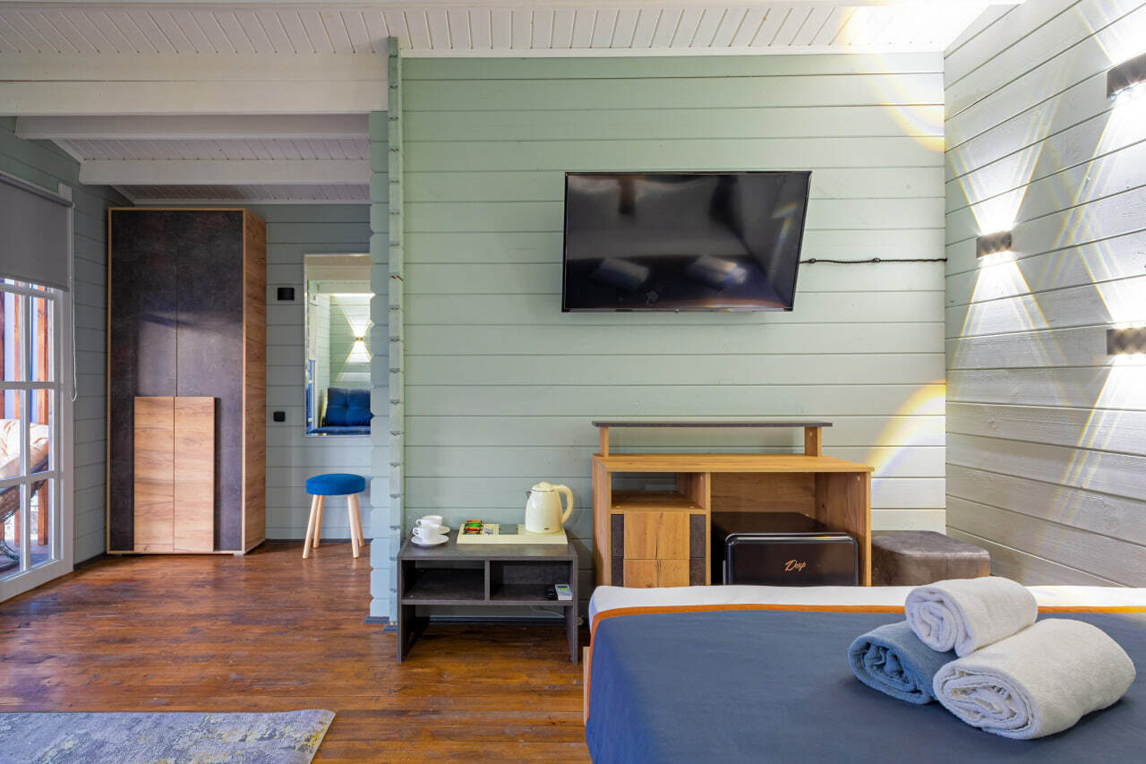 Однокомнатный экодом с прихожей, спальней и меблированной террасой. В комплектации двуспальная кровать, диван-кровать, прикроватные тумбочки, шкаф, зеркало, пуф. В числе удобств — Wi-Fi, телевизор, сейф, чайная станция, кондиционер и холодильник. Ванная комната с душем, феном и туалетно-косметическими принадлежностями.