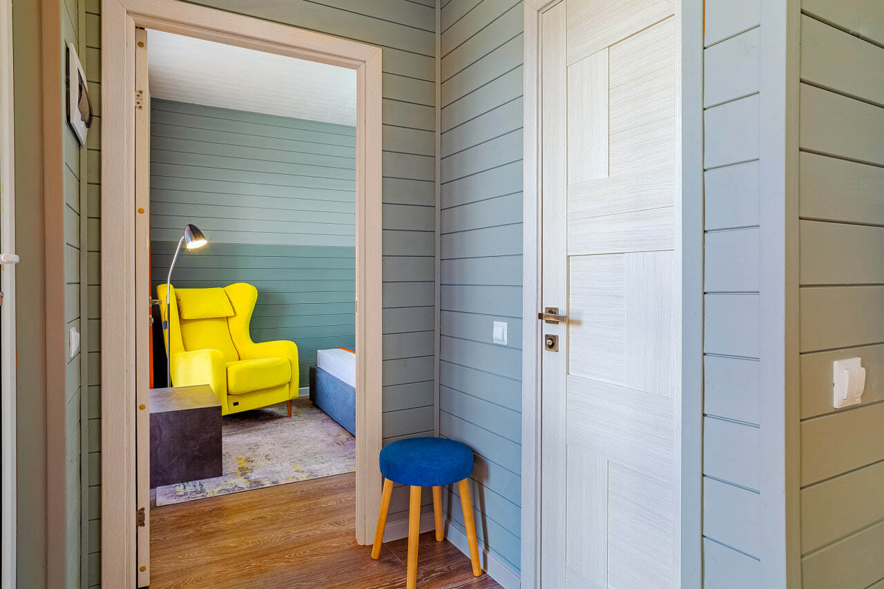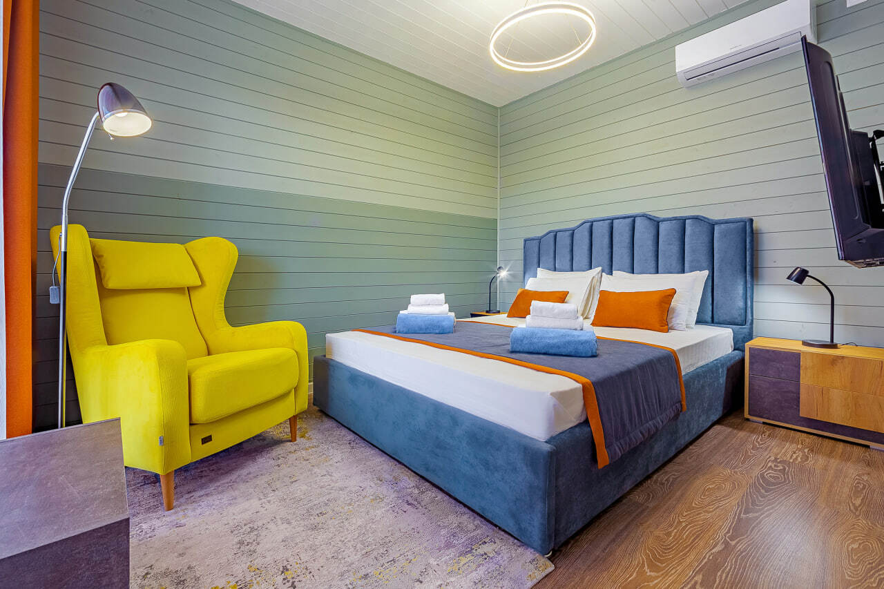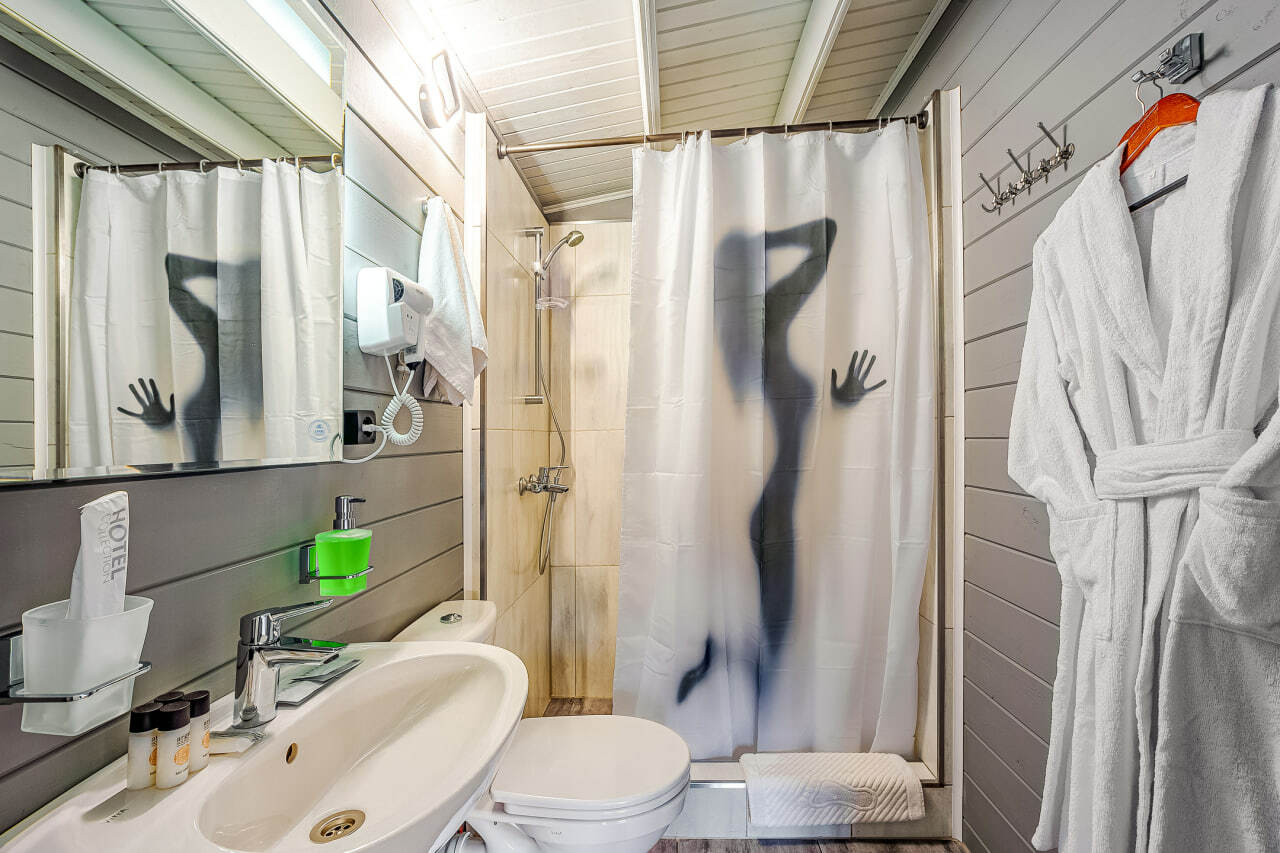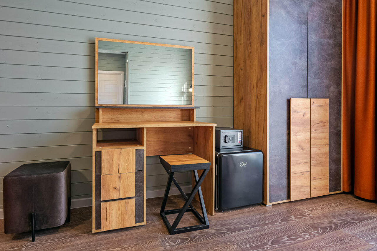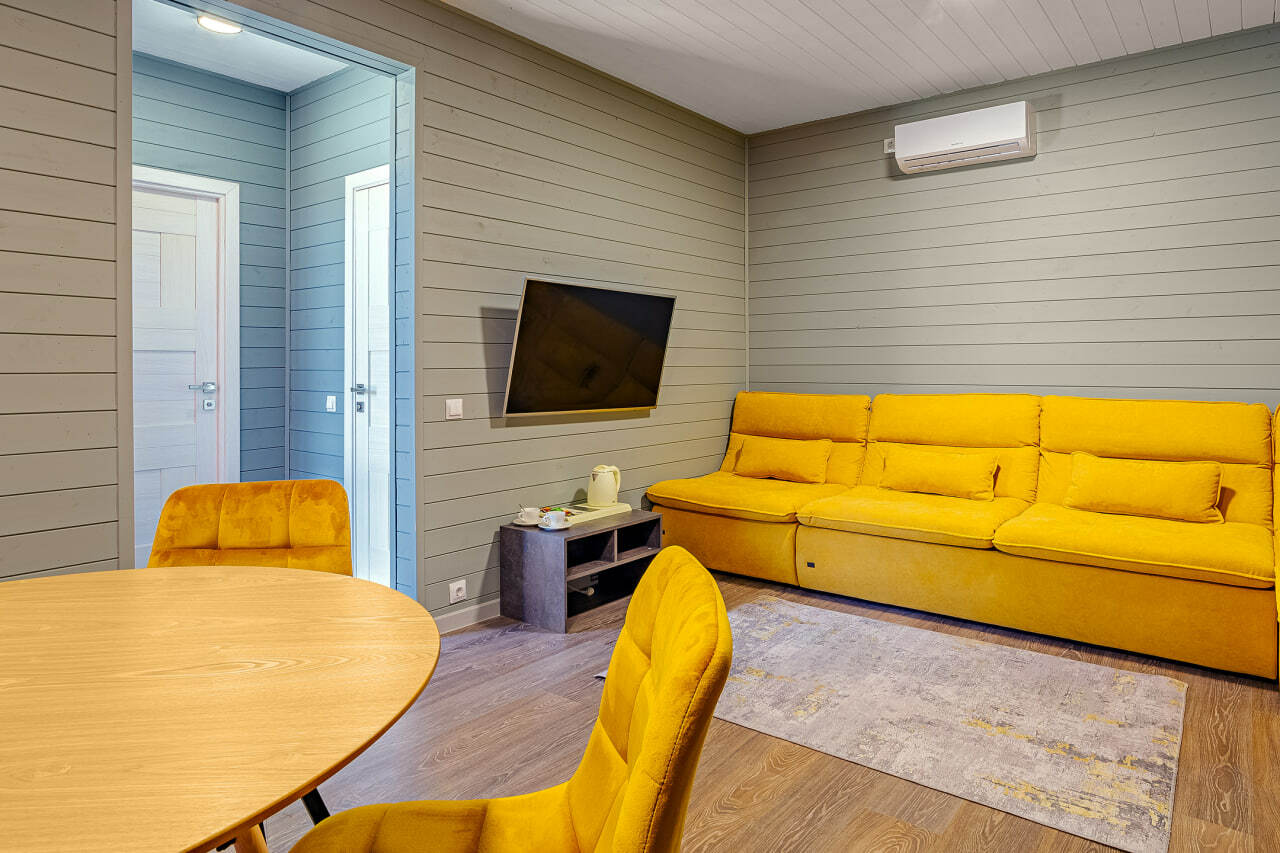 Однокомнатный экодом с прихожей, спальней и меблированной террасой. В комплектации двуспальная кровать, диван-кровать, прикроватные тумбочки, шкаф, зеркало, пуф. В числе удобств — Wi-Fi, телевизор, сейф, чайная станция, кондиционер и холодильник. Ванная комната с душем, феном и туалетно-косметическими принадлежностями.