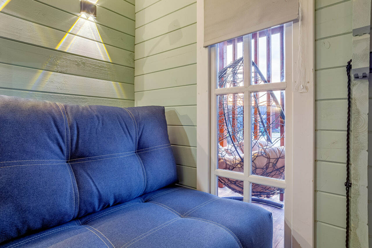 Экодом со спальней и прихожей оснащен ванной комнатой с душем, феном и туалетно-косметическими принадлежностями. К услугам гостей двуспальная кровать, диван-кровать, прикроватные тумбочки, шкаф, зеркало, пуф. В числе стандартных удобств Wi-Fi, телевизор, сейф, чайная станция, кондиционер и холодильник. Терраса оборудована мебелью.
