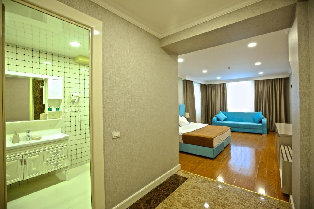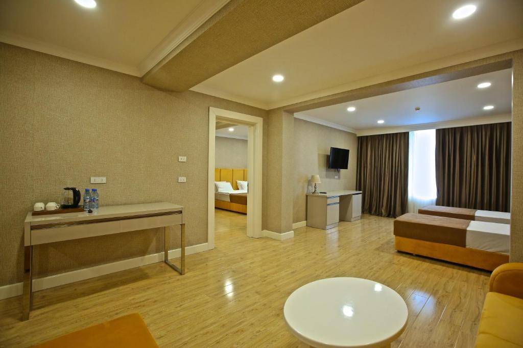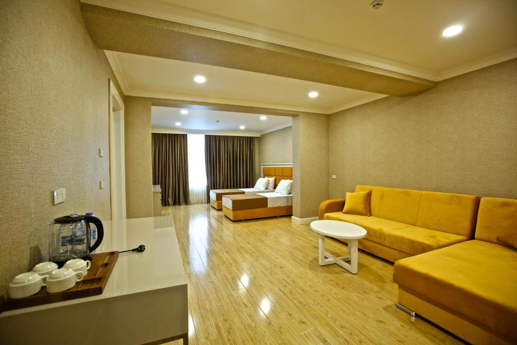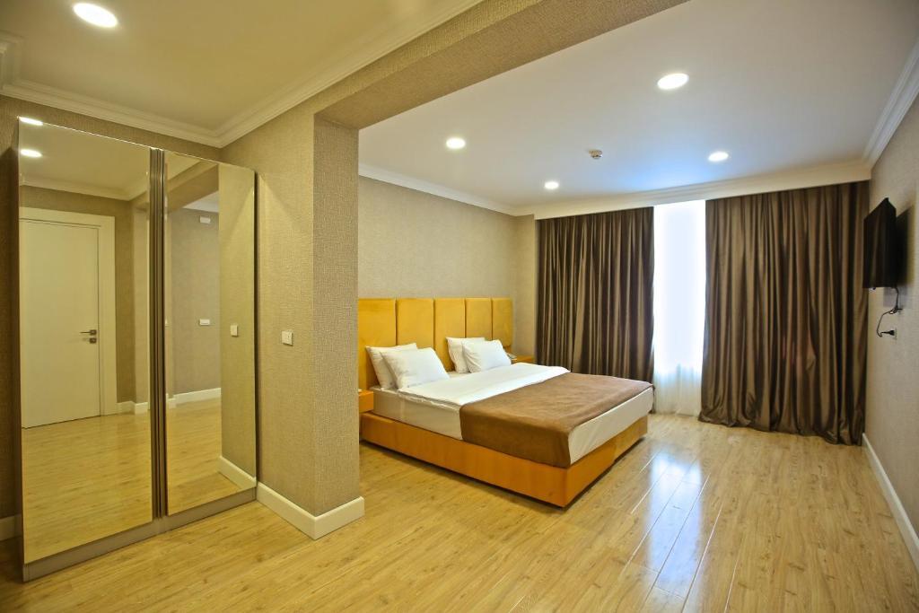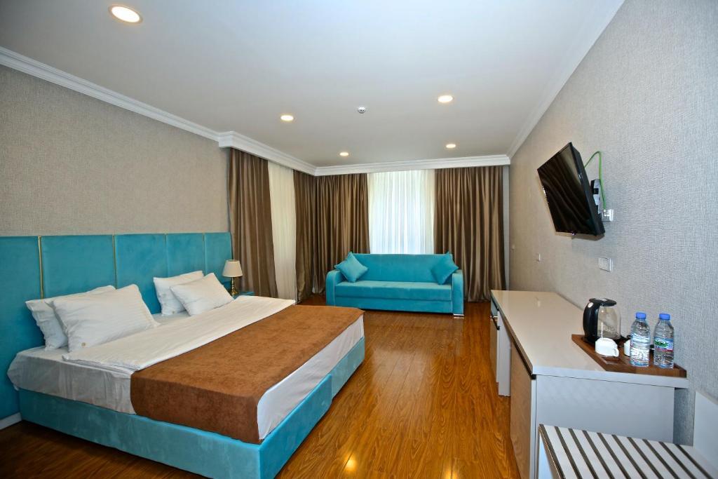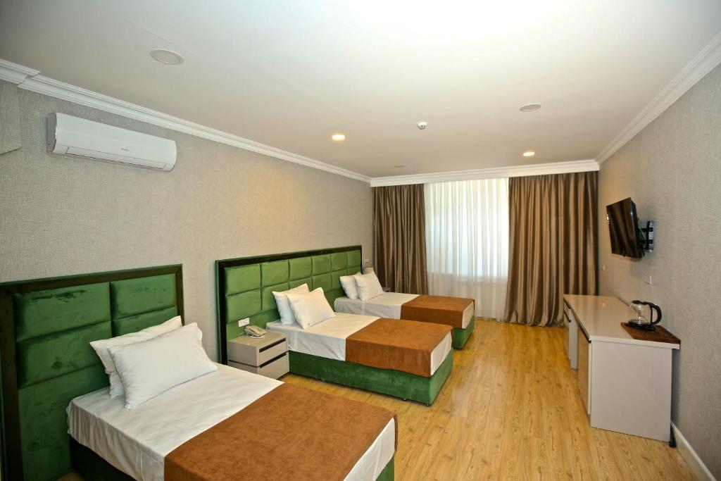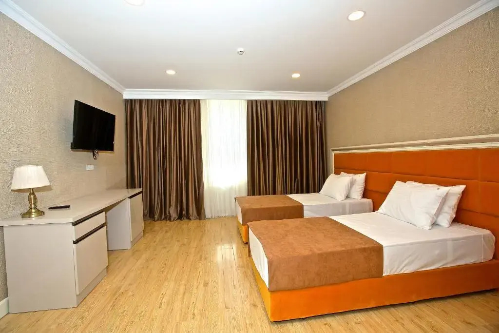 Поставил одну звезду только потому, что нельзя поставить ноль. Выбирая данный отель, я ориентировался на отзывы предыдущих туристов и очень сильно ошибся. Отель – средняя тройка, персонал вообще нельзя допускать к работе с людьми! Обо всем по порядку. Проживали в Grand Inn Baku с 5 по 12 августа. Так как мы с супругой прилетали ночью, я связался с директором отеля и забронировал трансфер из аэропорта в отель. Стоимость около $15 (хотя по городу это стоит вдвое дешевле). Однако на выходе из аэропорта нас никто не встретил. Подождали 10 минут и пришлось взять такси «от борта» за $30. Приехав в отель, мы надеялись хотя бы на извинения, но нас встретил тучный заспанный и очень злой администратор. Вместо извинений, недовольный сотрудник меня жестко отчитал, обвинил в неадекватности и вместо заселения потребовал полной оплаты за проживание. Я рассчитался и уточнил, когда можно обсудить эту ситуацию с директором отеля, после чего я узнал, что он и есть директор Эмиль (тот самый, которому признавались в любви в предыдущих отзывах). Эмиль бросил на стойку ключ и вместо заселения указал пальцем в сторону нашей комнаты №202. Номер. Номер изрядно потрепан. В частности: подтёки на потолке, прожженная обивка дивана, грязные столешницы, оторванные ручки в мебели, отсутствие лампочек в торшерах, большая част розеток не работают и даже дыры (!) в стене и т.д. К нашему заселению в номере было только 1 полотенце и то для ног. У нас был заказан номер с двумя раздельными кроватями, а по факту 2 кровати были сдвинуты и убраны Односпальным комплектом белья. Первую ночь я спал без простыни, на локте вместо подушки укрывшись занавеской. Проживание. На следующий день ближе к полудню нам удалось выпросить еще один комплект полотенец и белья. Телевизор в номере без пульта, антенну я нашел за комодом. Из-за неисправных розеток телевизор и холодильник в номере работают по очереди. По мнению вечно недовольного «директора» Эмиля - это нормально. Даже чайник в номер выдавался Эмилем с претензией. Уборка номера со слов директора Эмиля «не положена» чаще 1 раза в 3 дня, поэтому мусор из нашего номера не убирали. Вода из крана всегда едва-едва тёплая, а в один из дней воду совсем отключили в 9 вечера. Эмиль решением этого вопроса не заморачивался. Однако директор Эмиль очень быстро отреагировал когда я вышел из номера без майки: он немедленно постучал к нам в дверь и отчитал за непристойное поведение в его отеле. В течении дня директор Эмиль развлекался включением в отеле на всю громкость его любимой музыки и наслаждался этим концертом развалившись у себя в кабинете. Треки менялись каждые полминуты. Желание постояльцев слушать эту какафонию его не интересовало. Еще один изощренный вид издевательства над нами – собрать прямо перед дверями номера компанию единомышленников и громко болеть за любимую команду на Олимпиаде. Завтраки. К завтракам у нас претензий особых нет: однообразно, не слишком вкусно, но голодными не были. Расположение отеля. От метро около 10 минут, рядом центр Алиева. Правда под окнами находится рампа магазина куда ранним утром подвозят товар. Всё бы ничего, но водители грузовиков регулярно бибикают чтобы открыли шлагбаум. Если вы крепко спите – это не помешает. Напоследок. Отзыв об отеле GRAND INN BAKU не имеет ничего общего с городом и его жителями: Баку великолепен, бакинцы прек