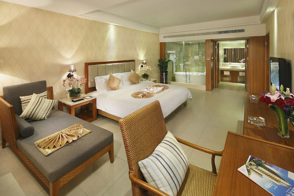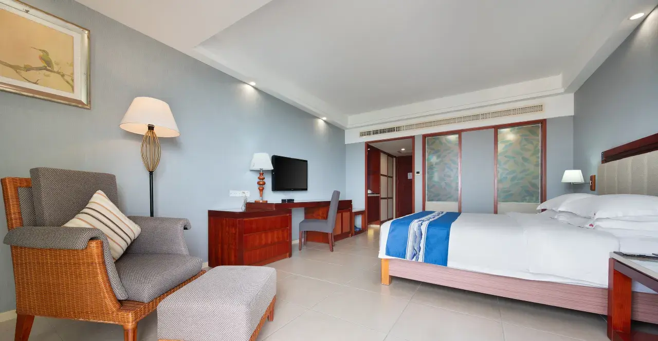 Комплектация номера включает в себя две односпальные или двуспальную кровать размера king-size, кондиционер, телевизор, телефон, холодильник, сейф. Ванная комната с ванной, феном, тапочками и туалетно-косметическими принадлежностями. Имеется балкон с видом на море.
