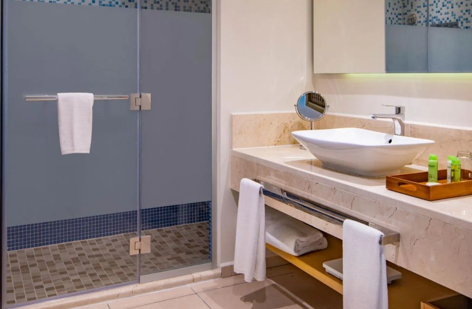 Однокомнатный номер оборудован двуспальной кроватью, гостиной зоной с раскладным диваном и террасой с мебелью. В числе прочих удобств кондиционер, телевизор, сейф, Wi-Fi, мини-бар, набор для чая/кофе, утюг и гладильная доска, весы. Санузел с ванной, душем, феном и туалетно-косметическими принадлежностями.