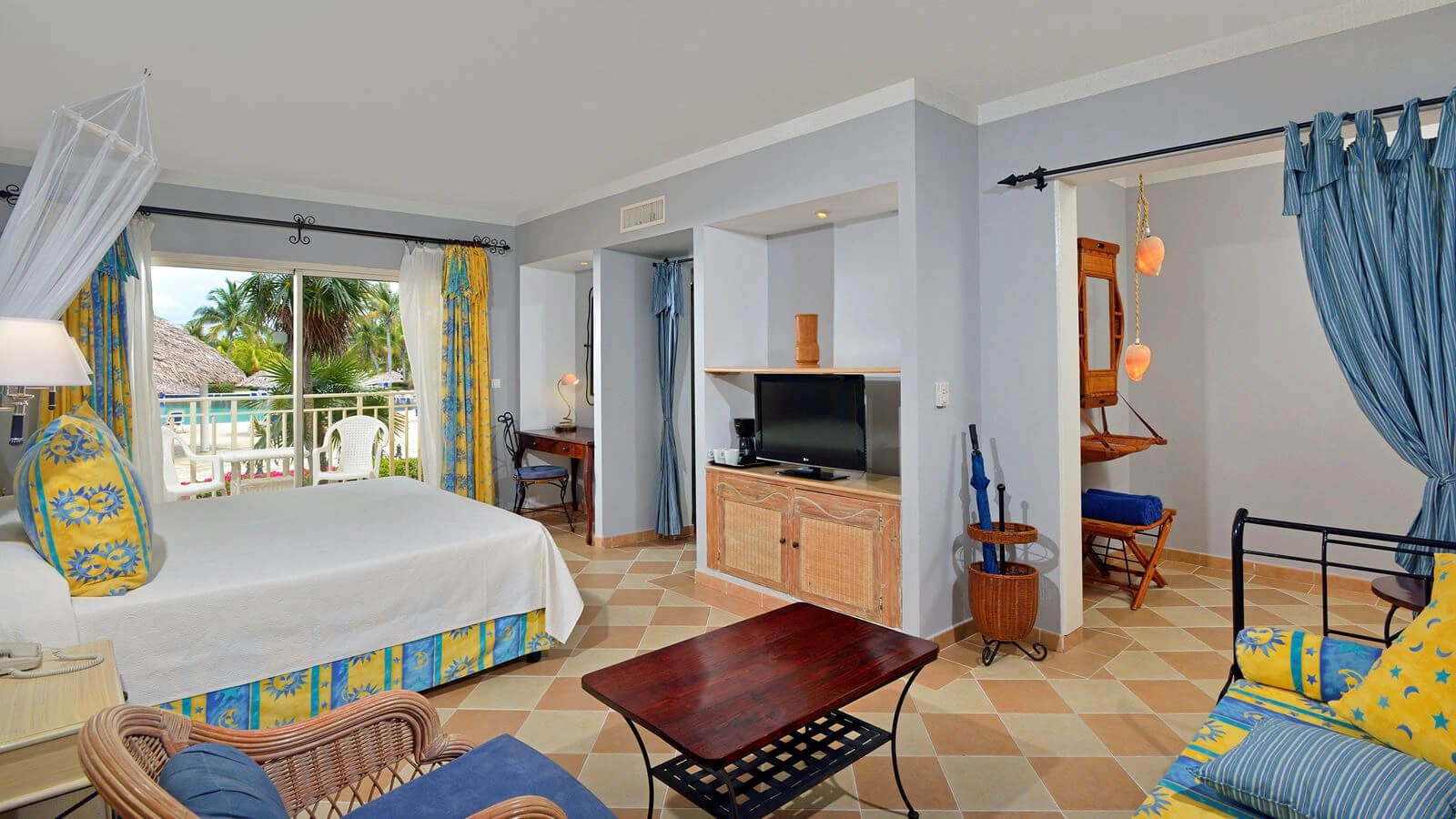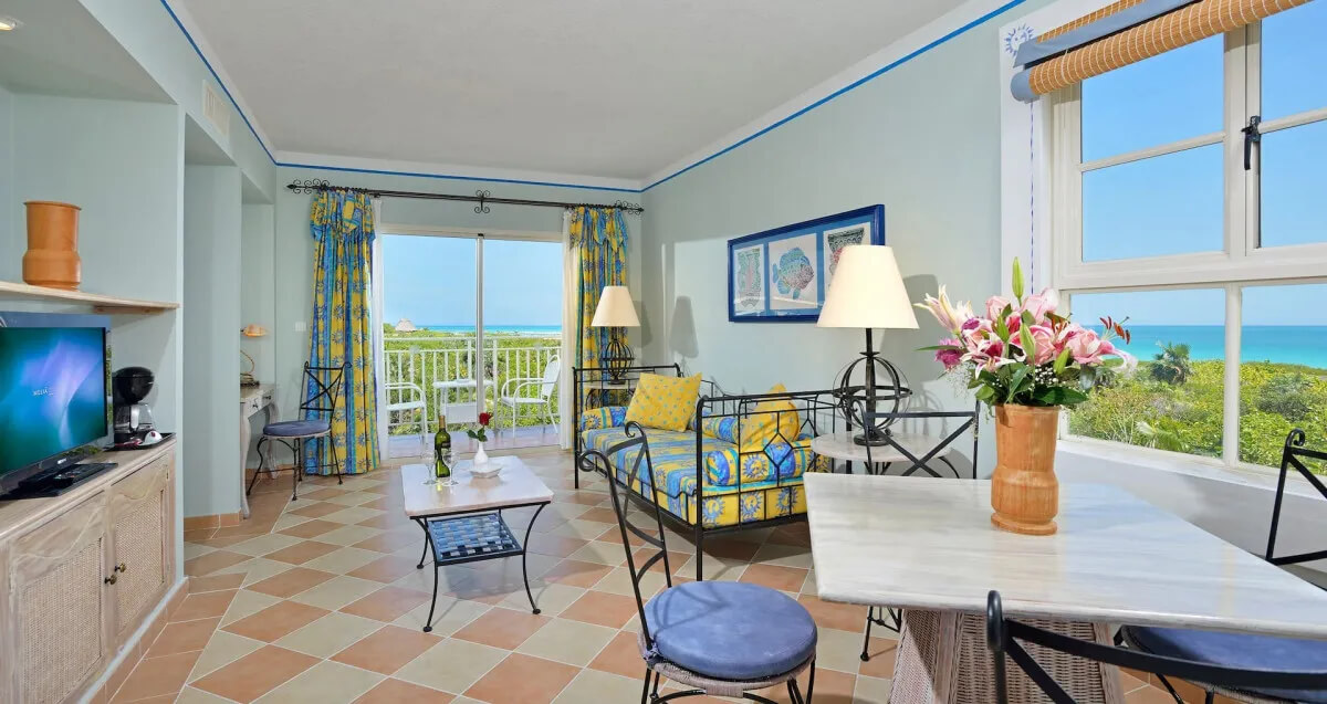 До отеля мы добирались из Гаваны на комфортабельном автобусе в течение 6 часов. Экскурсовод без знания русского языка. По дороге было две остановки, на одной из них можно было перекусить за свой счёт. Мы купили два бутерброда и по стакану сока за 9 куков. На рецепшн нам преподнесли приветственный бокал сока и на машинке привезли к домику, куда нас по-селили. Когда уезжали, нас также доставили до рецепшин. Однако план отеля нам не дали. Домики двухэтажные. Нас поселили на втором этаже. Стандартный номер очень хороший. Только не было штор в прихожей и перед санузлом. Отсутствовала одна дверка шкафа-купе, а другая держалась только в верхней части. Но это – мелочи. Прибиралась комната каждый день, если мы считали, что нужно поменять полотенце или постельное бельё, клали специальную карточку на постель, и всё исполнялось. В телевизоре есть 1 канал Российского ТВ. Территория небольшая, уютная и очень красивая. Много клумб, инсталляций, редких растений. Около двух бассейнов – джакузи с тёплой водой, кафе-мороженое. Пляж широкий, песок желтоватый, несколько крупный. Вход в океан пологий, через несколько метров – в воде песчаная коса. Есть катамараны и водные велосипеды. На пути от бассейна к пляжу – туалет и домик, в котором мы взяли пляжное полотенце. Питание – средне, учитывая, что отель – пять звёзд. Мало фруктов, бананы были только один день. Толь-ко дважды была картошка (фри) и колбаса. Была проблема, допросится ложку. Суп хоть вилкой ешь. В лобби-баре были хорошие выступления двух кубинских ансамблей, играли скрипач и гитарист, выступа-ли силовые и воздушные акробаты. В театре танцевальные номера были однообразны, больше - акробатические. Немного – эстрадного вокала, хотелось бы и классического. Никто из сотрудников не знает русский язык. Хотя отель небольшой, но не было постоянного их общения с туристами, как это было, например, в отеле Мелья Кайо Коко.
