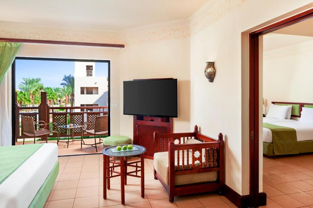 Номер состоит из спальни с двуспальной кроватью, гостиного уголка с диваном, ванной комнаты с душем, балкон или террасы. Из удобств кондиционер, телевизор, чайник, мини-бар, сейф, фен, гигиенические принадлежности.