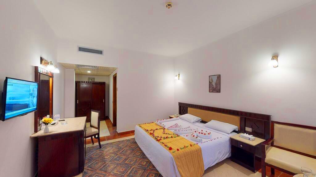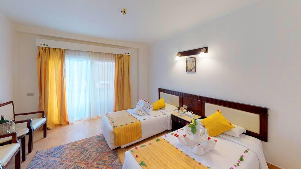 Была в этом отеле с 21 октября 2025 по 1 ноября 2025 с сыном, отель выбирала, сортируя по цене, но опираясь на отзывы. Сравнив все, поняла, что отель будет самым оптимальным для нас. Итак начинаю сначала, на ресепшене угостила шоколадкой, мне предложили номер за доп плату получше, я отказалась, он дали все равно нормальный номер) может просто повезло, позже слышала как ругалась одна женщина , что по приезду не было чистого белья и полотенца, но вопрос решили. В моем номере все было хорошо, и красиво уложены полотенца в виде сердец, позже делали фигуры только если оставишь 1 доллар, но фигуру сделали к сожалению с грязного полотенца, что огорчила) за доллар не могли поменять даж полотенце .. Из минусов для меня ещё кондиционер, он дул очень сильно и громко, я увеличивала градусы, чтобы сильно не продуло, комары есть, но мы не открывали часто окна и было нормально. Персонал Все очень хорошие! Никто ни в чем не отказывал, когда что-то спрашивала, если ты им улыбаешься, они улыбнутся тоже. Отдельное спасибо всем аниматором, для меня было важно, чтобы было чем заняться, ребята молодцы, старались, и танцы, и игры, и стрейчинг, а также акваэробика. Если будет скучно, отведут вас в клуб, но тут выбирайте сами, мне не подошёл формат их выхода, очень сильно накурено) но это уже на любителя. Шоу тоже были. Но народ тут не сильно активный, в основном после ужина все расходятся, ночью все гуляют. От отеля недалеко идти до главной улицы, там красиво). Еда Все отлично! Мясо было каждый день и на обед и на ужин, много овощей, с фруктами все похуже, дыня только и то не особо вкусная, гарниры рис, картофель, макароны. Супы овощные мне понравились. Сладкого было много, хороший выбор всего. В субботу рыбный день, давали по три креветки, рыбу. Вкусно)) Из напитков давали по две бутылки воды в день, в четверках не во всех дают как я слышала и воду можно брать с собой на пляж, там нет своего бара от отеля. Алкоголь я не пила, ничего не могу сказать, кола, спрайт, соки все есть. Море Идти туда минут 15, назад в горку, пока идёшь к морю, тебя заваливают комплиментами и предложениями купить что-то у них) Была на двух пляжах от отеля Канабиш и Jewel beach, на Jewel beach народу меньше, инстаграммный вид с бассейна на море, но бассейн с солёной водой, на территории работает анимация, красивый вид территории, но там сразу глубина, либо купаться в этом бассейне, больше для сноркинга место. На пляже Канабиш пологий песчаный вход, в одном месте можно посмотреть на рыбок , но если пройти чуть левее на другой пляж, там можно уже понырять и увидеть больше рыб). На автобусе ездила в Сохо сквер, стоит 10 фунтов всего) это микроавтобус, полный местными мужчинами) для колорита тоже инте было посмотреть как это. Фонтан начал работе только в 8 , мы не дождались, лучше узнать заранее, за 5 фунтов можно доехать в старый город, советую, красиво там. Ну и от отеля недалеко 2 фикс прайса, принимают только фунты, но у них есть обменник рядом, курс нормальный. Основную сумму меняла в банке на основной улице, нужен только паспорт, а так есть банкоматы как в фикс прайс и можно без карточки поменять деньги без проблем. Экскурсии Я брала только 3 экскурсии 4 в 1 Дахаб , парашют с лодки и лодка со стеклянным дном. Все экскурсии брала у Bassem, парень хорошо говорит по-русски , находится на пляже Канабиш, его все знают если спросить, там ж на пляже делала массаж, 