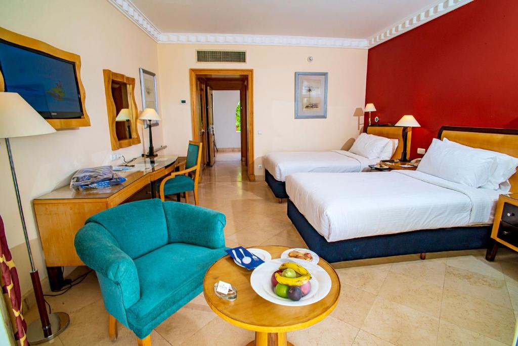 Совсем недавно вернулись из отдыха в отеле Savoy. Оставались там в конце сентября. Мои впечатления: Отель очень высокого уровня. Комнаты приемлимые, мебель деревянная (по мне - большой плюс/экологично), матрасы удобные, уборка ежедневно, каждый день приносят 2 бутылки воды, к ванной претензий нет, шампуни/гели простенькие. Уборщик постоянно ждет от вас чаевые, но мы к этому привыкли в подобных странах. Комаров в комнате почти не было, спали без кондиционеров с открытыми окнами. Территория отеля очень чистая, ухоженная, много зелени. Температура днем 33-35, ночью 27, море 28. В конце сентября стоит комфортная для загорания погода, море очень теплое. Берег песчаный, примерно длиной 80 метров. Резиновая обувь для моря не нужна. Снаряжение для сноркелинга - в самый раз (если вы любитель). Море - потрясающее, плывешь словно в аквариуме. Вода очень прозрачная, много разноцветных рыбок, коралловый риф. Волн нет. Вход в море возможен только с пирса из-за кораллового рифа. Глубина моря у пирса 10-14 метров. Постоянно дует несильный северный прохладный ветерок. Влажность низкая, дышать комфортно. Шезлонгов всем хватает, они комфортные, но первую линию к 7-ми утра уже занимают. Данным пляжом в спец. отведенном месте пользуются постояльцы отелей Sierra и Royal Savoy. Из развлечений - пляжный волейбол в 16:00, дартс, бочча, аквааэробика. Вечерние развлечения организуются на площади Сохо перед отелем, мы не ходили. Контингет постояльцев - итальянцы (большинство), страны СНГ, немного арабов/англичан. Немало русскоговорящих работников. Из персонала особо хотел бы отметить "Тайсона" на пляже, он как луч света там. Остальные ничем не примечательны, но работу выполняют четко. Бассейны есть, но мы не пользовались. Интернет везде ловит. В последний день отдыха поднялась небольшая песчаная буря, видимость была мутная. В марте-апреле сюда ехать не советуют из-за песчаных бурь. Еда в основном ресторане приемлимая, порой однообразная. Утром есть соки fresh (гуава, апельсин, клубника), через день - копченая красная рыба и все что приходит на ум. Манго бывало редко, по вечерам. По субботам - на пляже. Из фруктов - яблоки, груши, апельсины/грейпфруты, сливы, бананы, финики, нектарины. Экзотики (типа драгон фрут) не было. Вечером каждый день есть шашлыки (баранина, рыба). Есть тематические дни. У нас была опция Bed and breakfast. За ужин плата 18 долларов на человека, за ланч - 14 долларов (очень приемлимо). За напитки, кроме воды, взимают доп.плату. Десерты и супы не понравились (у египтян нет обычая есть супы). В целом, едой остались довольны. Но отсутствие порой манго огорчало. Приходилось идти покупать в маркете за 1,5 доллров/кг. Алкоголь не употребляем, но выбор был большой. Для новоприбывших - в основном ресторане, в глубине зала, во втором секторе "спрятана" зона барбекю (шашлыки) и мороженое: не упустите. На пляже много назойливых служащих, предлагающих фото, водные развлечения, экскурсии, спа, массаж, прически... За пределы отеля/площадь Сохо не выходили - ничего интересного и жарко. Из аэропорта нас забрал бесплатный автобус отеля - надо их заранее предупредить. Такси из отеля в аэропорт ночью (очень близко)- 10 евро. С таксистами/продавцами надо торговаться. Валюту не меняли. Везде принимают доллары. В маркетах платили картой. Аэропорт находится в плачевном состоянии, сотрудники заставляют записывать свои данные письм