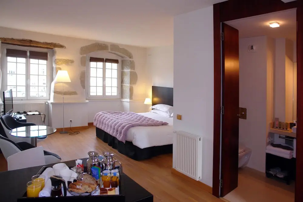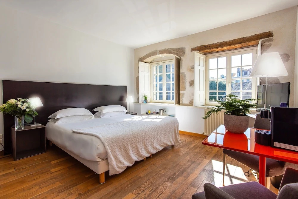 Мы остановились в Ле Темп де Вивр на три ночи в целом. С той минуты, как мы вошли в дверь, и до нашего отъезда о нас не могли позаботиться или заставить чувствовать себя более желанными. Каждый член команды отеля, особенно Флоренция, убедился, что наше пребывание было не иначе как превосходным. Уникальность здания и то, как оно было модернизировано, сделали его совершенно особенным местом пребывания. Отель чрезвычайно хорошо расположен и выходит на площадь в одну сторону и на море в другую. Наш номер выходил на первый и был просторным и хорошо оборудованным, современным и удобным. Каждое утро мы с нетерпением ждали завтрака с отличным выбором, включая свежие багеты, круассаны, фрукты, сыры и мясо, а также свежеприготовленные крепы. Ничего не было слишком много усилий для персонала, и мы обязательно вернемся туда, когда мы в следующий раз навестим Роскофф. Мы очень рекомендуем.