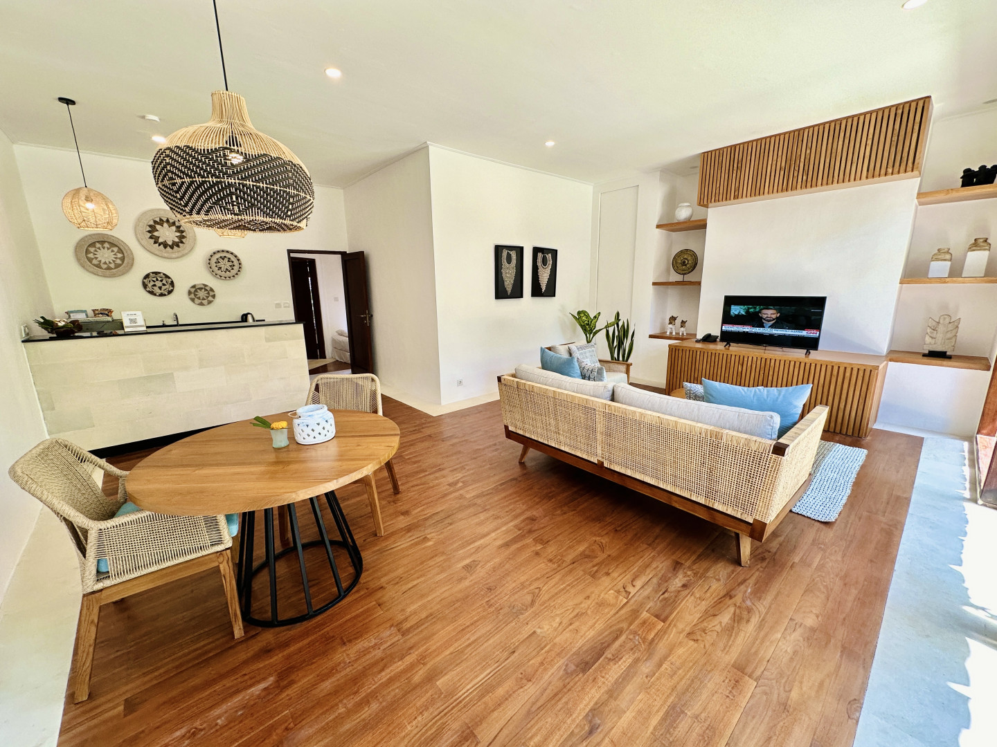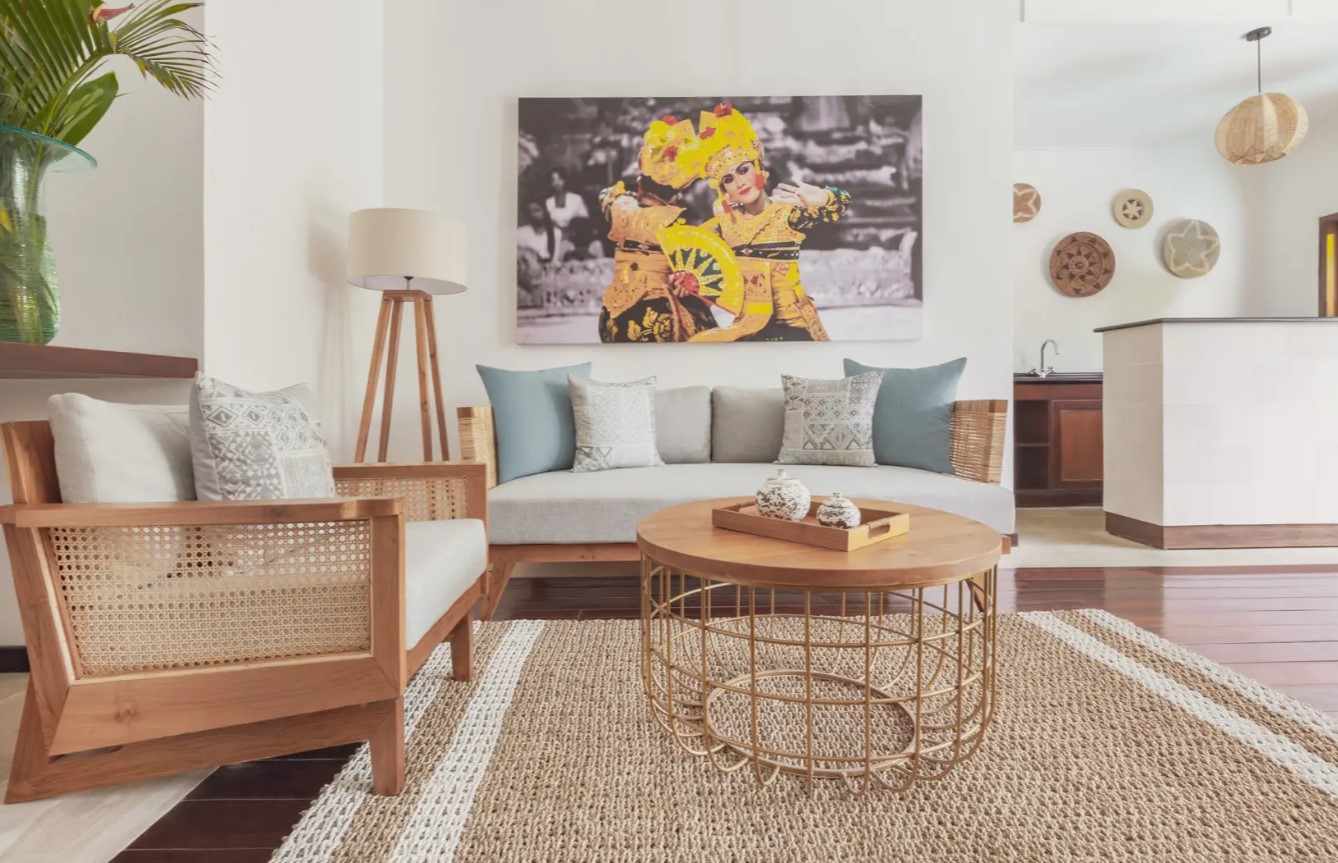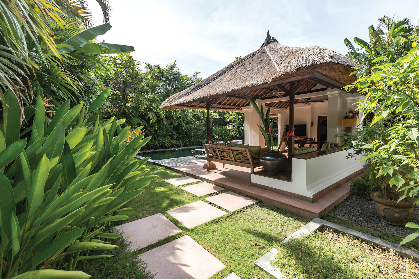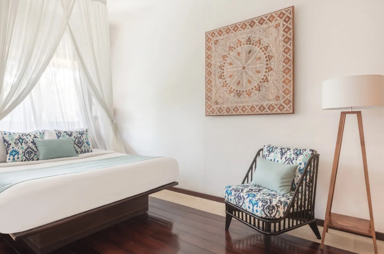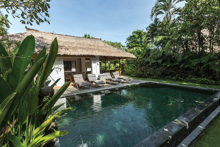 Просторная вилла с 2-мя спальнями (каждая с ванной и душем) с двуспальными кроватями, меблированной гостиной и столовой на открытом воздухе в балийском стиле, оборудованной кухней, террасой, тропическим садом и частным бассейном. В комплектации кондиционер, телевизор, мини-бар, чайник, телефон, сейф, туалетные принадлежности, тапочки, халаты.