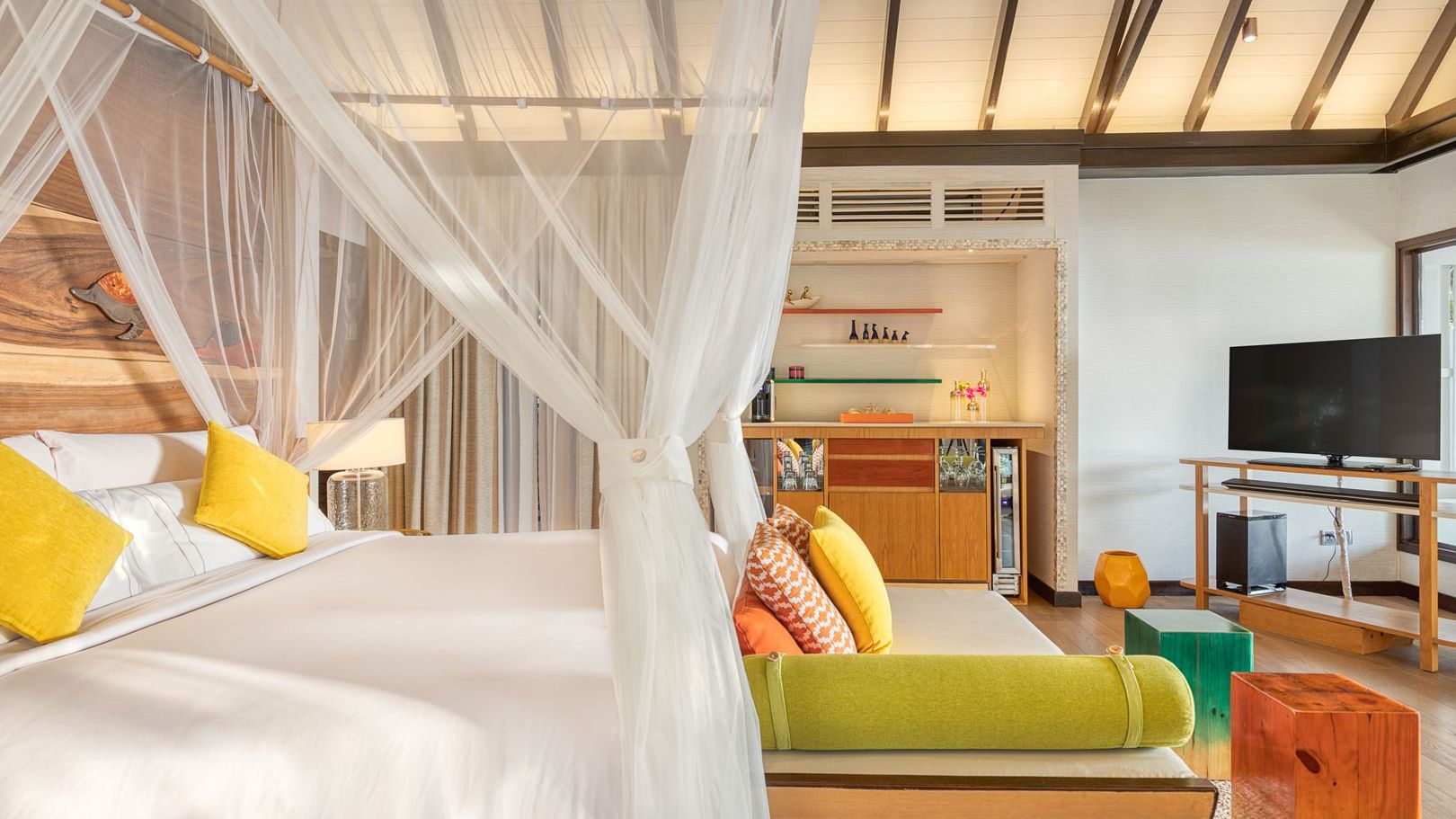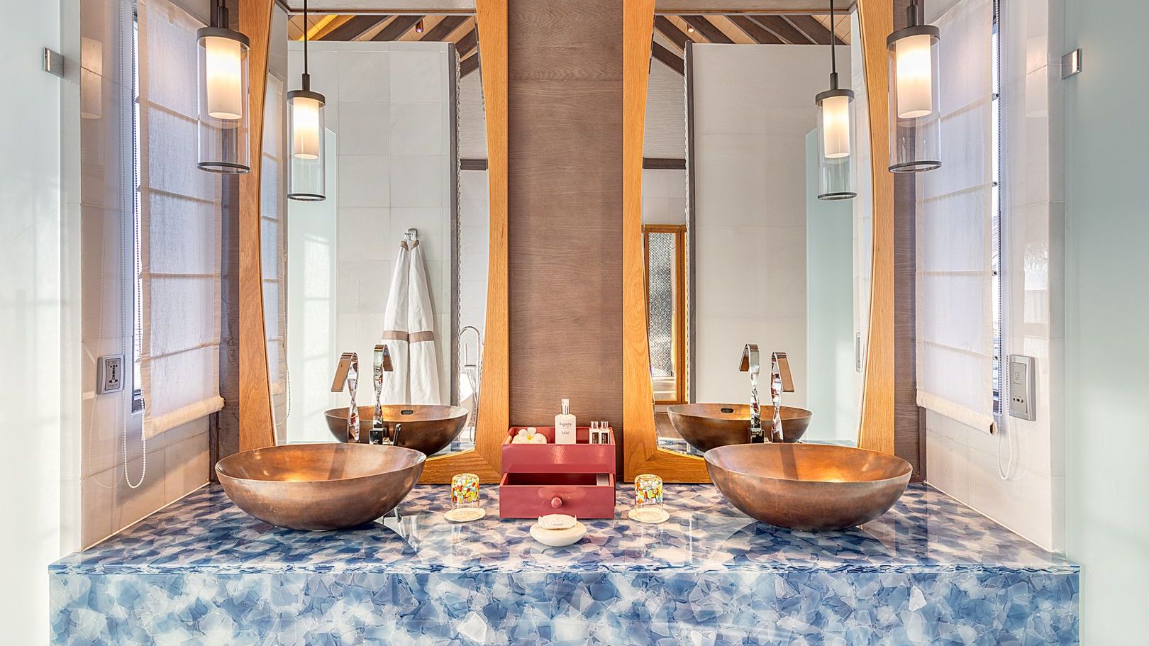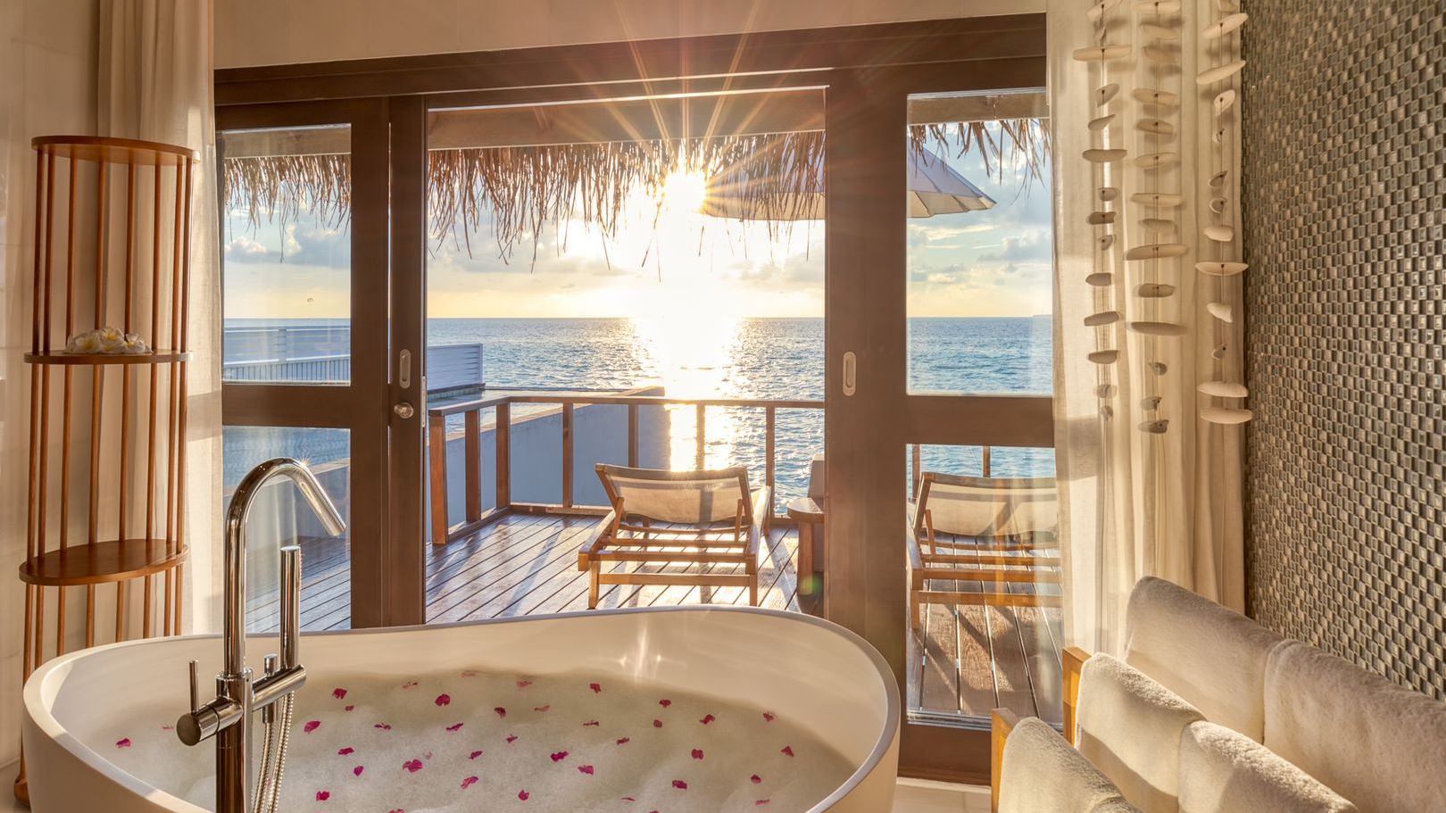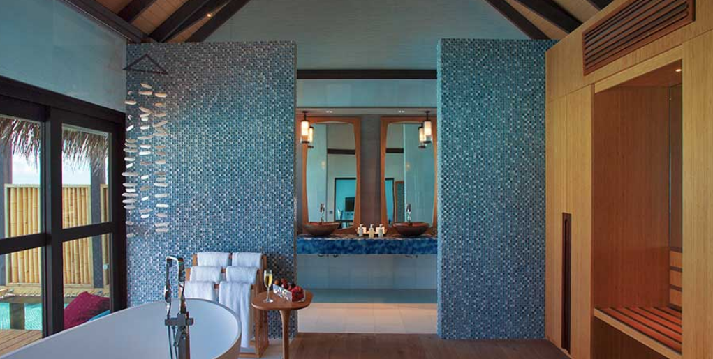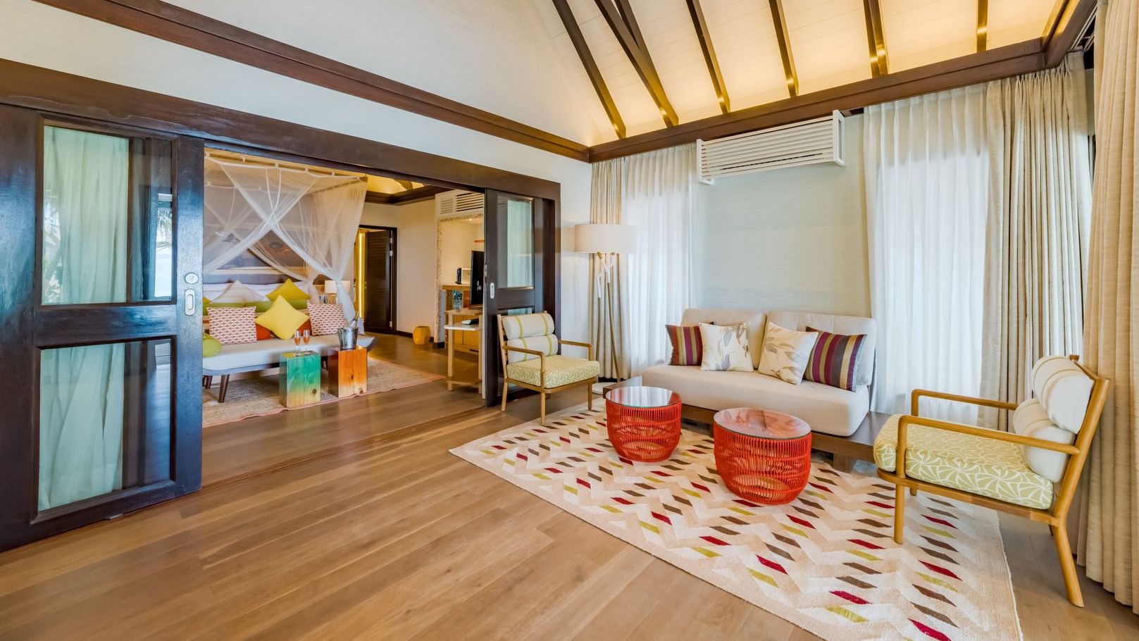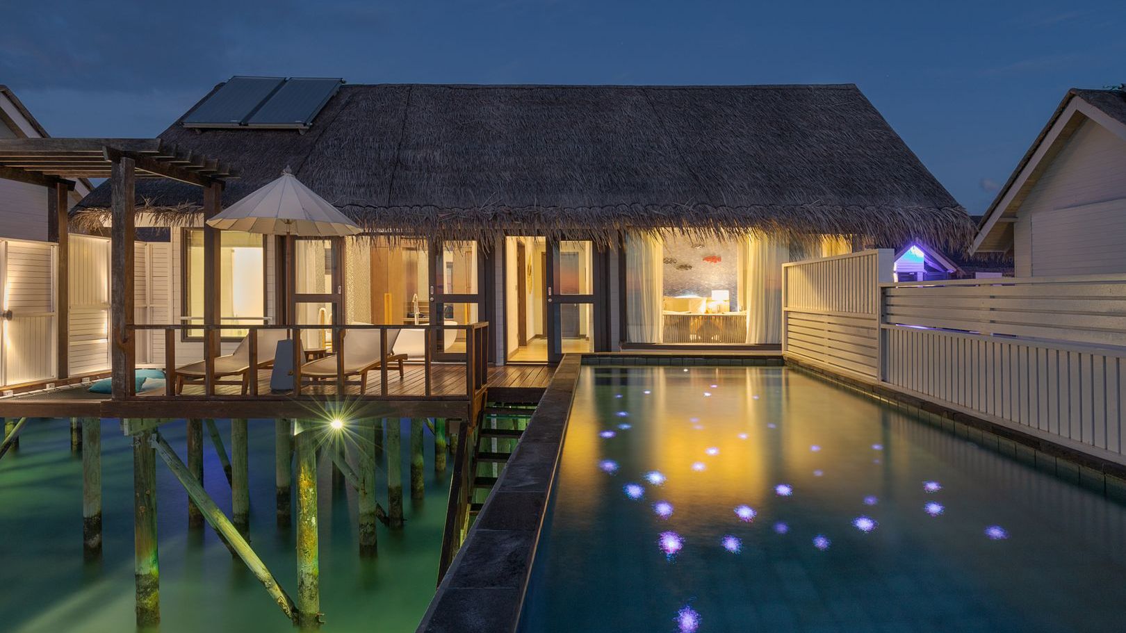 Водная вилла оборудована спальней с двуспальной кроватью и софой, ванной комнатой с ванной, душем, видом на лагуну, террасой с бассейном (20 кв.м), зоной отдыха, гамаком и прямым спуском к воде. Среди удобств кондиционер, телевизор, сейф, мини-бар, набор для приготовления чая/кофе, туалетные принадлежности, фен. Предоставляются услуги батлера.