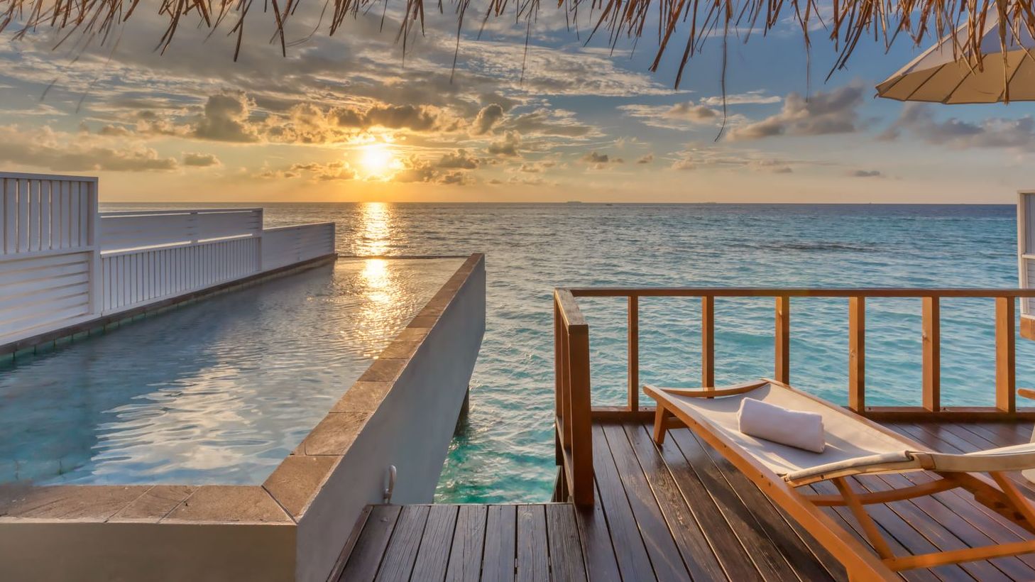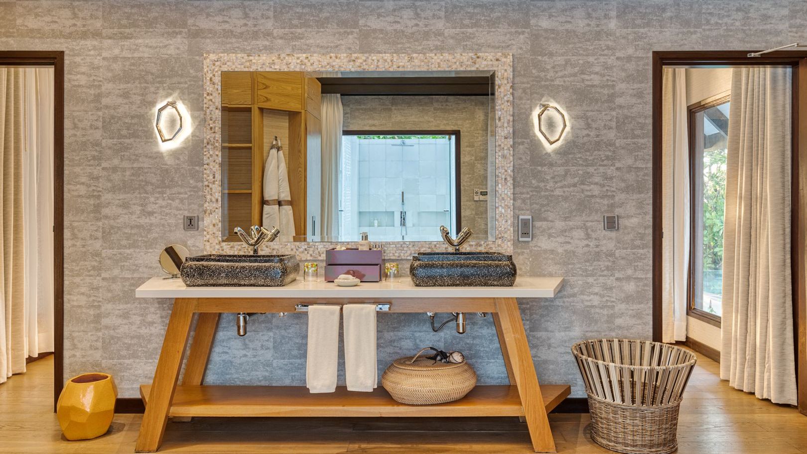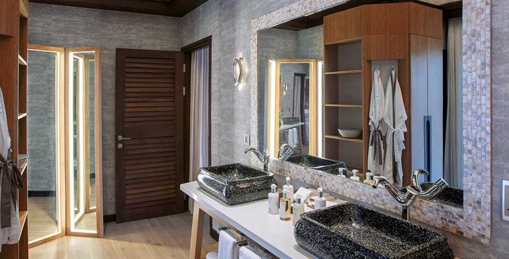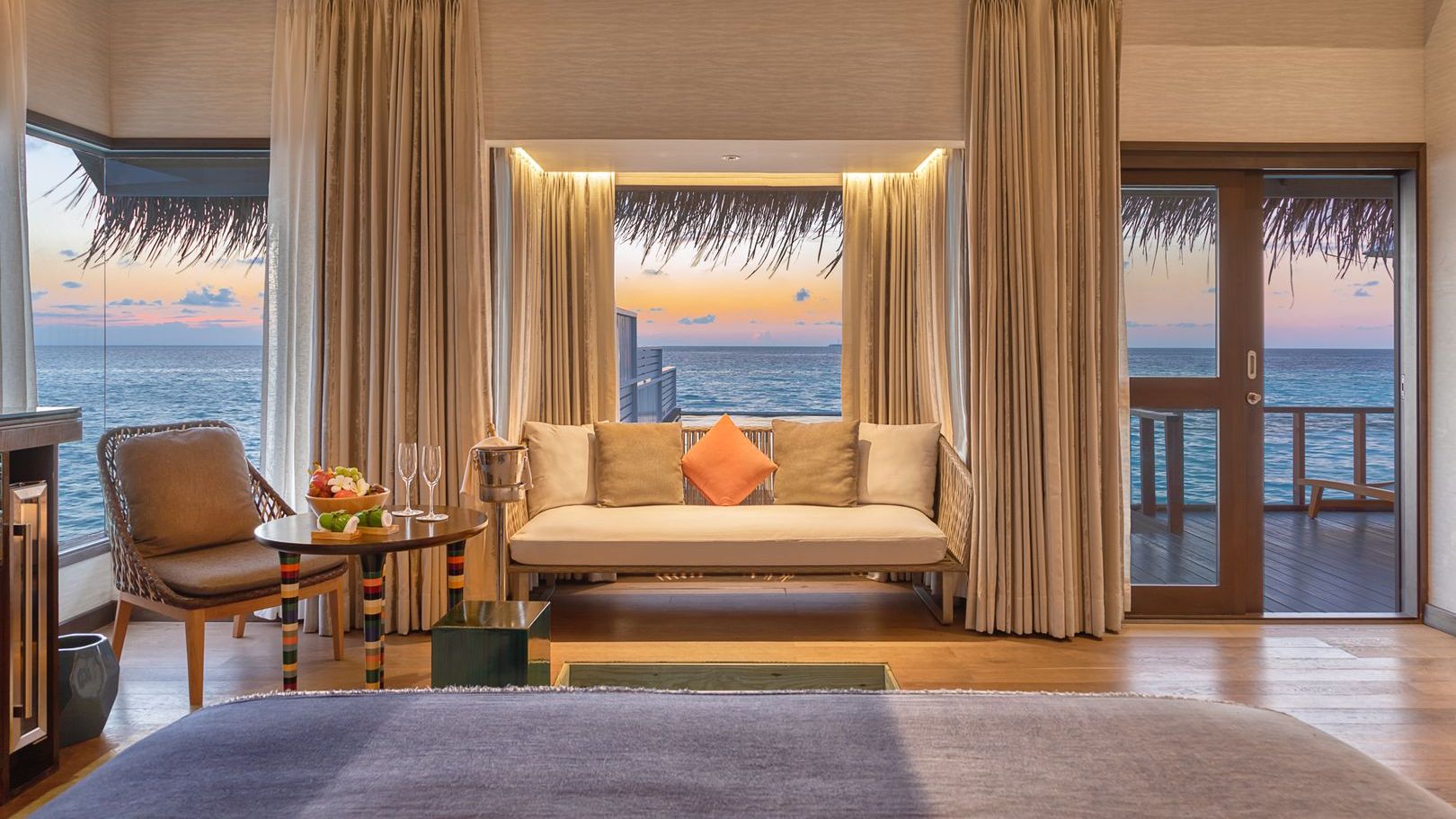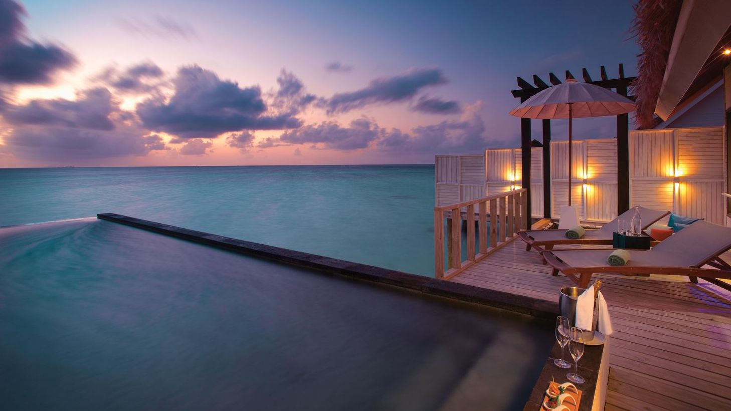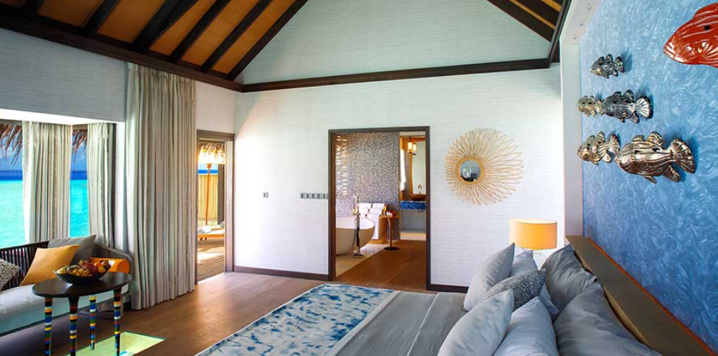 Водная вилла оборудована спальней с двуспальной кроватью и софой, ванной комнатой с ванной, душем, видом на лагуну, террасой с бассейном (20 кв.м), зоной отдыха, гамаком и прямым спуском к воде. Среди удобств кондиционер, телевизор, сейф, мини-бар, набор для приготовления чая/кофе, туалетные принадлежности, фен. Предоставляются услуги батлера.