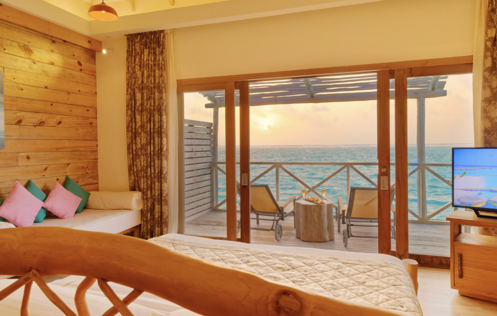 Вилла на воде, с террасой, прямым спуском в воду. В комплектации спальня с двуспальной кроватью, зона отдыха, рабочий стол, беспроводной Интернет, кондиционер, телевизор, сейф, телефон, мини-бар, винный холодильник, набор для приготовления чая и кофе. Ванная комната с тропическим душем, туалетными принадлежностями, феном.