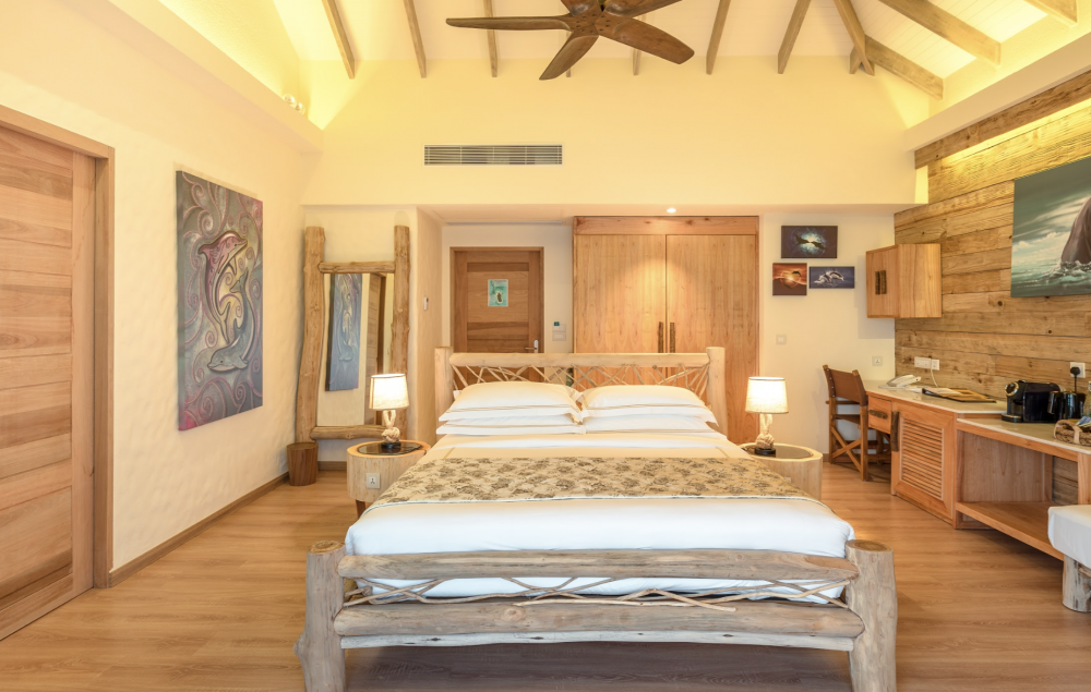 Номер оформлен в деревенском стиле, есть терраса, вид на лагуну, на закат. Для размещения предлагается двуспальная кровать, предусмотрена зона отдыха, тропический душ. Среди удобств телевизор, кондиционер, телефон, сейф, мини-бар, винный холодильник, чайно-кофейные принадлежности, беспроводной Интернет, потолочный вентилятор, фен.