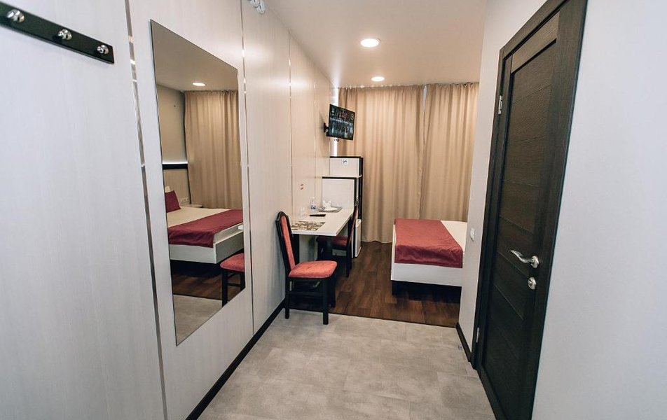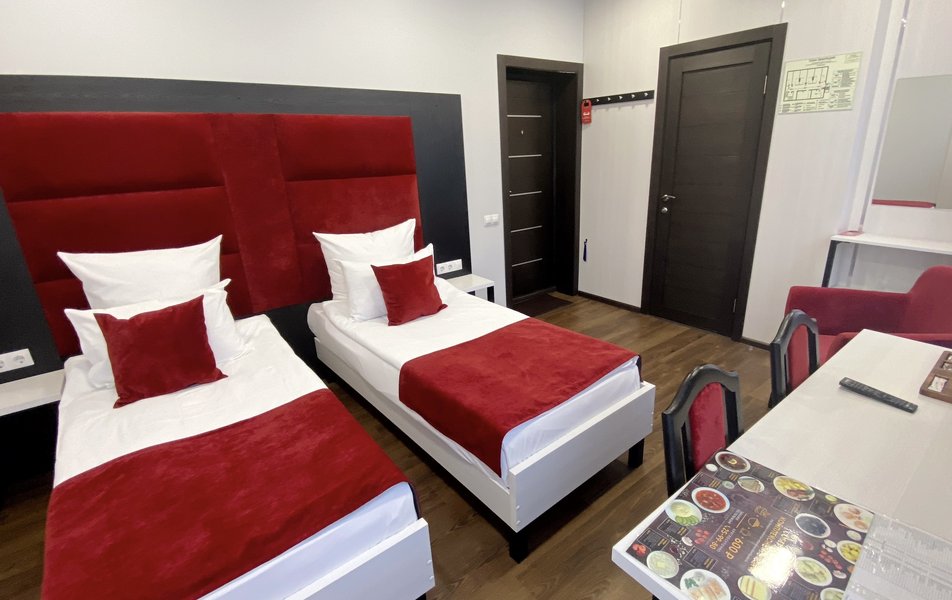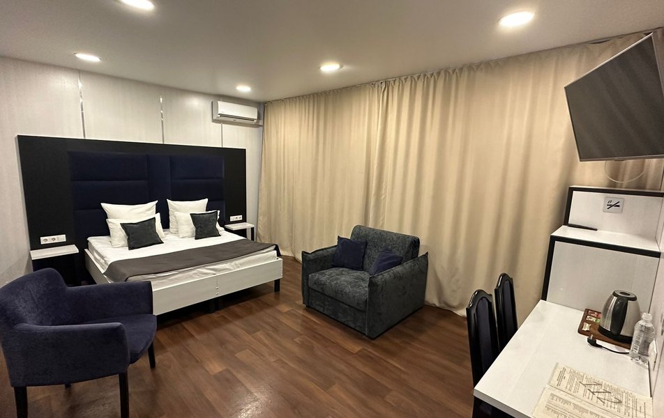 Комфорт 3-местный 1-комнатный Количество комнат: 1-комнатный Тип номера: Комфорт Кол-во основных мест: 3 Площадь (кв. м): 18 Мебель: вешалка, зеркало, кресло, кресло-кровать, кровати односпальные /одна двуспальная кровать, прикроватные столики, стол, стулья, шкаф Оборудование: кондиционер, мини-холодильник, набор посуды, телевизор ЖК Санузел: с душем, туалетные принадлежности, фен Сервис: Wi-Fi бесплатно, смена полотенец, смена постельного белья, уборка номера