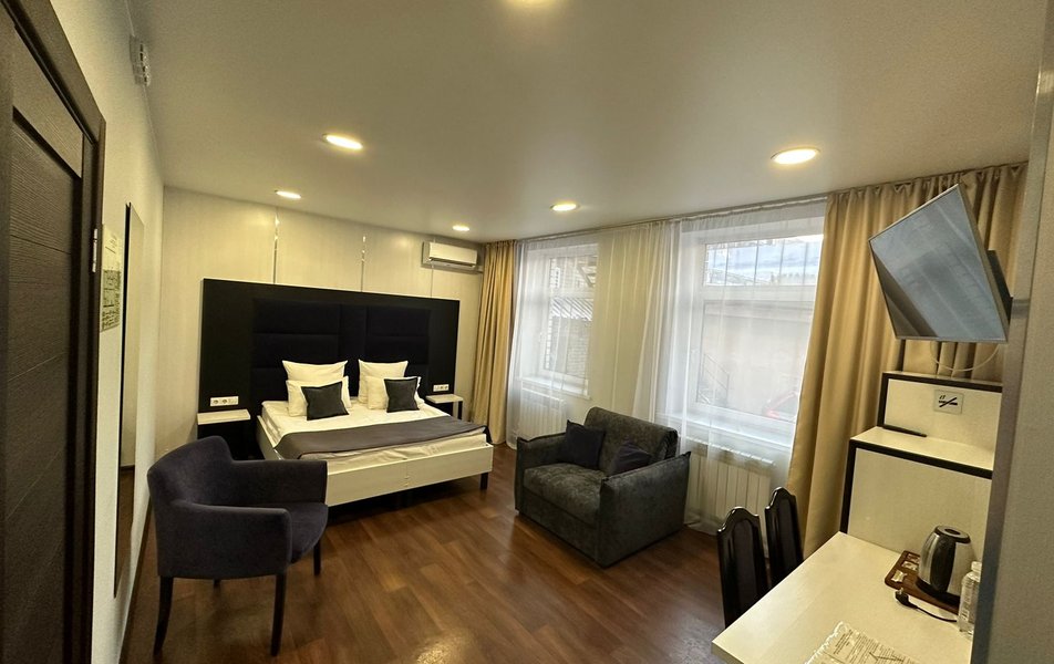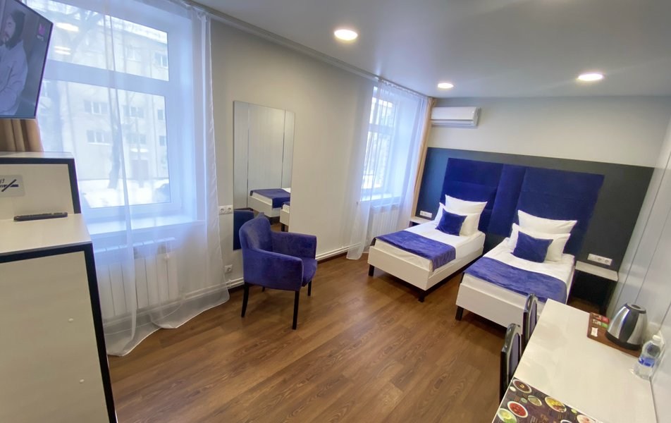 Комфорт 2-местный 1-комнатный Количество комнат: 1-комнатный Тип номера: Комфорт Кол-во основных мест: 2 Площадь (кв. м): 20 Мебель: вешалка, зеркало, кресло, кровати односпальные /одна двуспальная кровать, прикроватные тумбочки, стол, стулья, шкаф Оборудование: кондиционер, мини-холодильник, набор посуды, телевизор ЖК Санузел: с душем, туалетные принадлежности, фен Сервис: Wi-Fi бесплатно, смена полотенец, смена постельного белья, уборка номера