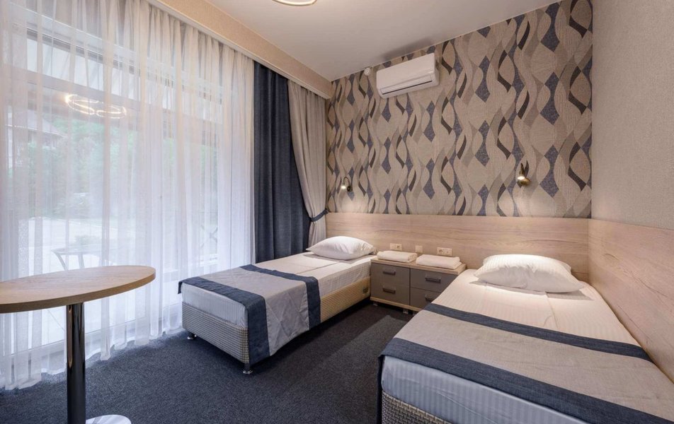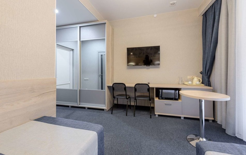 Комфорт 2-местный 1-комнатный Количество комнат: 1-комнатный Тип номера: Комфорт Кол-во основных мест: 2 Мебель: вешалка, зеркало, кровати односпальные, прикроватные тумбочки, стол, стулья, шкаф Оборудование: кондиционер, микроволновая печь, телевизор, чайный набор посуды, электрочайник Санузел: с душем, туалетные принадлежности, фен Сервис: Wi-Fi бесплатно, смена полотенец, смена постельного белья, уборка номера