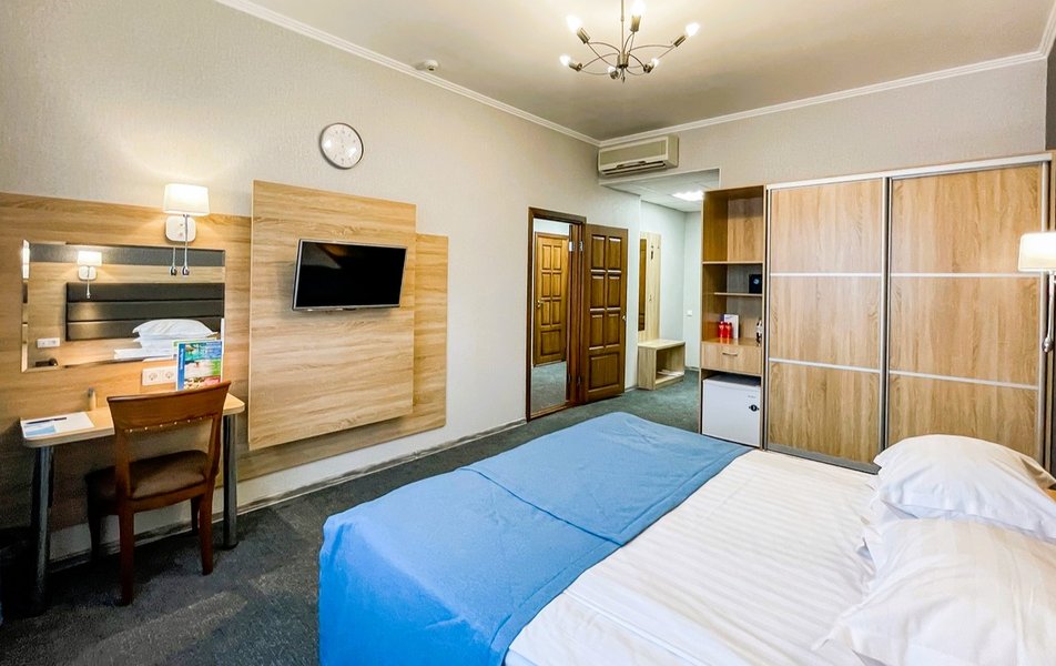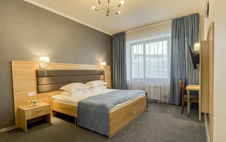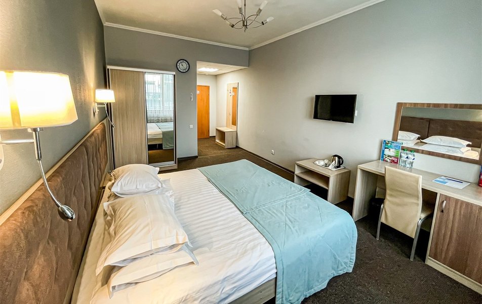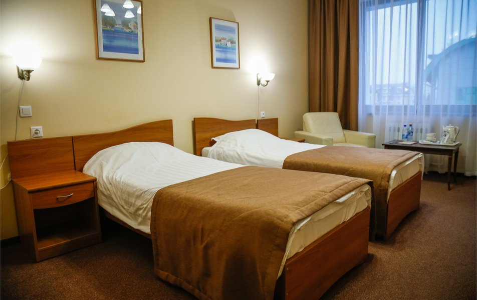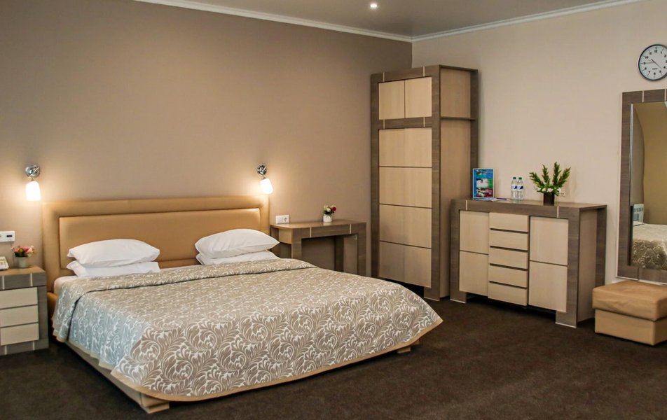 Приехали по короткой трех дневной программе В цену проживание включается еще несколько процедур. А также трех разовое питание (шведский стол) ️ Номера чистые На кроватях хорошие матрасы ️ Персонал приветливый В гостинице присутствует детская игровая комната с няней Взрослая игровая с настольным теннисом и бильярдом На первом этаже есть ресторан (была даже живая музыка) Тренажерный зал! ️️ А главное!!! Для всех гостей хоть на весь день доступен Аква Парк с разнообразными саунами и джакузи!! Вообщем можно не покидать территории гостиницы и получать все необходимое! Рекомендую