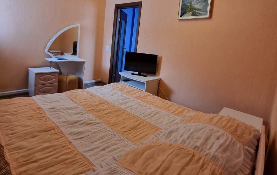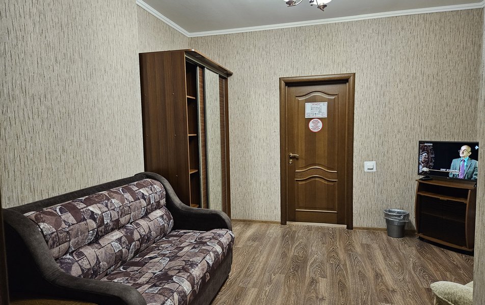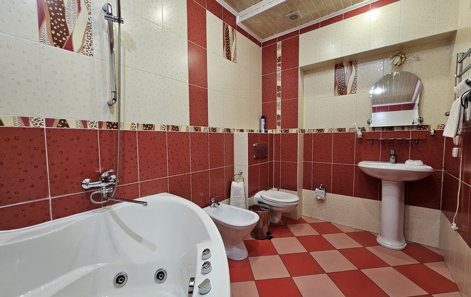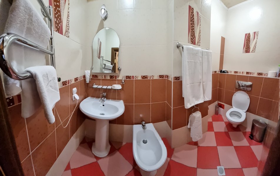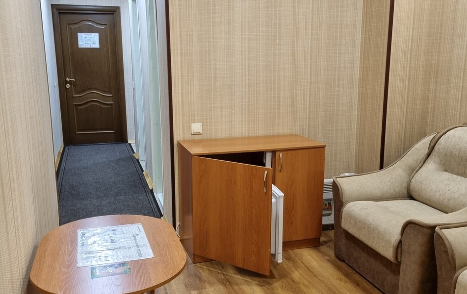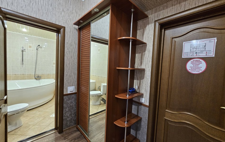 Люкс 2-местный 2-комнатный (№207) Количество комнат: 2-комнатный Тип номера: Люкс Дополнительное место: диван Кол-во доп. мест: 2 Кол-во основных мест: 2 Площадь (кв. м): 38 Мебель: диван раскладной, кресла, кровать двуспальная, прикроватные тумбочки, стол, стул, шкаф Оборудование: набор посуды, телевизор, телефон, холодильник, электрочайник Санузел: 2 санузла, с ванной, тапочки, туалетные принадлежности, халат Сервис: Wi-Fi бесплатно, смена полотенец, смена постельного белья, уборка номера, услуги внутренней телефонной связи