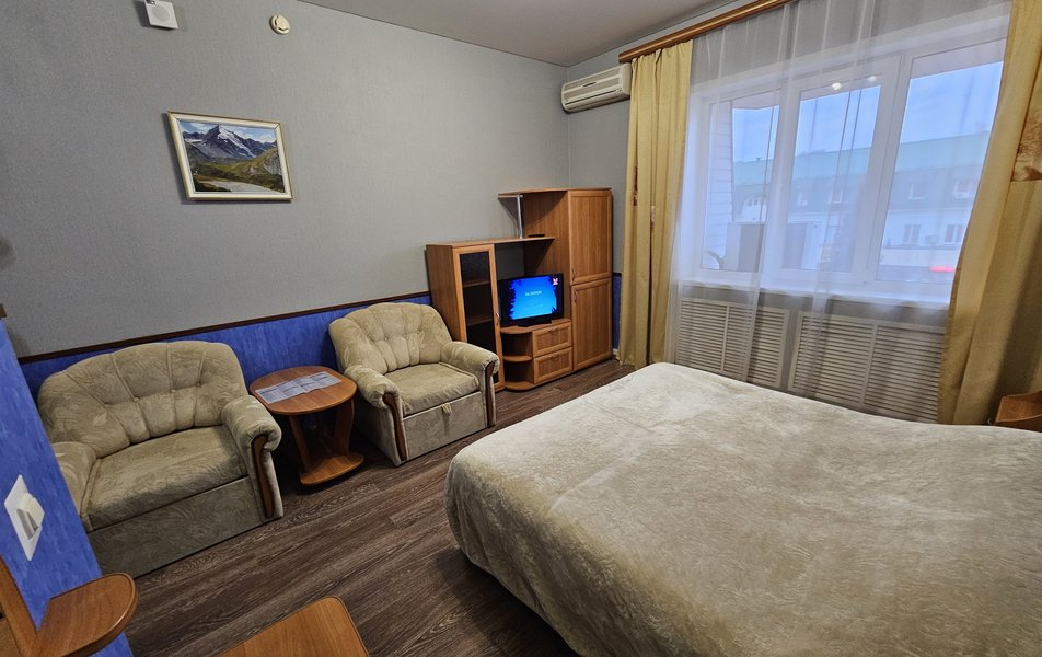 Люкс 2-местный 2-комнатный (№202) Количество комнат: 2-комнатный Тип номера: Люкс Дополнительное место: диван Кол-во доп. мест: 2 Кол-во основных мест: 2 Площадь (кв. м): 45 Мебель: диван раскладной, кресла, кровать двуспальная, стол, стул, шкаф Оборудование: набор посуды, телевизор, телефон, холодильник, электрочайник Санузел: 2 санузла, с душевой кабиной, тапочки, туалетные принадлежности, халат Сервис: Wi-Fi бесплатно, смена полотенец, смена постельного белья, уборка номера, услуги внутренней телефонной связи