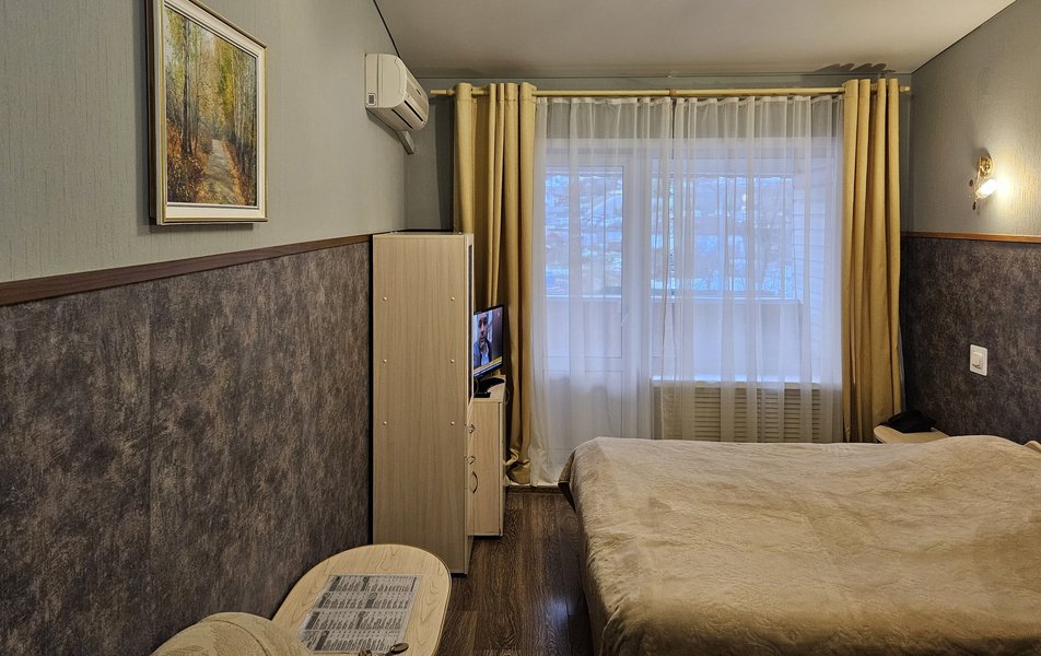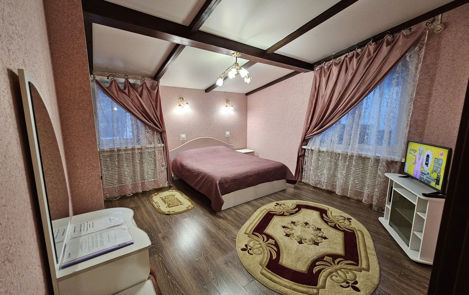 Люкс 2-местный 2-комнатный (№302) Количество комнат: 2-комнатный Тип номера: Люкс Дополнительное место: диван Кол-во доп. мест: 2 Кол-во основных мест: 2 Площадь (кв. м): 45 Мебель: диван раскладной, кресла, кровать двуспальная, прикроватные тумбочки, стол, стул, шкаф Оборудование: набор посуды, телевизор, телефон, холодильник, электрочайник Санузел: 2 санузла, с ванной, тапочки, туалетные принадлежности, халат Сервис: Wi-Fi бесплатно, смена полотенец, смена постельного белья, уборка номера, услуги внутренней телефонной связи