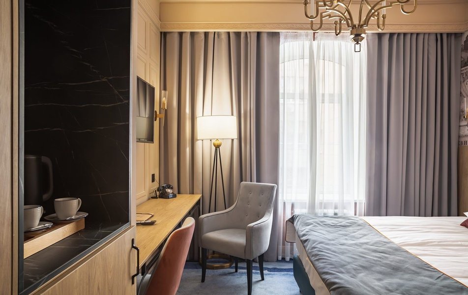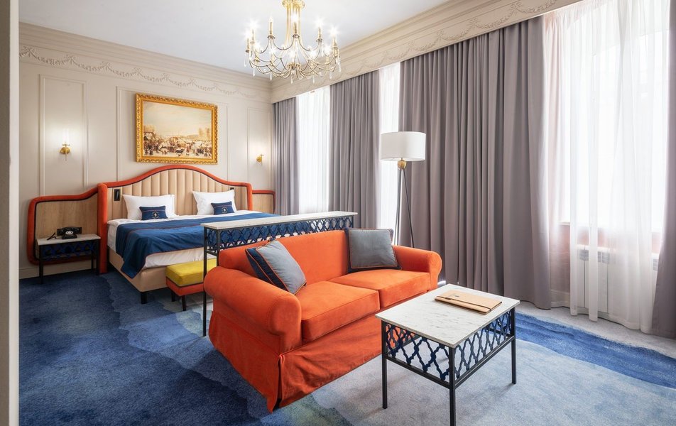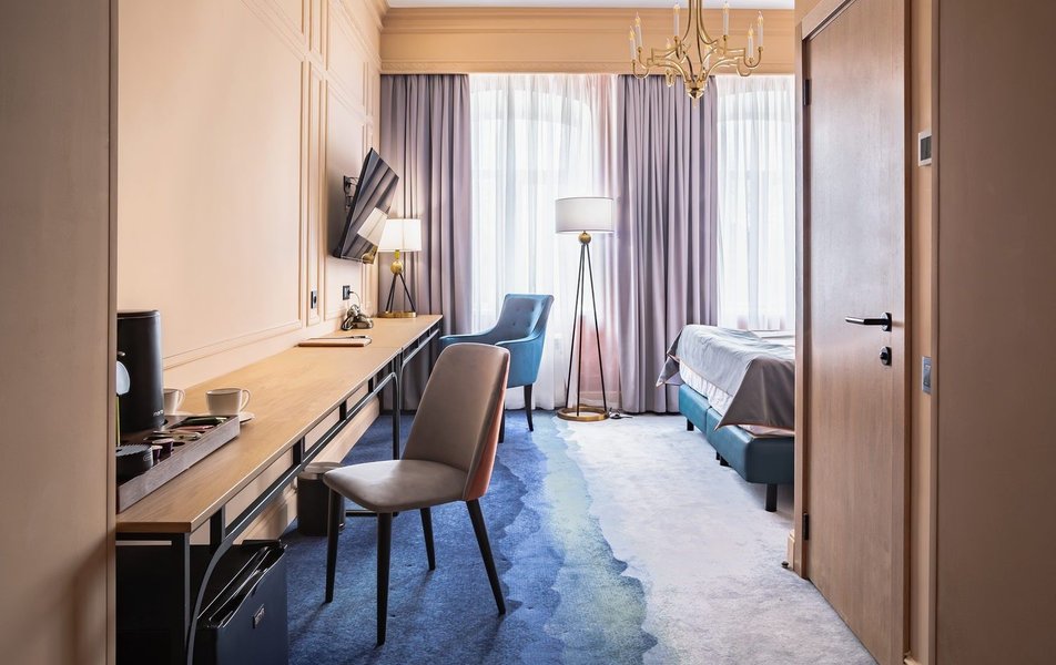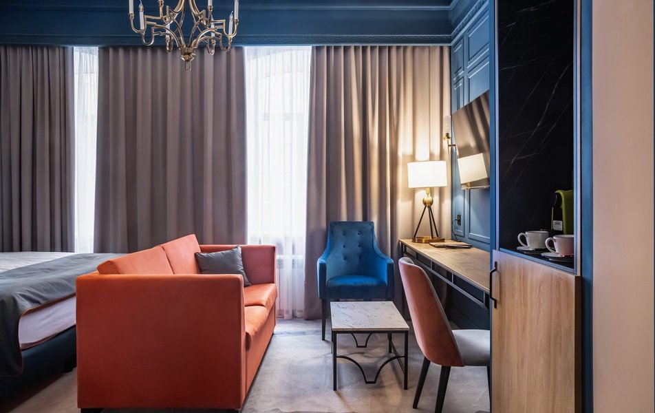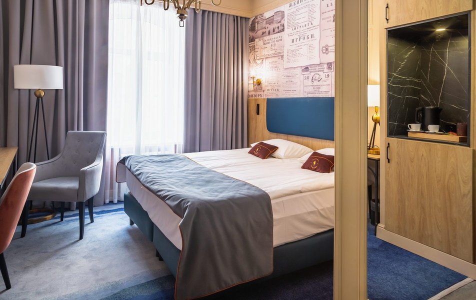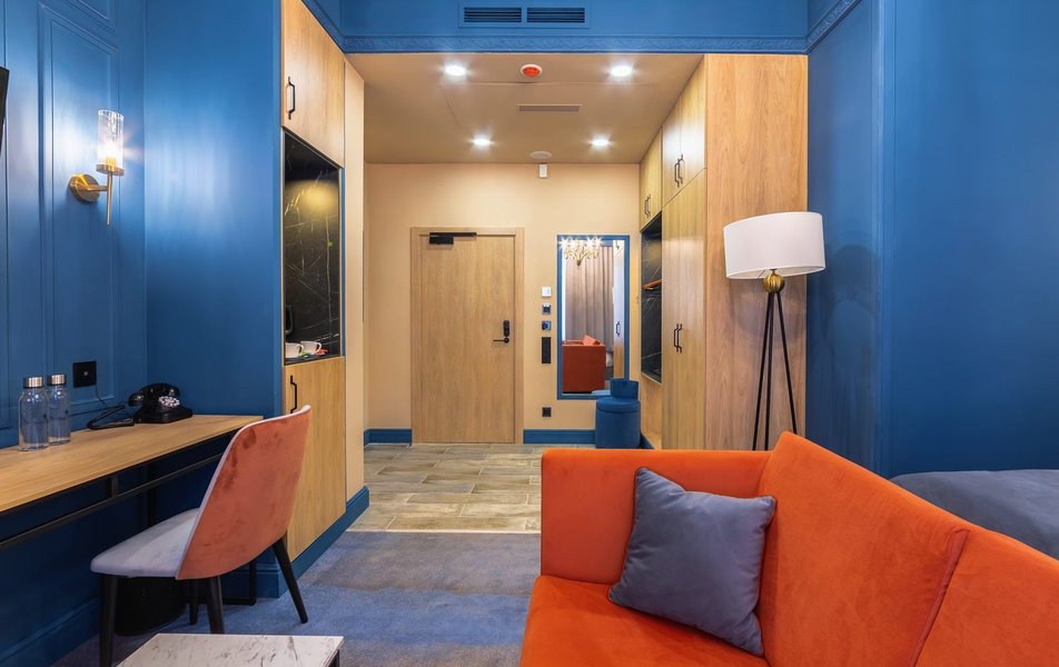 Полулюкс 2-местный (DBL/TWIN) Количество комнат: 1-комнатный Тип номера: Полулюкс Кол-во доп. мест: 1 Кол-во основных мест: 2 Площадь (кв. м): 27 Мебель: вешалка, диван, зеркало, кровати односпальные /одна двуспальная кровать, прикроватные тумбочки, стол, стулья, шкаф Оборудование: гладильная доска, кофемашина, мини-холодильник, сейф, система общего кондиционирования, телевизор, телефон, утюг, чайный набор посуды, электрочайник Санузел: с душем, тапочки, туалетные принадлежности, фен, халат Сервис: Wi-Fi бесплатно, карточная система замков, мини-бар, смена полотенец, смена постельного белья, уборка номера, услуги внутренней телефонной связи