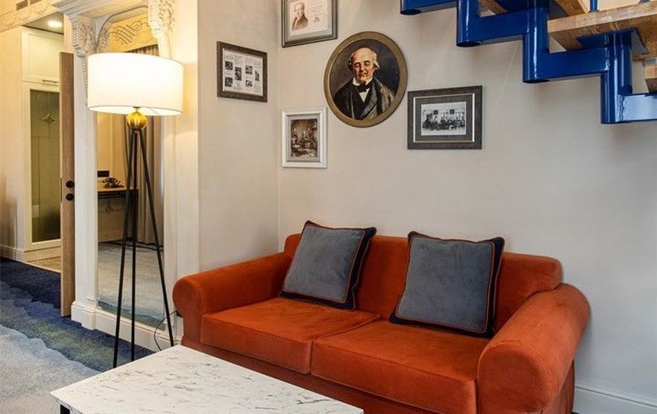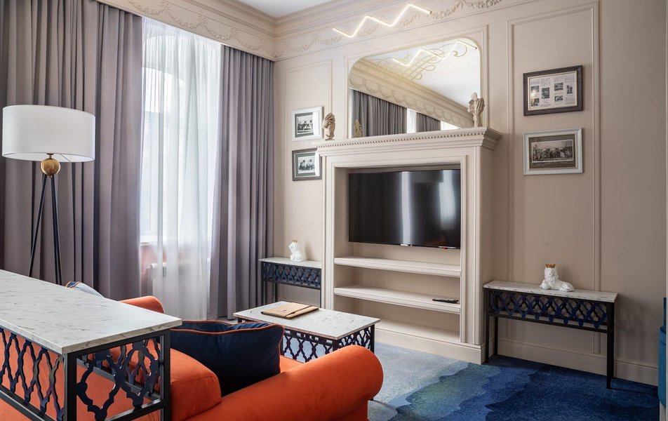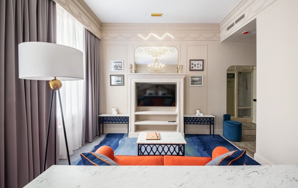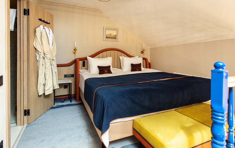 Люкс 2-местный 2-комнатный 2-уровневый Количество комнат: 2-комнатный Тип номера: Люкс Кол-во доп. мест: 1 Кол-во основных мест: 2 Площадь (кв. м): 47 Мебель: вешалка, диван, зеркало, кровать двуспальная, прикроватные тумбочки, стол, стулья, шкаф Оборудование: гладильная доска, кофемашина, мини-холодильник, сейф, система общего кондиционирования, телевизор, телефон, утюг, чайный набор посуды Санузел: с душем, тапочки, туалетные принадлежности, фен, халат Сервис: Wi-Fi бесплатно, карточная система замков, мини-бар, смена полотенец, смена постельного белья, уборка номера, услуги внутренней телефонной связи