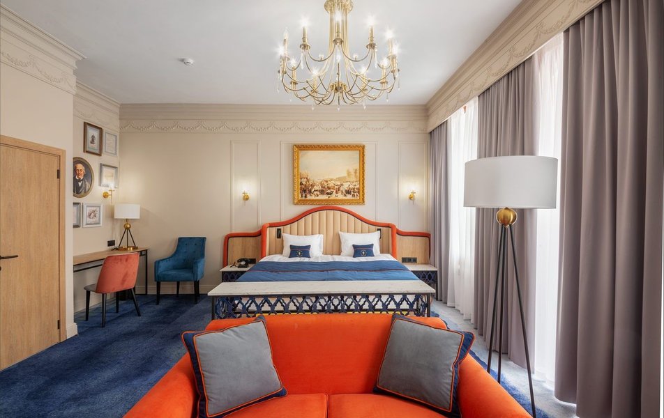 Люкс 2-местный (DBL) Количество комнат: 1-комнатный Тип номера: Люкс Кол-во доп. мест: 1 Кол-во основных мест: 2 Площадь (кв. м): 43 Мебель: вешалка, диван, зеркало, кровать двуспальная, прикроватные тумбочки, стол, стулья, шкаф Оборудование: гладильная доска, кофемашина, мини-холодильник, сейф, система общего кондиционирования, телевизор, телефон, утюг, чайная станция Санузел: с ванной/душем, тапочки, туалетные принадлежности, фен, халат Сервис: Wi-Fi бесплатно, карточная система замков, мини-бар, смена полотенец, смена постельного белья, уборка номера, услуги внутренней телефонной связи