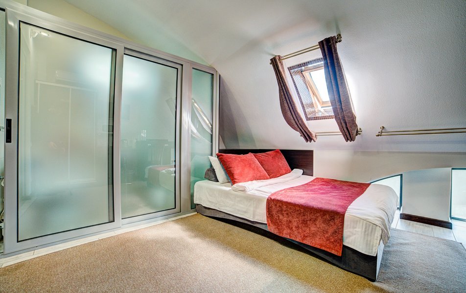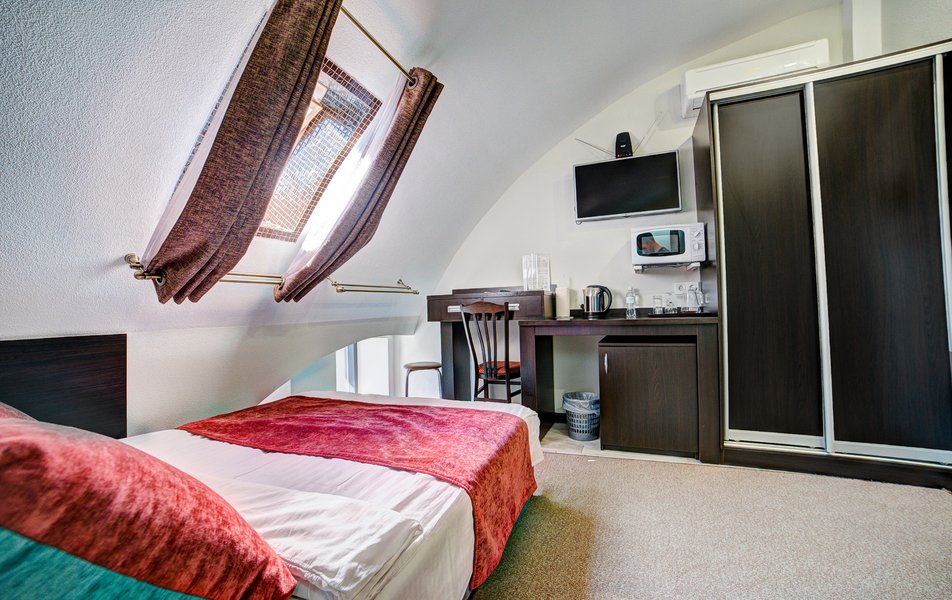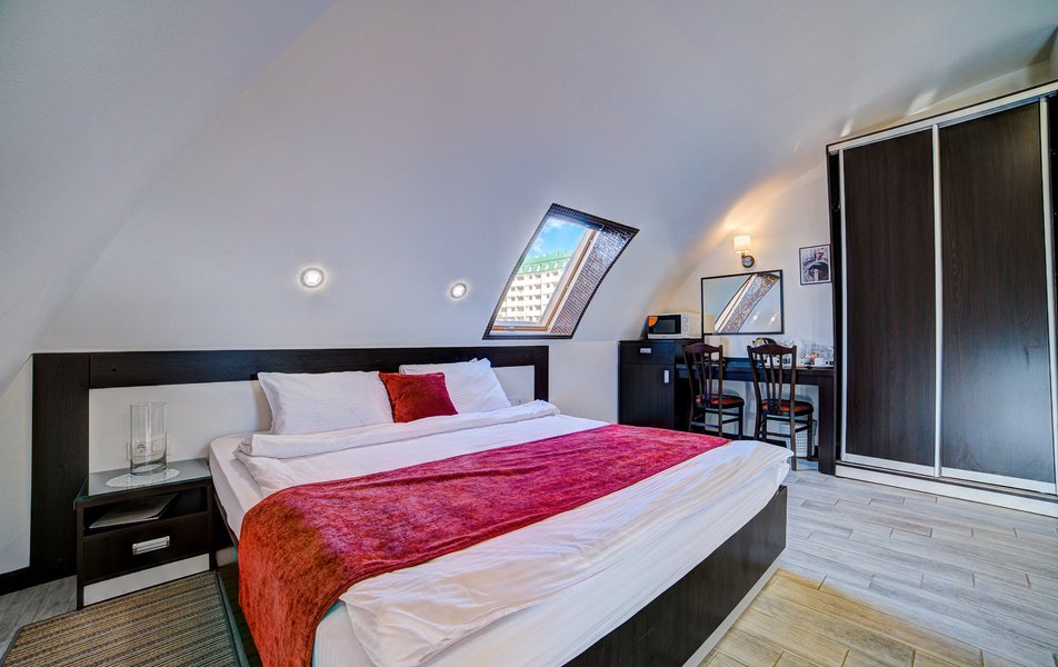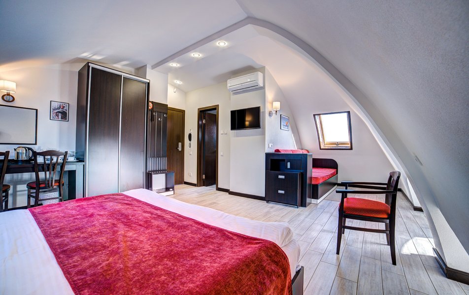 Стандартный Мансарда 2-местный 1-комнатный Количество комнат: 1-комнатный Тип номера: Стандартный Вид из номера: на парк: и город Кол-во номеров: 1 Кол-во основных мест: 3 Площадь (кв. м): 29 Мебель: вешалка, зеркало, кресло-кровать, кровать двуспальная, прикроватные тумбочки, стол, стул, шкаф-купе Оборудование: кондиционер, микроволновая печь, мини-холодильник, набор посуды, пляжные полотенца, сейф, телевизор ЖК, электрочайник Санузел: с душевой кабиной, тапочки, туалетные принадлежности, фен Сервис: Wi-Fi бесплатно, смена полотенец: раз в три дня, смена постельного белья: раз в три дня, уборка номера: ежедневно, услуги внутренней телефонной связи