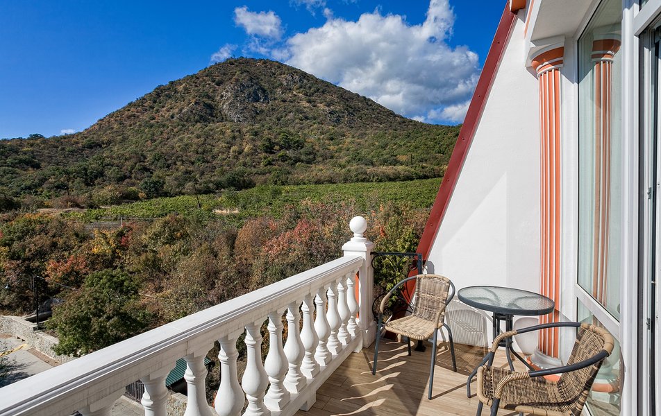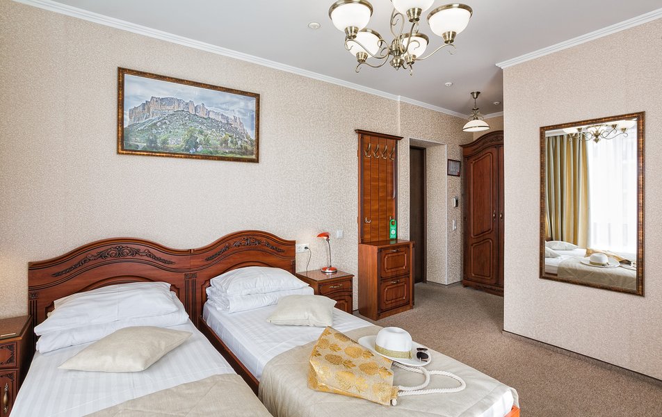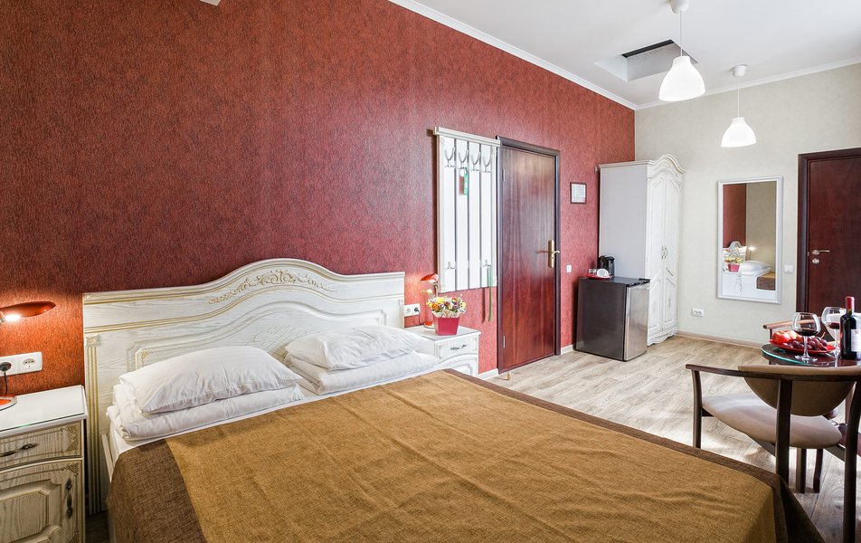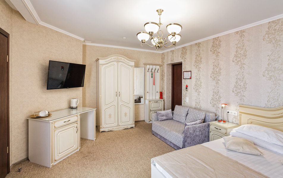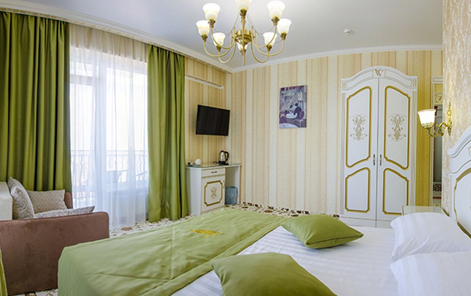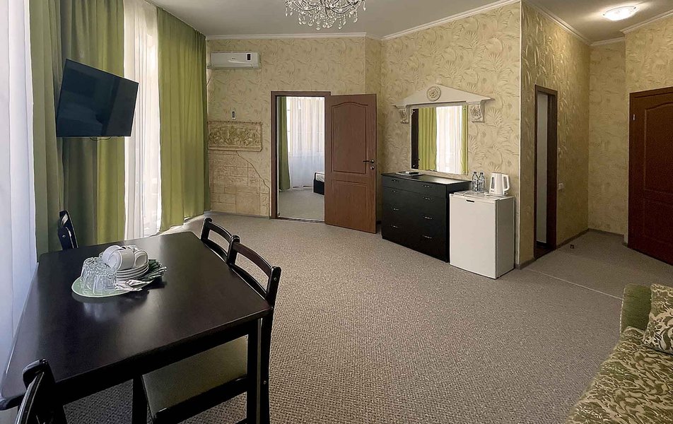 Делюкс 2-местный 1-комнатный (с балконом, корпус 4) Количество комнат: 1-комнатный Дополнительное место: диван-кровать Вид из номера: на двор Кол-во доп. мест: 2 Кол-во основных мест: 2 Корпус: 4 Площадь (кв. м): 35 Балкон: с мебелью Мебель: зеркало, кровать двуспальная, прикроватные тумбочки, стол, стулья, шкаф Оборудование: гладильная доска, кондиционер, телевизор ЖК, утюг, холодильник, чайный набор посуды, электрочайник Санузел: с душевой кабиной, тапочки, туалетные принадлежности, фен Сервис: Wi-Fi бесплатно, смена полотенец: 1 раз в 3 дня, смена постельного белья: 1 раз в 3 дня, уборка номера: ежедневно
