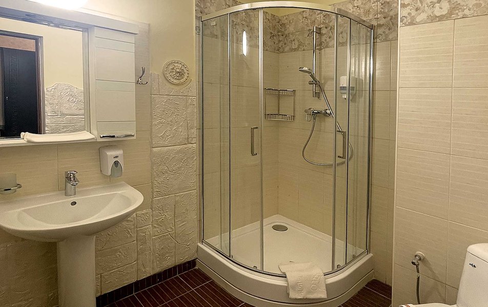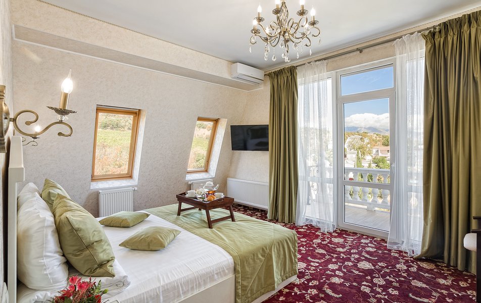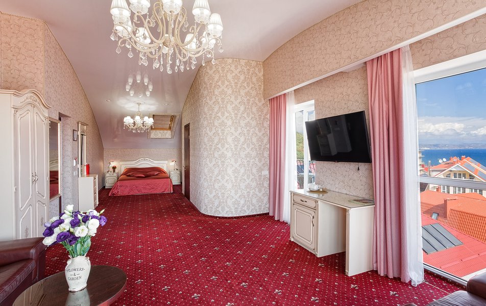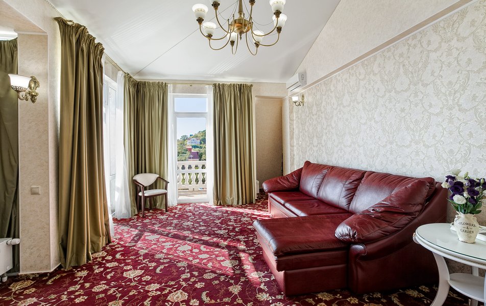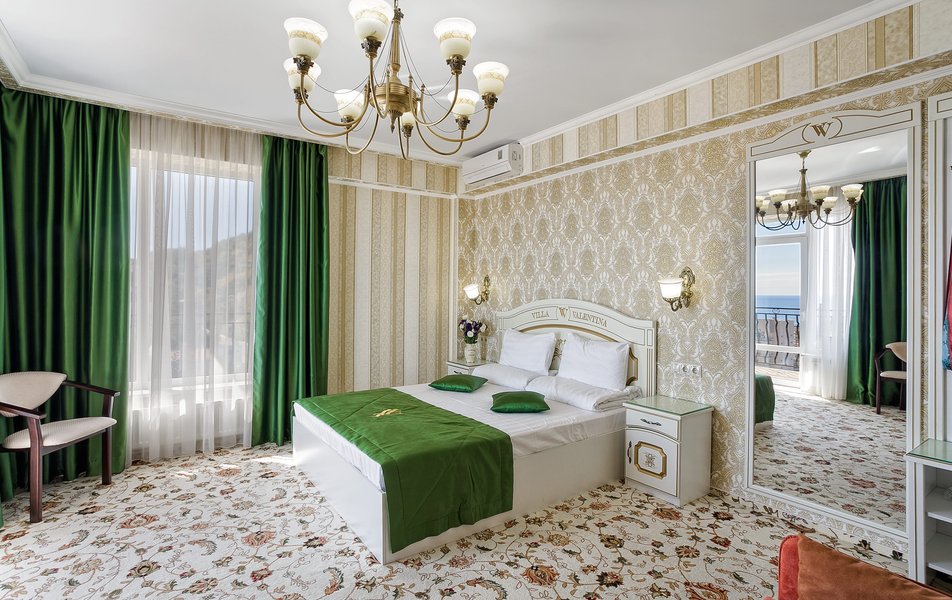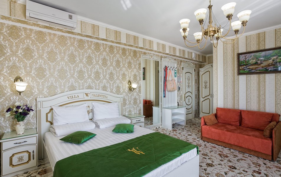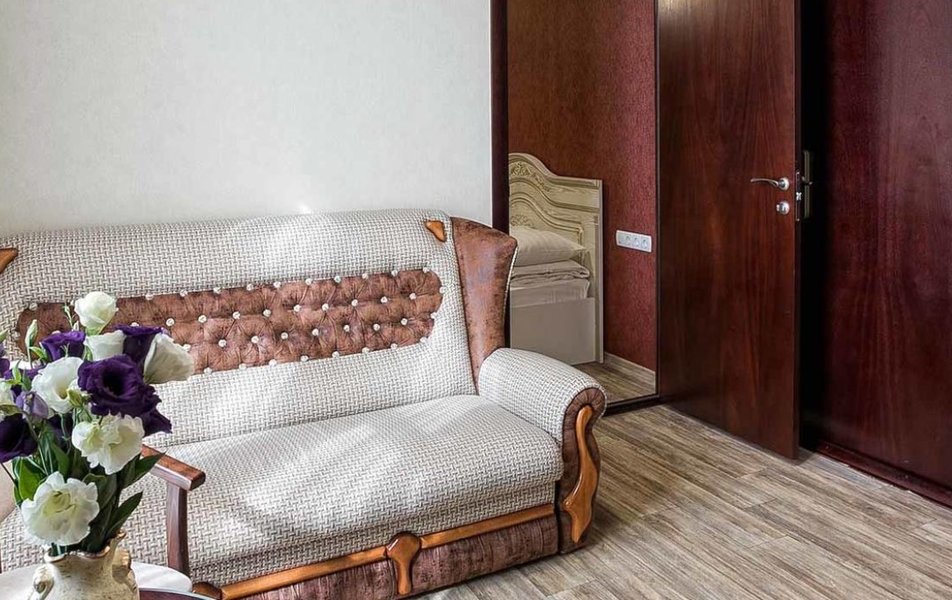 Делюкс 2-местный 1-комнатный (с балконом, корпус 4) Количество комнат: 1-комнатный Дополнительное место: диван-кровать Вид из номера: на двор Кол-во доп. мест: 2 Кол-во основных мест: 2 Корпус: 4 Площадь (кв. м): 35 Балкон: с мебелью Мебель: зеркало, кровать двуспальная, прикроватные тумбочки, стол, стулья, шкаф Оборудование: гладильная доска, кондиционер, телевизор ЖК, утюг, холодильник, чайный набор посуды, электрочайник Санузел: с душевой кабиной, тапочки, туалетные принадлежности, фен Сервис: Wi-Fi бесплатно, смена полотенец: 1 раз в 3 дня, смена постельного белья: 1 раз в 3 дня, уборка номера: ежедневно