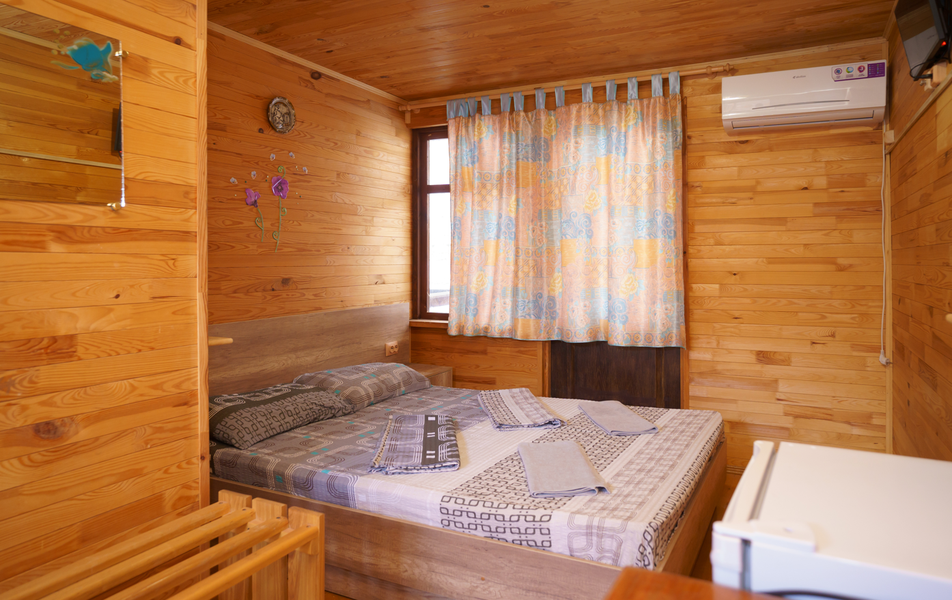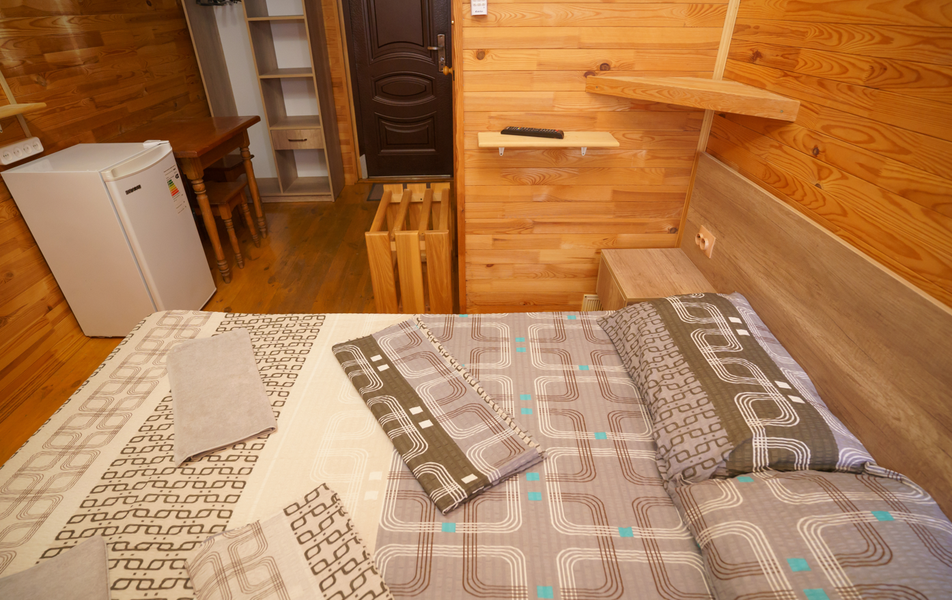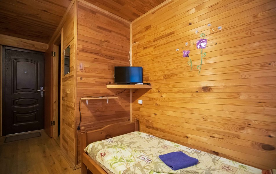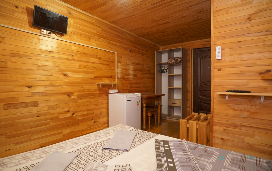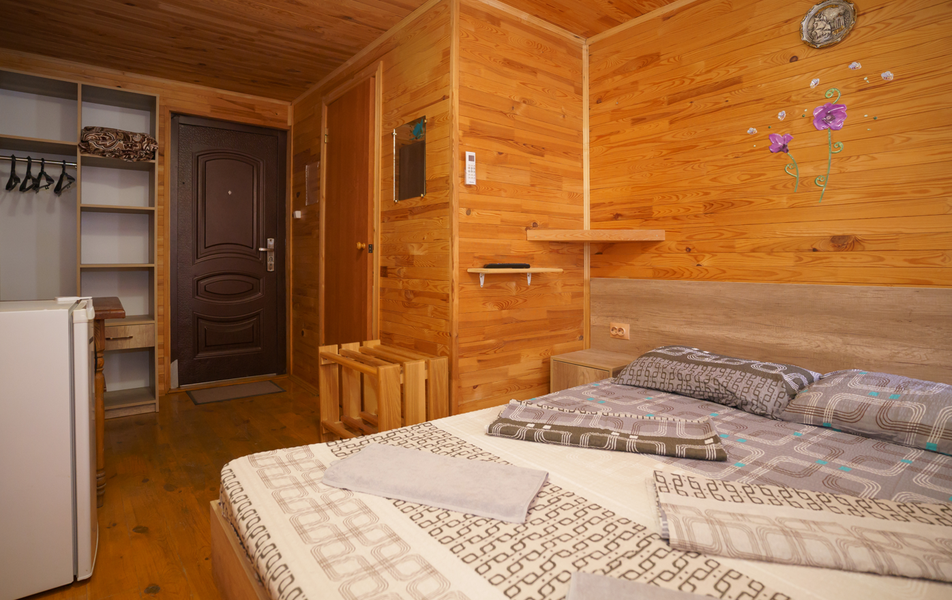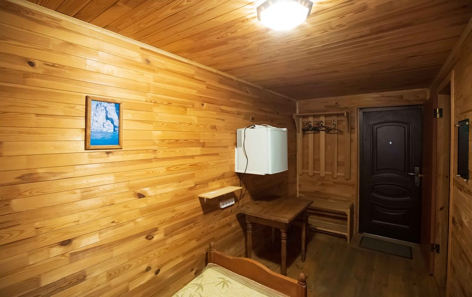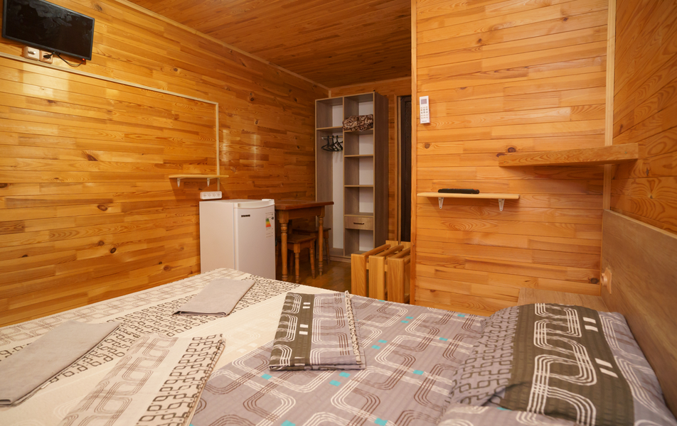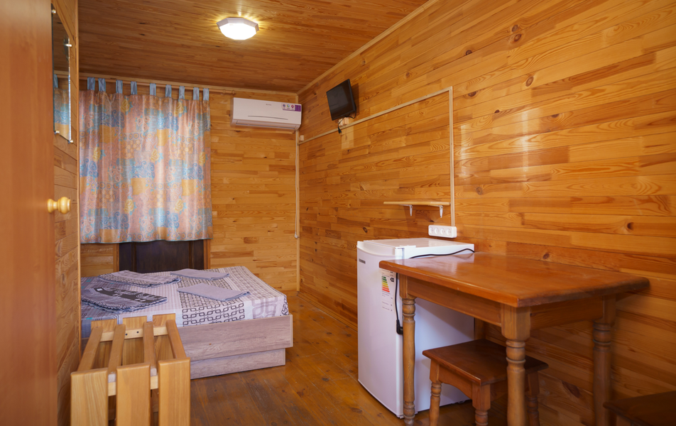 Стандартный 2-местный 1-комнатный (с балконом в срубе) Количество комнат: 1-комнатный Тип номера: Стандартный Вид из номера: на горы Кол-во номеров: 12 Кол-во основных мест: 2 Корпус: сруб Площадь (кв. м): 14 Балкон: с сушилкой Мебель: вешалка, зеркало, кровати односпальные, прикроватные тумбочки, стол, шкаф Оборудование: кондиционер, телевизор, холодильник Санузел: с душем, туалетные принадлежности Сервис: Wi-Fi бесплатно, смена полотенец, смена постельного белья, уборка номера