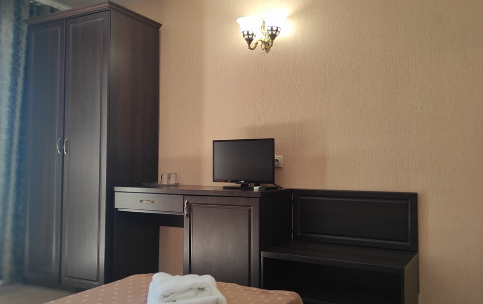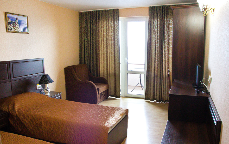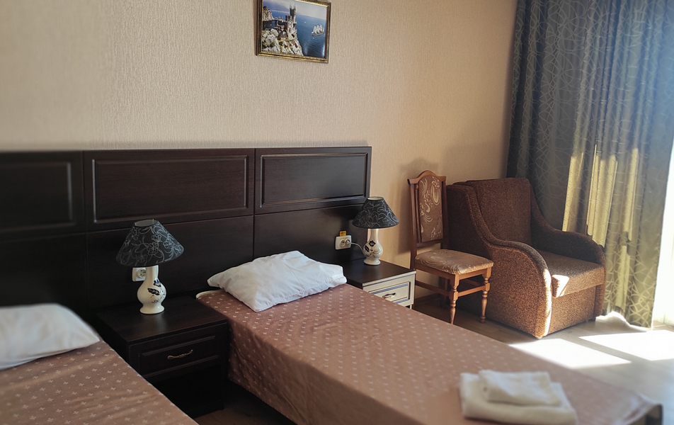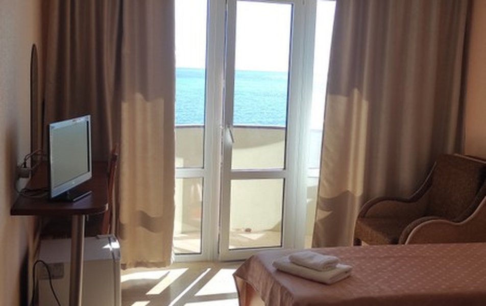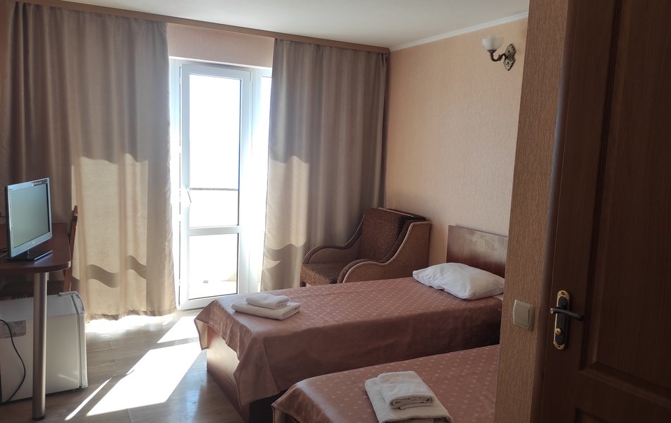 Стандартный 2-местный 1-комнатный (категория В) Количество комнат: 1-комнатный Тип номера: Стандартный Дополнительное место: кресло-кровать, еврораскладушка Вид из номера: на море Кол-во доп. мест: 2 Кол-во номеров: 6 Кол-во основных мест: 2 Площадь (кв. м): 17 Мебель: вешалка, зеркало, кровати односпальные: 2, прикроватные тумбочки, шкаф Оборудование: кондиционер, сейф, телевизор, холодильник Санузел: с душем, фен Сервис: Wi-Fi бесплатно, смена полотенец, смена постельного белья, уборка номера