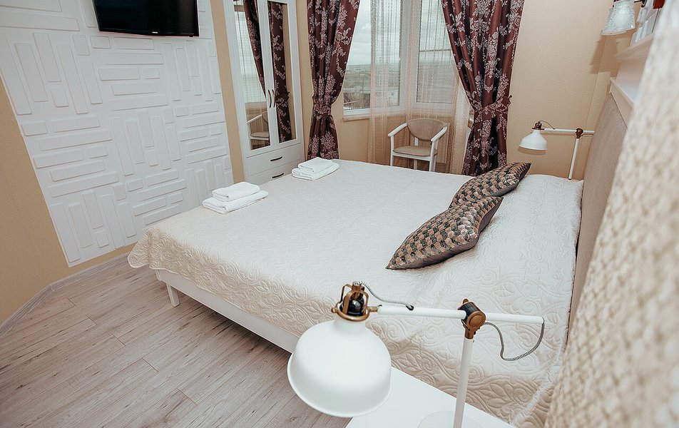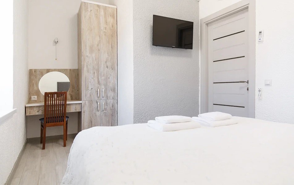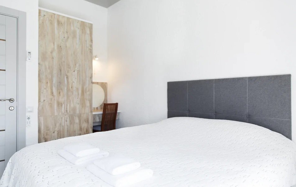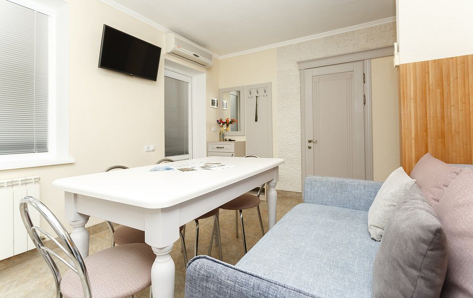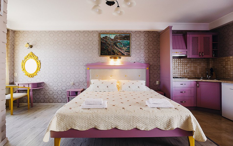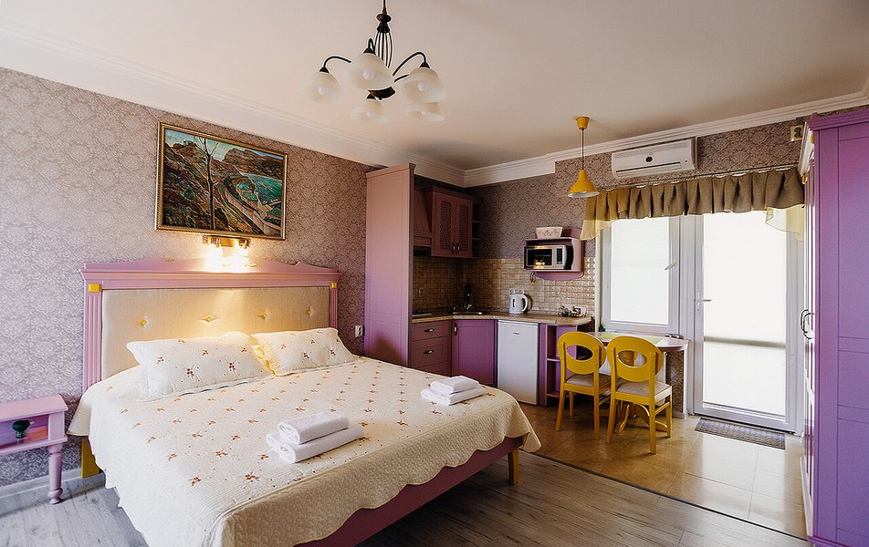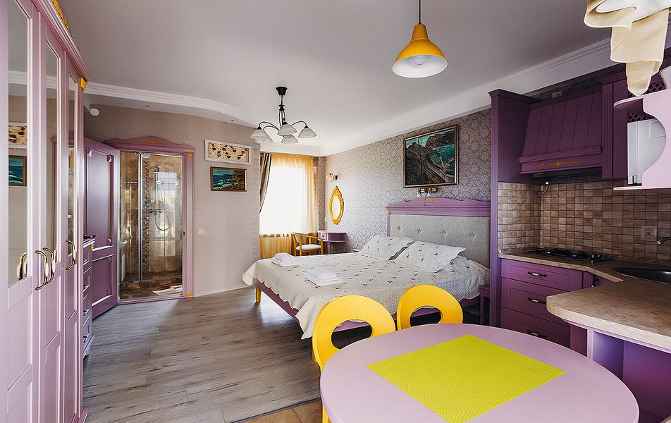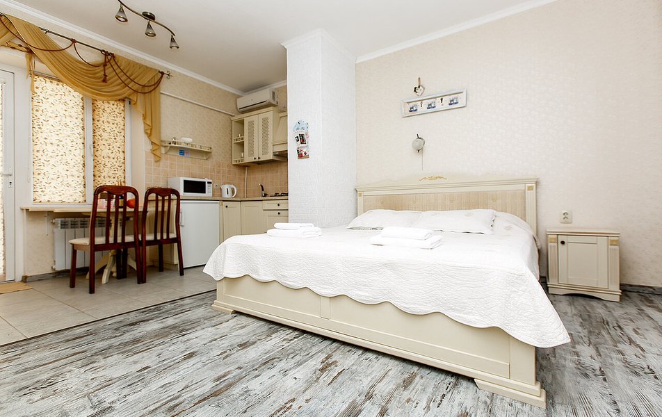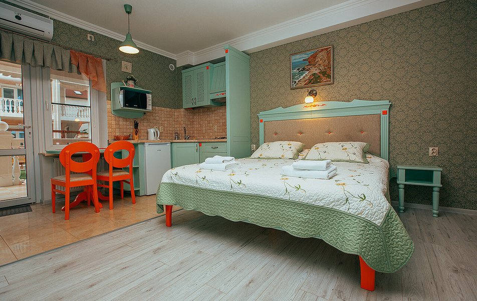 Апартаменты Делюкс 2-местный 1-комнатный Количество комнат: 1-комнатный Тип номера: Апартаменты Дополнительное место: еврораскладушка Кол-во доп. мест: 1 Кол-во номеров: 4 Кол-во основных мест: 2 Площадь (кв. м): 24 Мебель: вешалка, зеркало, кровать двуспальная, кухонная мебель, прикроватные тумбочки, стол, стулья Оборудование: кондиционер, плита электрическая, телевизор, холодильник, электрочайник Санузел: с душевой кабиной, тапочки, туалетные принадлежности, фен Сервис: Wi-Fi бесплатно, смена полотенец, смена постельного белья, уборка номера