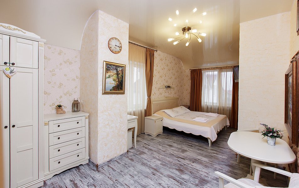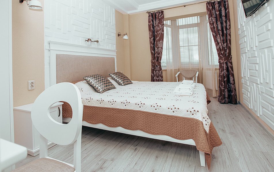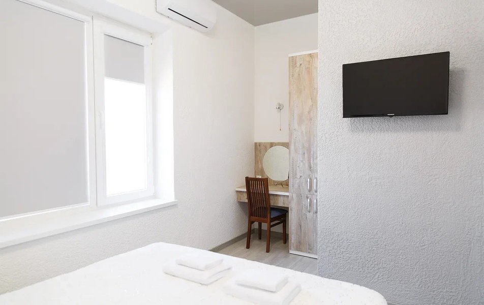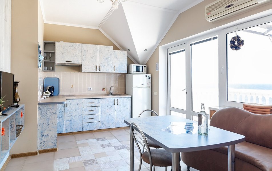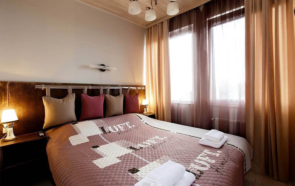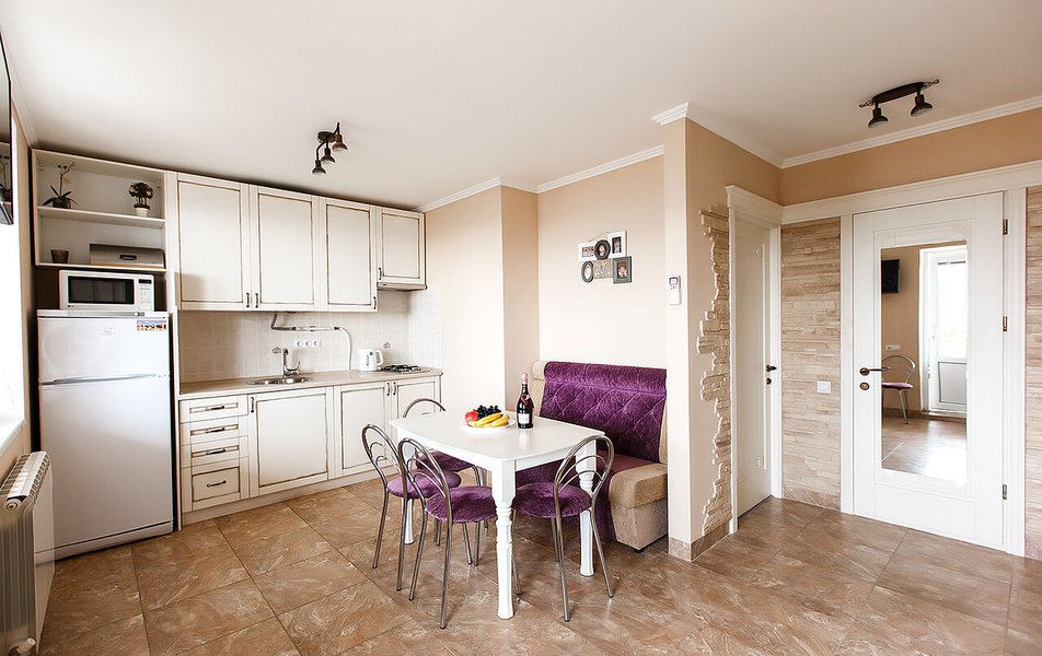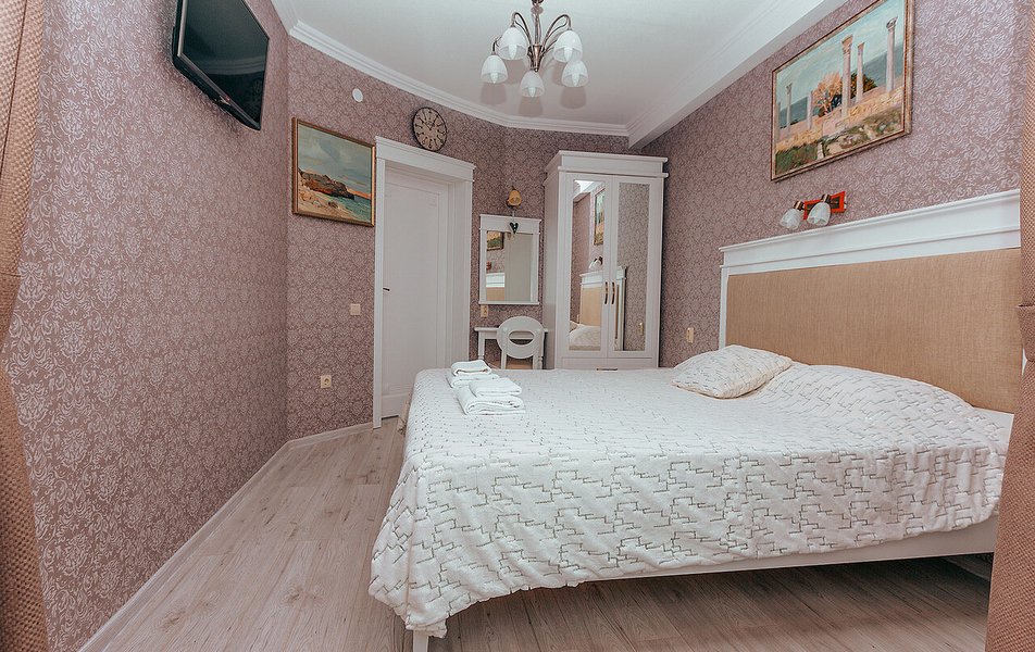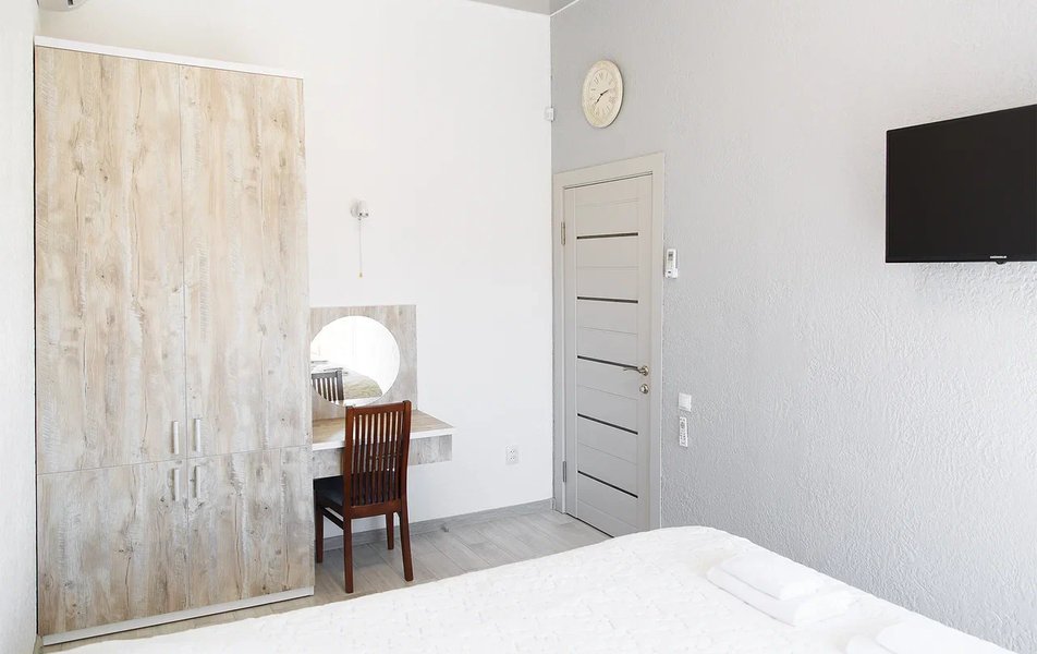 Апартаменты Делюкс 2-местный 1-комнатный Количество комнат: 1-комнатный Тип номера: Апартаменты Дополнительное место: еврораскладушка Кол-во доп. мест: 1 Кол-во номеров: 4 Кол-во основных мест: 2 Площадь (кв. м): 24 Мебель: вешалка, зеркало, кровать двуспальная, кухонная мебель, прикроватные тумбочки, стол, стулья Оборудование: кондиционер, плита электрическая, телевизор, холодильник, электрочайник Санузел: с душевой кабиной, тапочки, туалетные принадлежности, фен Сервис: Wi-Fi бесплатно, смена полотенец, смена постельного белья, уборка номера