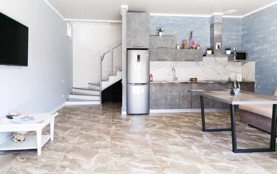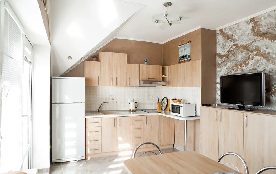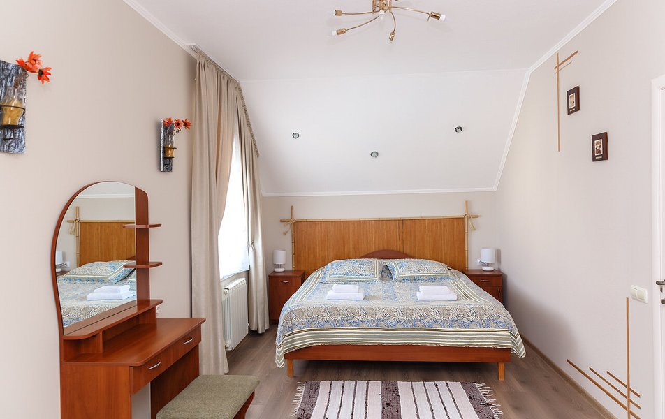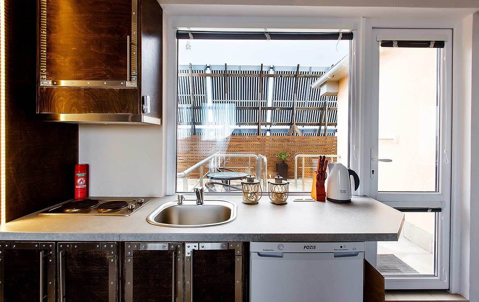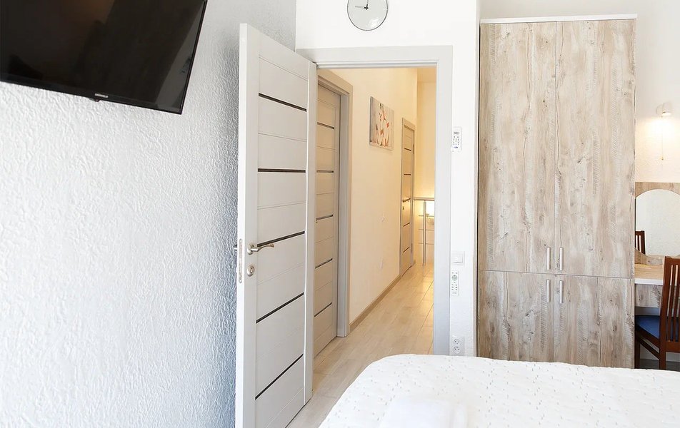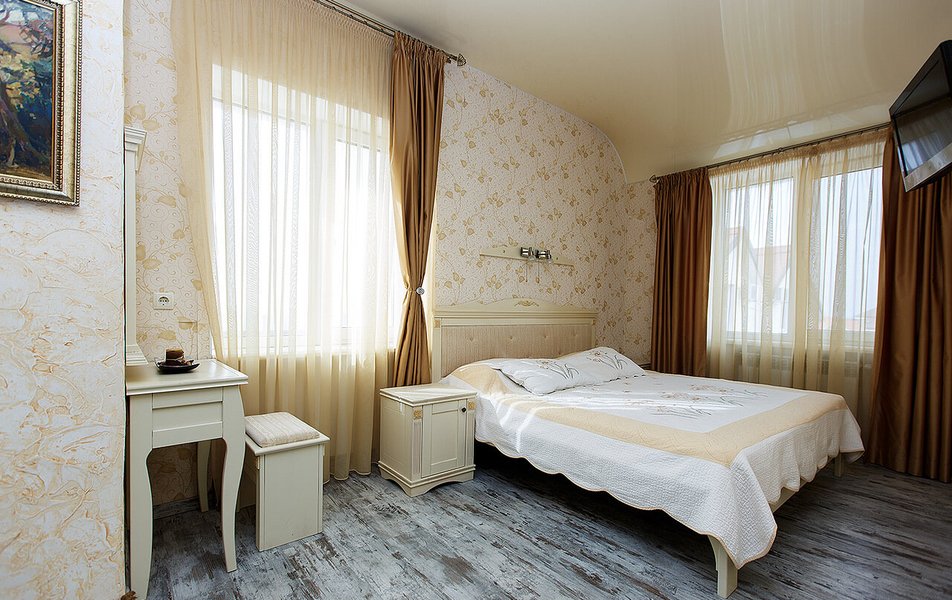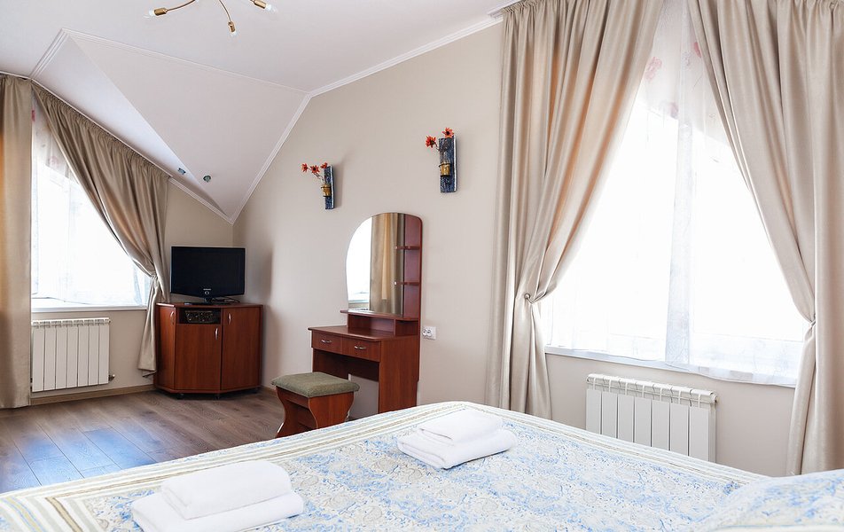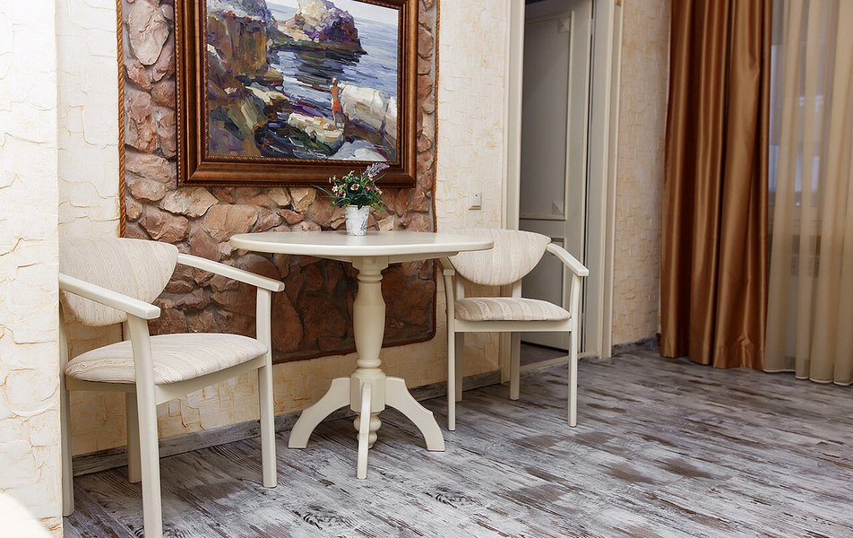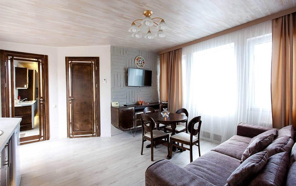Апартаменты Делюкс 2-местный 1-комнатный Количество комнат: 1-комнатный Тип номера: Апартаменты Дополнительное место: еврораскладушка Кол-во доп. мест: 1 Кол-во номеров: 4 Кол-во основных мест: 2 Площадь (кв. м): 24 Мебель: вешалка, зеркало, кровать двуспальная, кухонная мебель, прикроватные тумбочки, стол, стулья Оборудование: кондиционер, плита электрическая, телевизор, холодильник, электрочайник Санузел: с душевой кабиной, тапочки, туалетные принадлежности, фен Сервис: Wi-Fi бесплатно, смена полотенец, смена постельного белья, уборка номера