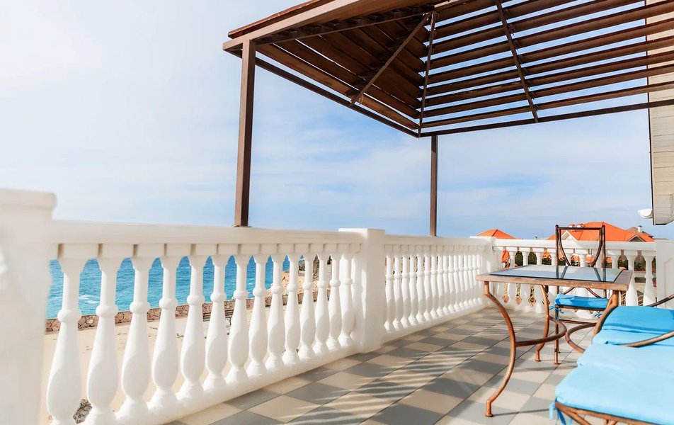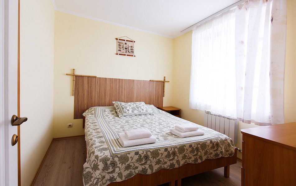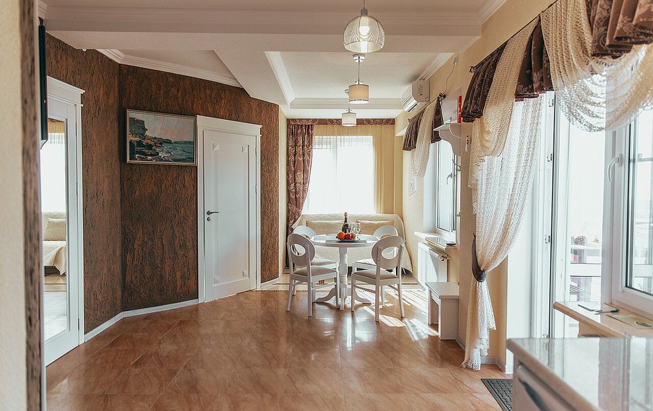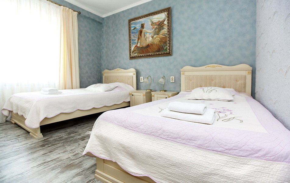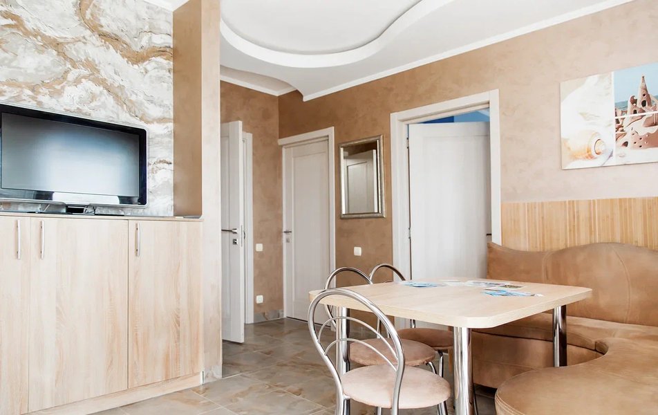 Апартаменты Люкс 4-местный 3-комнатный Количество комнат: 3-комнатный Тип номера: Апартаменты Дополнительное место: еврораскладушка Кол-во доп. мест: 1 Кол-во номеров: 4 Кол-во основных мест: 4 Площадь (кв. м): 65 Мебель: вешалка, зеркало, комод, кровати односпальные /одна двуспальная кровать, кровать двуспальная, прикроватные тумбочки, стол, стулья Оборудование: набор посуды, пляжные коврики, пляжные полотенца, сейф, сплит-система, телевизор ЖК, холодильник, электрочайник Санузел: с душевой кабиной, тапочки, туалетные принадлежности, фен Сервис: Wi-Fi бесплатно, смена полотенец, смена постельного белья, уборка номера Терраса: оборудована мебелью