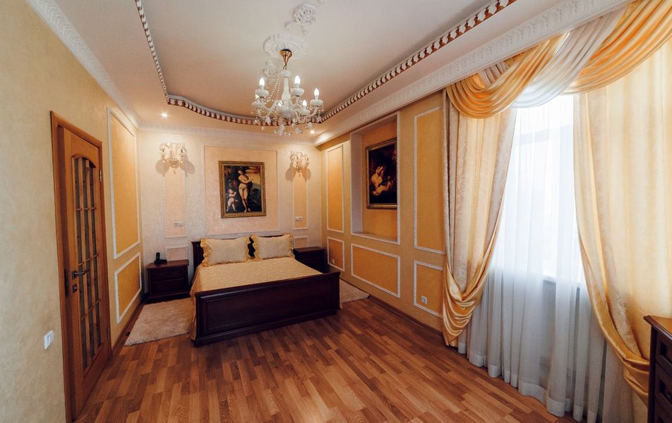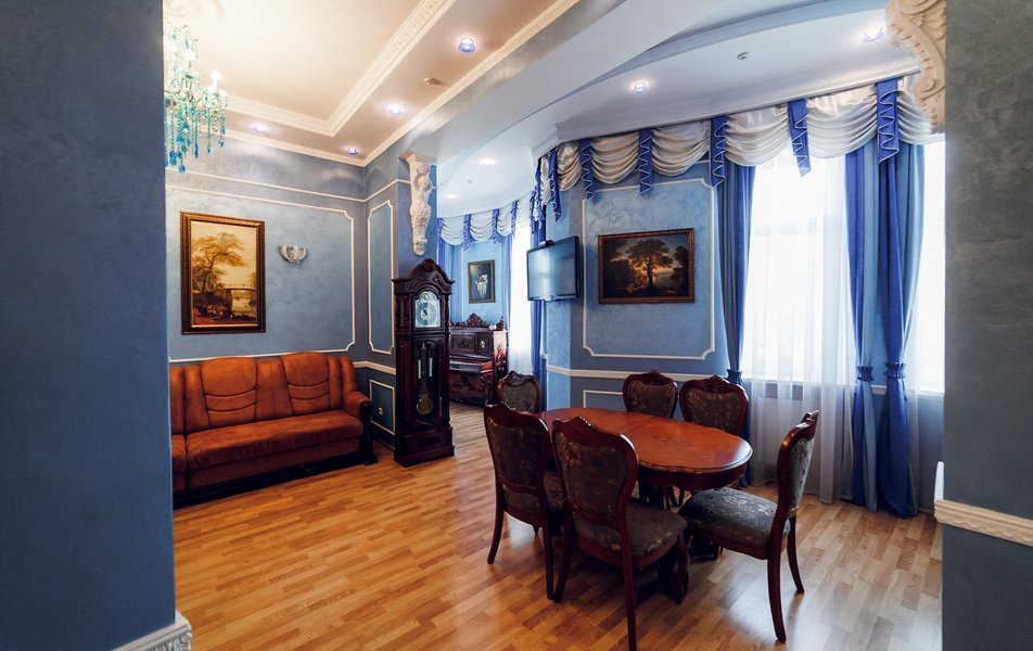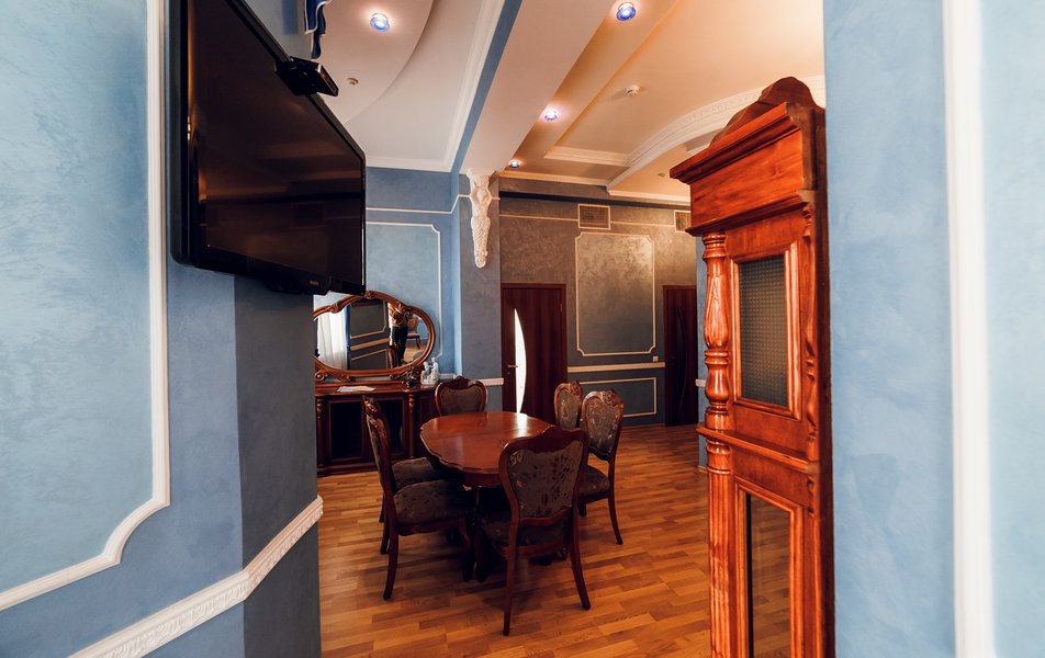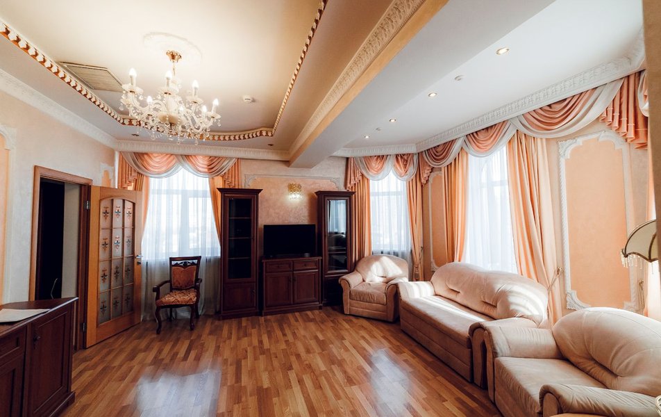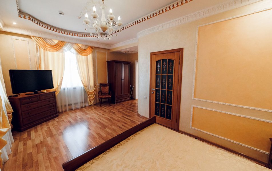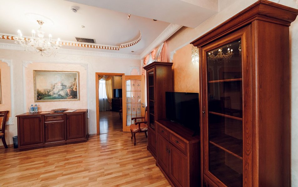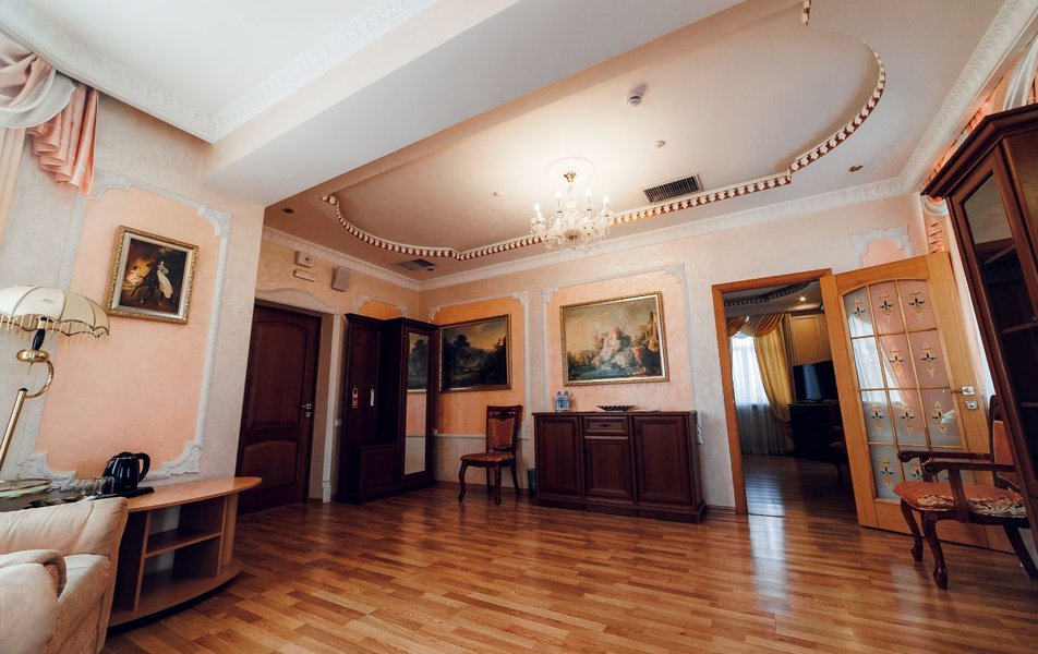 Люкс 2-местный 2-комнатный (Премиум) Количество комнат: 2-комнатный Тип номера: Люкс Кол-во доп. мест: 2 Кол-во основных мест: 2 Площадь (кв. м): 65 Мебель: вешалка, зеркало, кровать двуспальная, прикроватные тумбочки, стол, стулья, шкаф Оборудование: кондиционер, сейф, телевизор, телефон, холодильник, чайник Санузел: с душем, тапочки, туалетные принадлежности, фен, халат Сервис: Wi-Fi бесплатно, смена полотенец, смена постельного белья, уборка номера