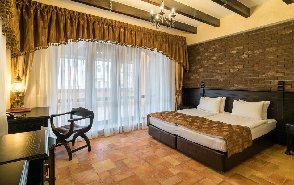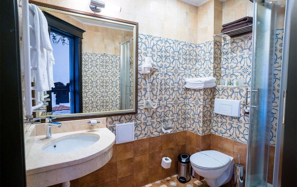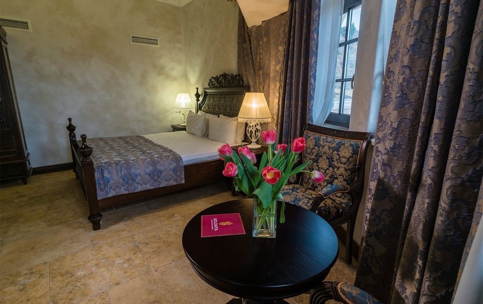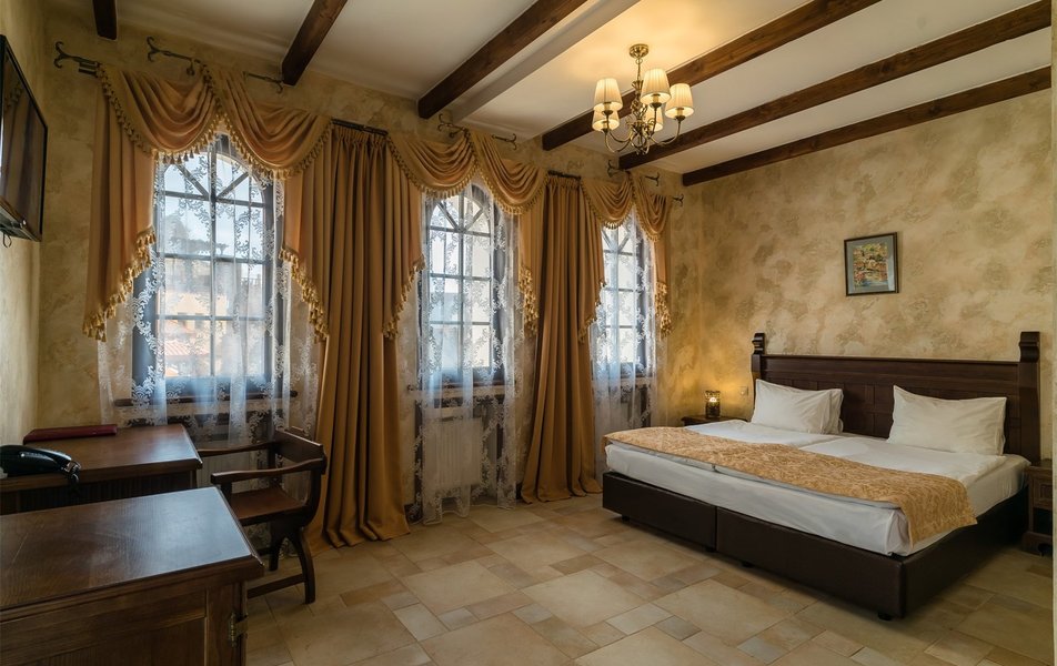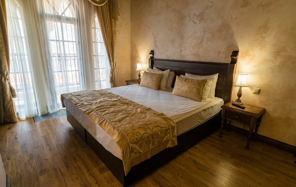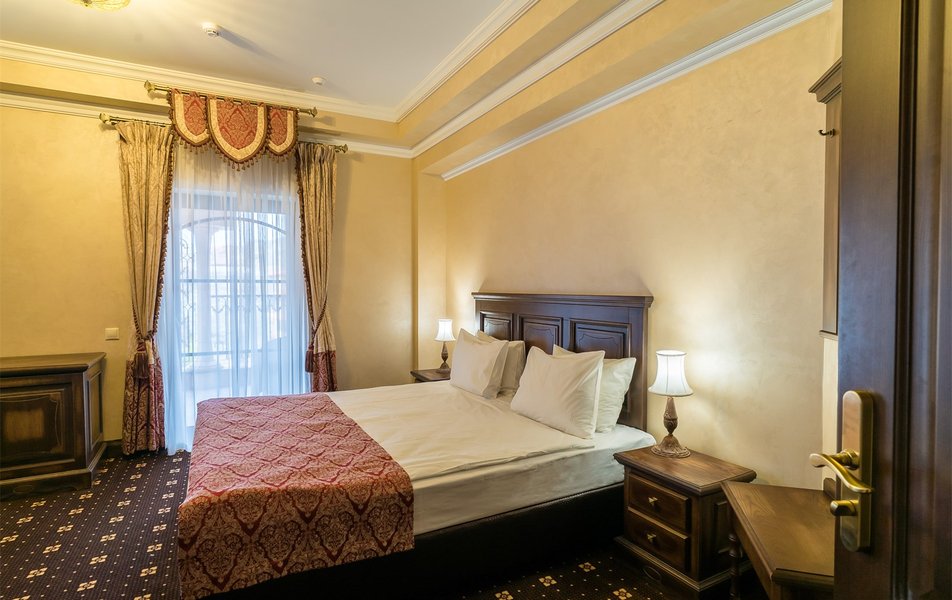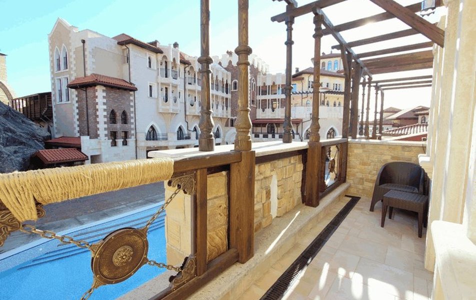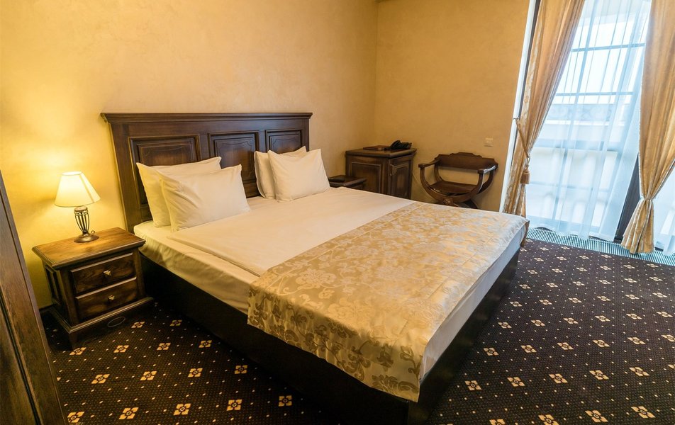 Комфорт 2-местный 1-комнатный Количество комнат: 1-комнатный Тип номера: Комфорт Дополнительное место: еврораскладушка Вид из номера: на двор: или бассейн и Генуэзскую крепость Кол-во доп. мест: 1 Кол-во номеров: 9 Кол-во основных мест: 2 Корпус: 2, 3 Площадь (кв. м): 17 Балкон: не во всех номерах, французский балкон: некоторые номера Мебель: вешалка, зеркало, кровати односпальные /одна двуспальная кровать, прикроватные тумбочки, стол, стул, шкаф Оборудование: кондиционер, мини-холодильник, сейф, телевизор: LED, с IP-TV, телефон Санузел: с душем, туалетные принадлежности, фен Сервис: Wi-Fi бесплатно, room-сервис: 24 ч только в летнее время, мини-бар, смена полотенец: по требованию, смена постельного белья: по требованию, уборка номера: ежедневно, услуги внутренней телефонной связи