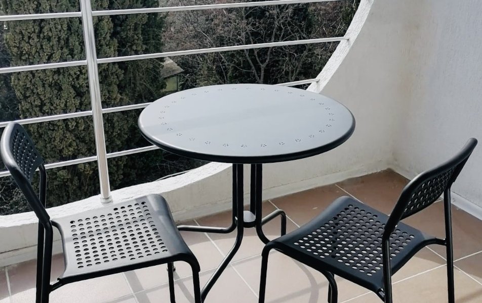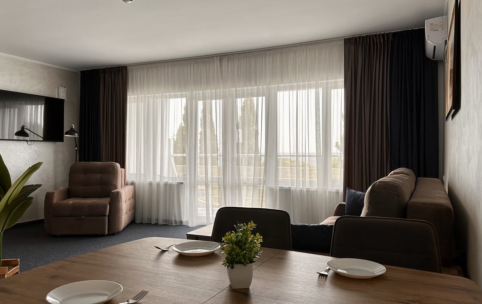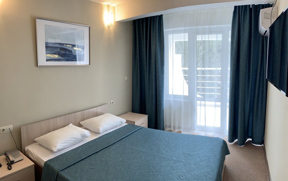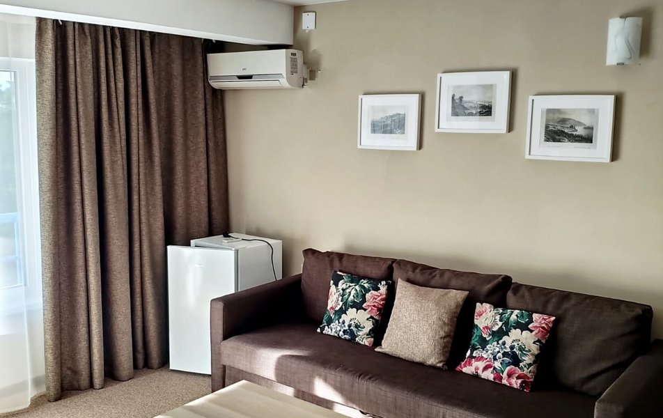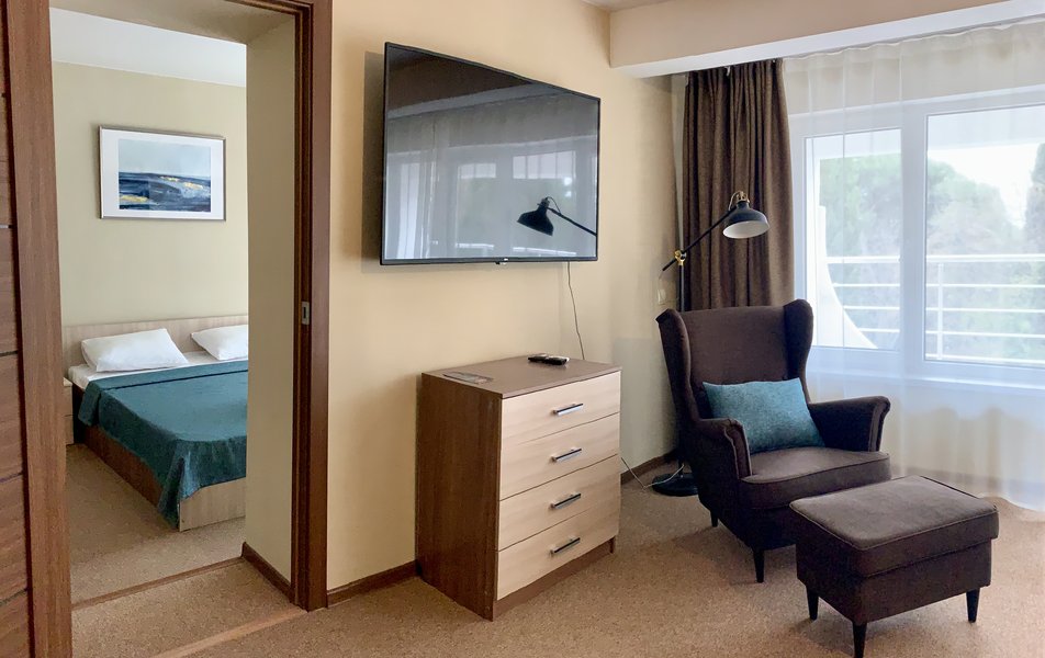 Люкс Улучшенный 2-местный 2-комнатный Количество комнат: 2-комнатный Тип номера: Люкс Вид из номера: на море или парк Кол-во доп. мест: 2 Кол-во основных мест: 2 Балкон: балкон или терраса, с мебелью Мебель: вешалка, диван раскладной, зеркало, комод, кресло, кровать двуспальная, прикроватные тумбочки, столик журнальный, стол обеденный, стулья, шкаф Оборудование: кондиционер, микроволновая печь, мини-холодильник, набор посуды, телевизор: 2, телефон, чайный набор посуды, электрочайник Санузел: с ванной, тапочки, туалетные принадлежности, фен Сервис: Wi-Fi бесплатно, смена полотенец, смена постельного белья, уборка номера, услуги внутренней телефонной связи