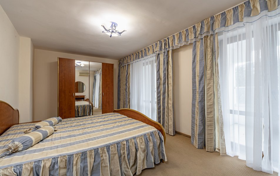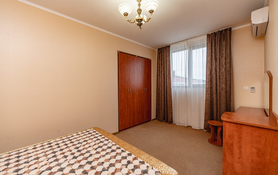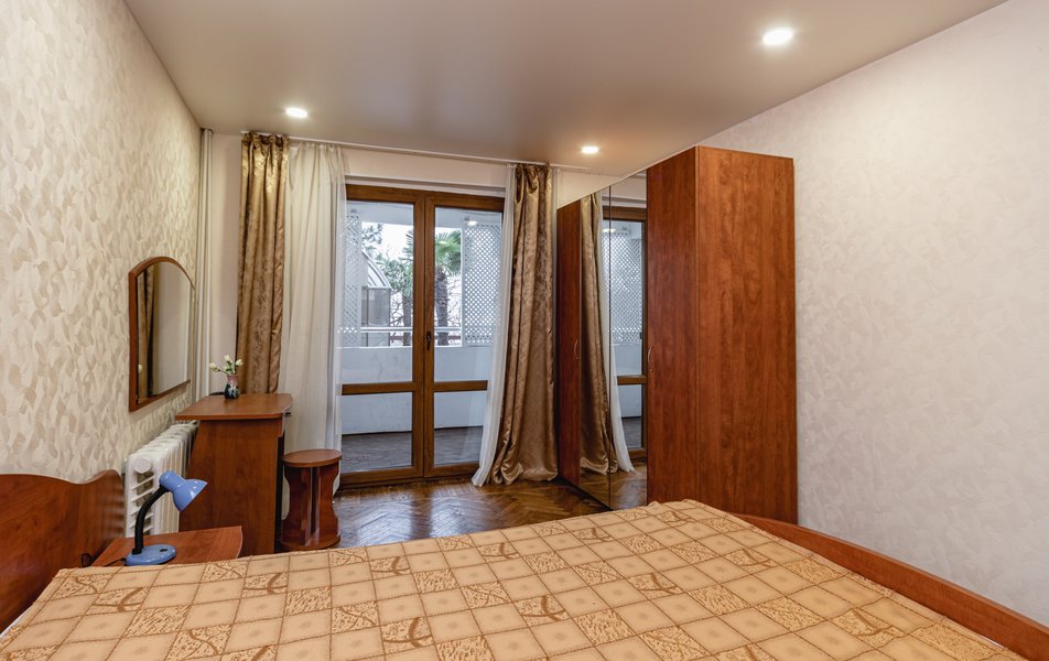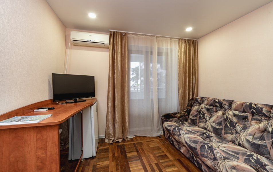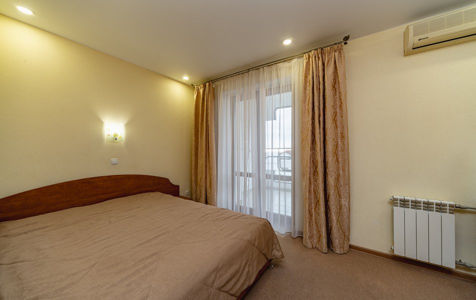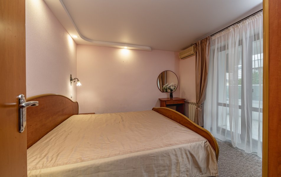 Коттедж 2-местный 1-комнатный (№22) Количество комнат: 1-комнатный Тип номера: Коттедж/Вилла Дополнительное место: еврораскладушка Кол-во доп. мест: 1 Кол-во основных мест: 2 Корпус: Коттедж Площадь (кв. м): 24 Балкон: с мебелью Мебель: вешалка, зеркало, кровать двуспальная, прикроватные тумбочки, столик журнальный, стулья, шкаф Оборудование: кондиционер, телевизор, холодильник Санузел: с душевой кабиной, туалетные принадлежности Сервис: Wi-Fi бесплатно, смена полотенец, смена постельного белья, уборка номера