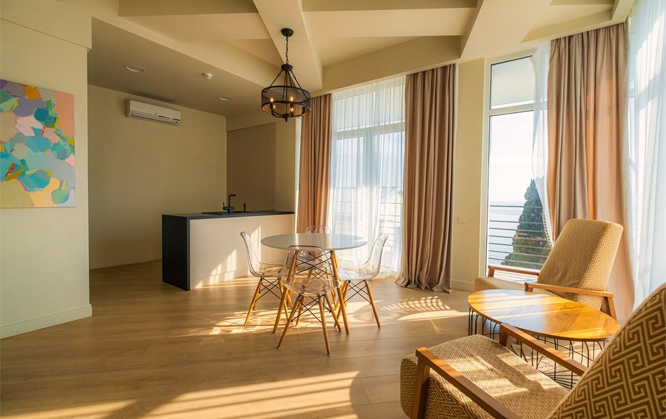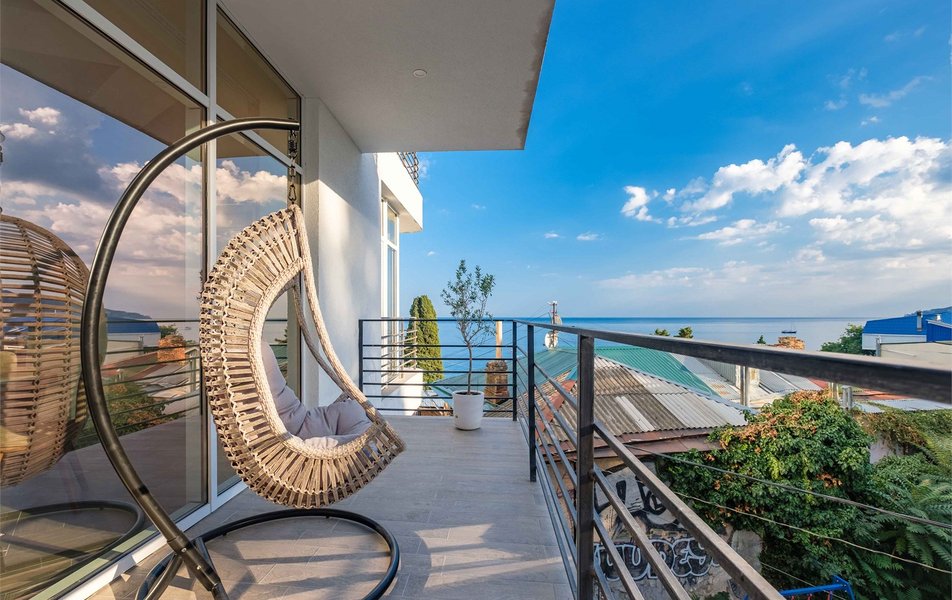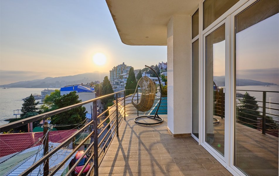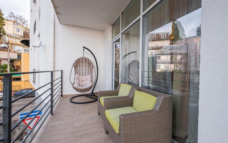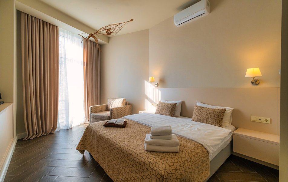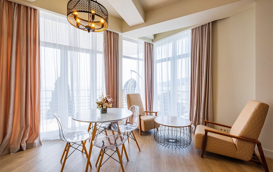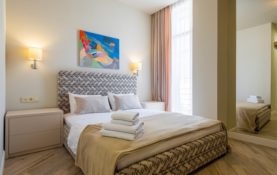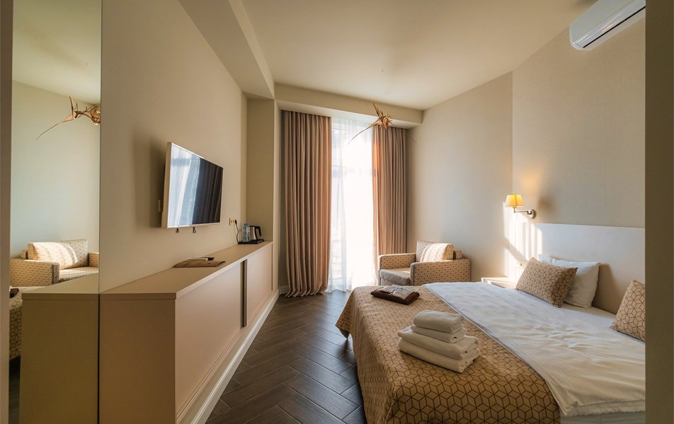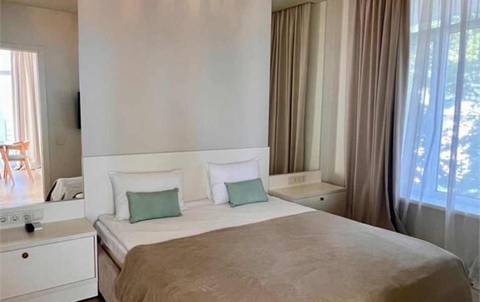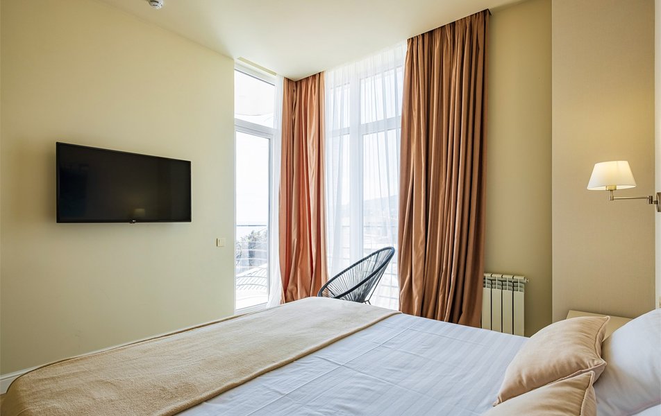 Апартаменты 2-местный 2-комнатный (Видовой) Количество комнат: 2-комнатный Тип номера: Апартаменты Вид из номера: на море или горы Кол-во основных мест: 4 Площадь (кв. м): 55 Балкон: с мебелью Мебель: вешалка, диван, зеркало, кровать двуспальная, прикроватные тумбочки, стол, стулья, шкаф Оборудование: кофемашина, мини-холодильник, набор посуды, плита индукционная, сейф, сплит-система, стиральная машина, телевизор, чайный набор посуды, электрочайник Санузел: с душем, тапочки, туалетные принадлежности, фен, халат Сервис: Wi-Fi бесплатно, смена полотенец, смена постельного белья, уборка номера