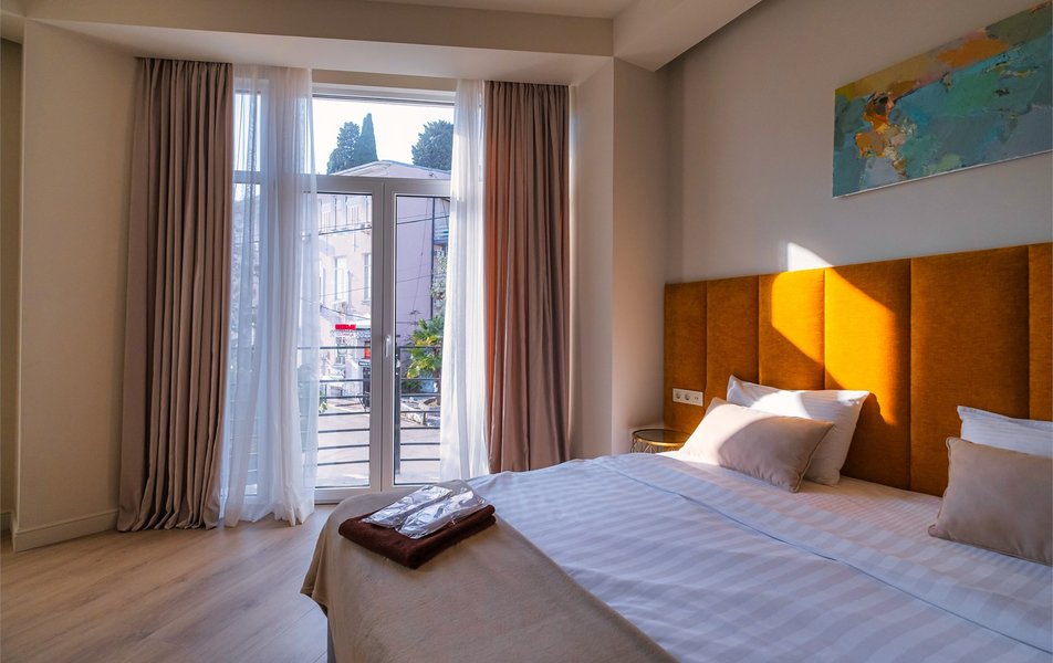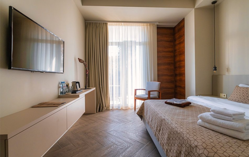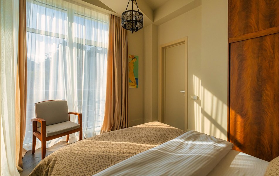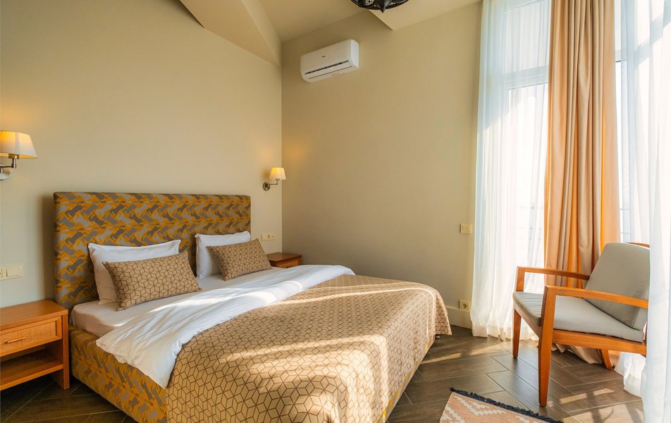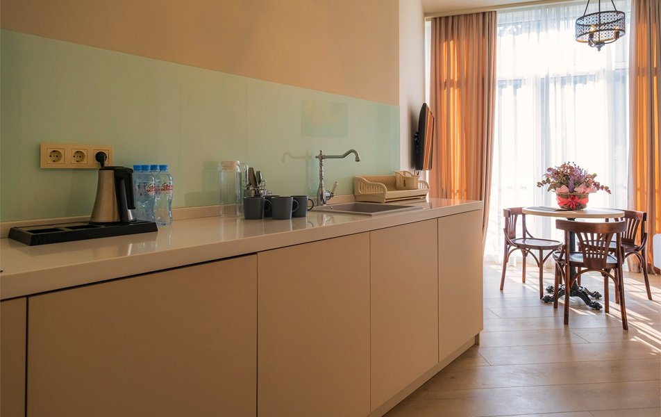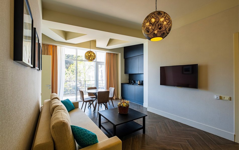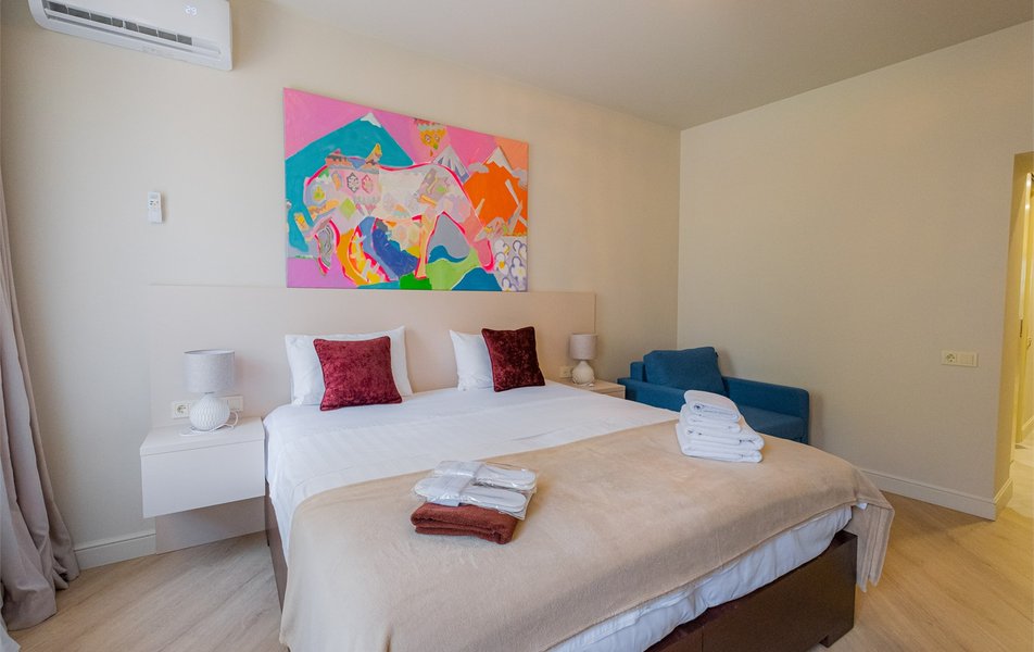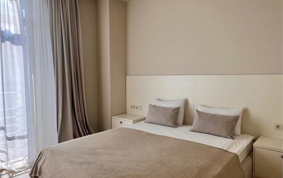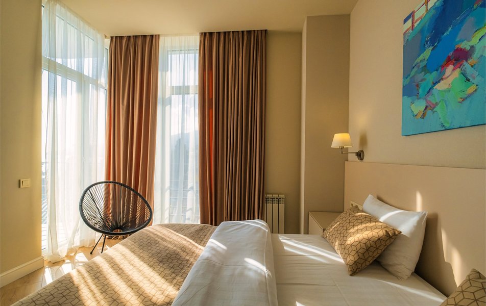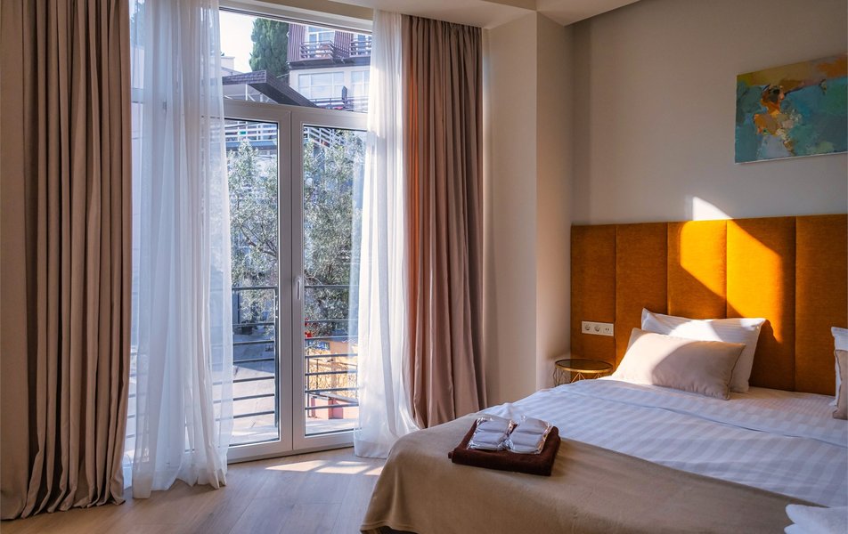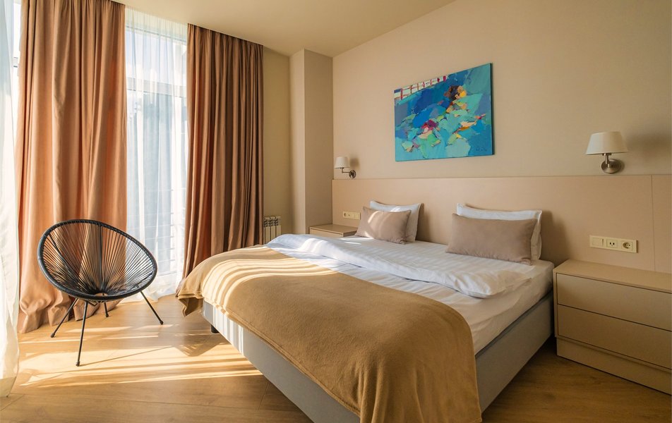 Апартаменты 2-местный 2-комнатный (Видовой) Количество комнат: 2-комнатный Тип номера: Апартаменты Вид из номера: на море или горы Кол-во основных мест: 4 Площадь (кв. м): 55 Балкон: с мебелью Мебель: вешалка, диван, зеркало, кровать двуспальная, прикроватные тумбочки, стол, стулья, шкаф Оборудование: кофемашина, мини-холодильник, набор посуды, плита индукционная, сейф, сплит-система, стиральная машина, телевизор, чайный набор посуды, электрочайник Санузел: с душем, тапочки, туалетные принадлежности, фен, халат Сервис: Wi-Fi бесплатно, смена полотенец, смена постельного белья, уборка номера