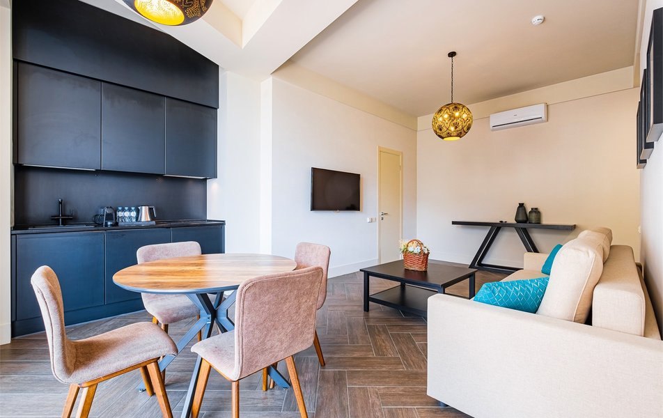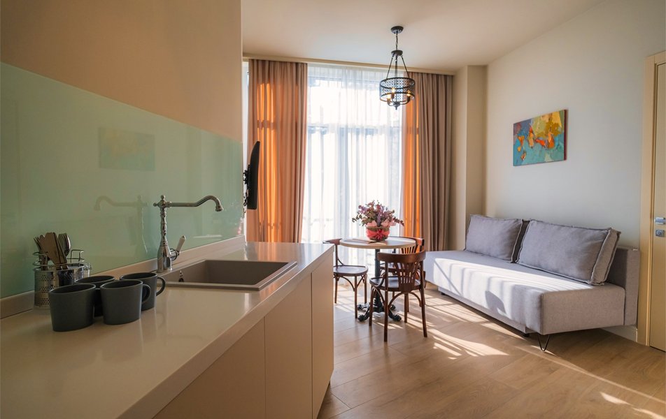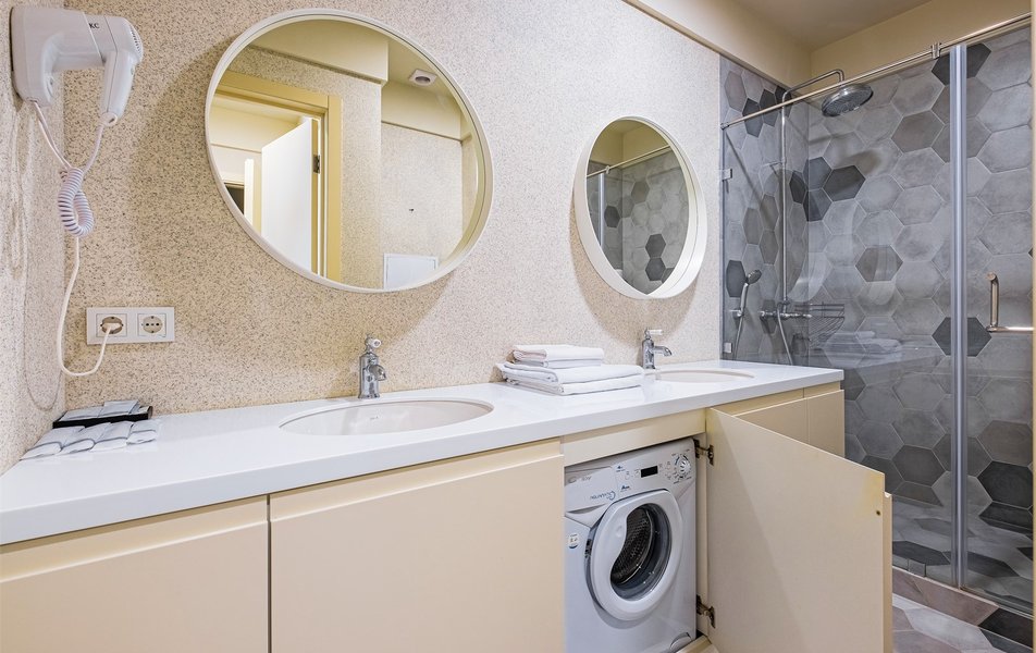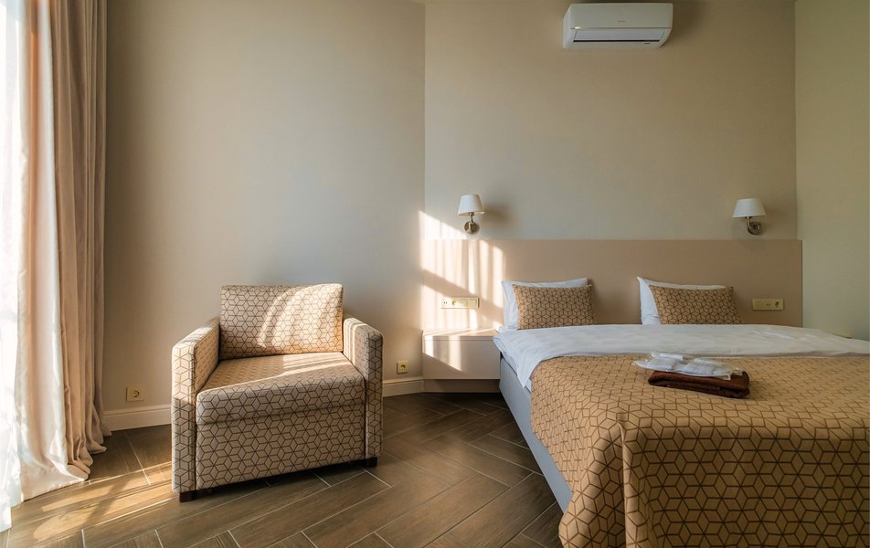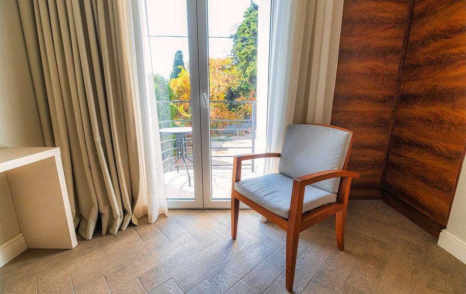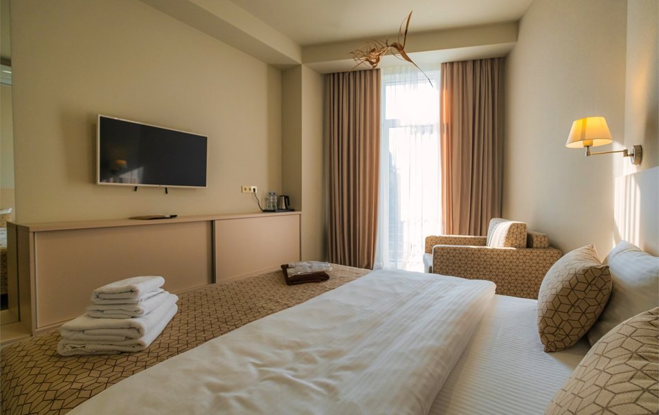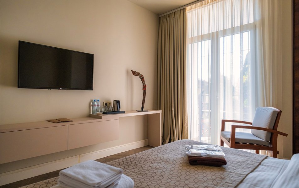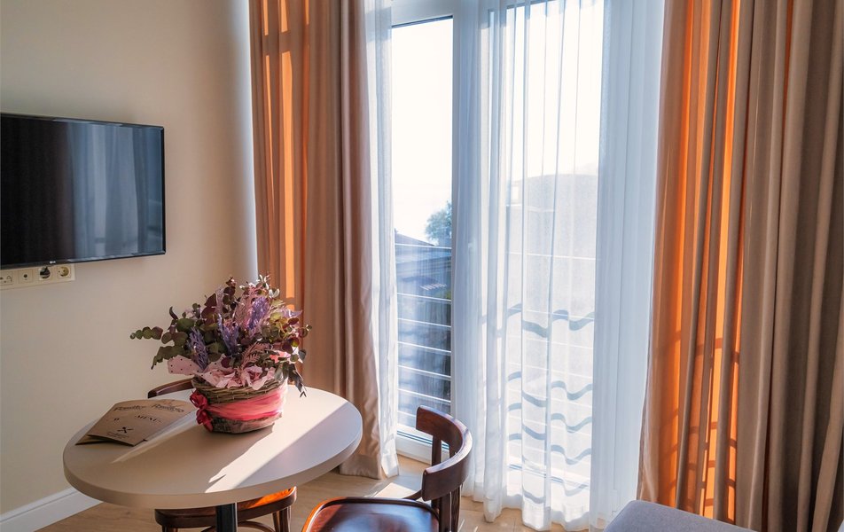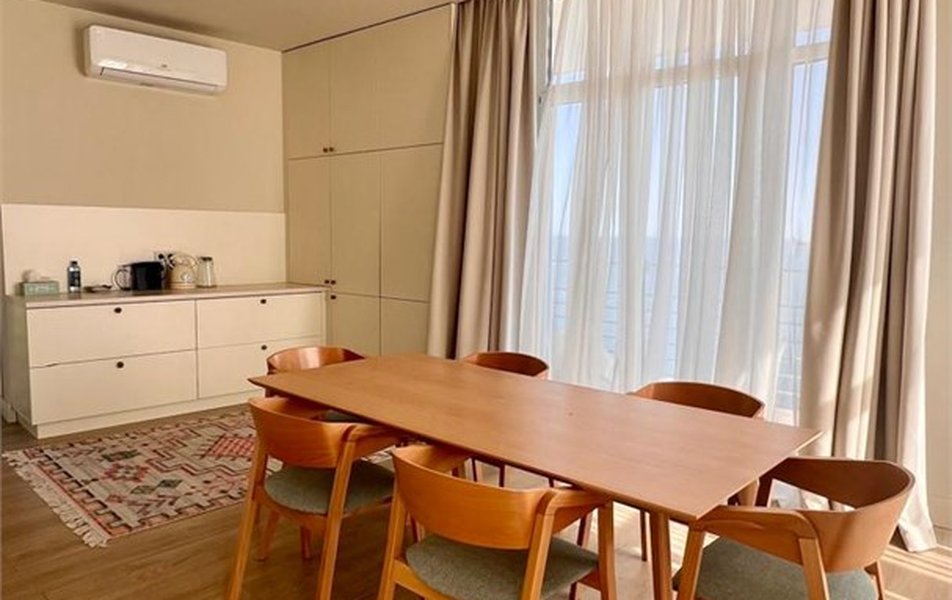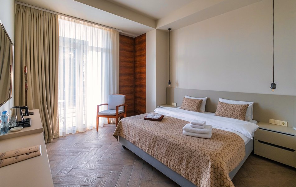 Апартаменты 2-местный 2-комнатный (Видовой) Количество комнат: 2-комнатный Тип номера: Апартаменты Вид из номера: на море или горы Кол-во основных мест: 4 Площадь (кв. м): 55 Балкон: с мебелью Мебель: вешалка, диван, зеркало, кровать двуспальная, прикроватные тумбочки, стол, стулья, шкаф Оборудование: кофемашина, мини-холодильник, набор посуды, плита индукционная, сейф, сплит-система, стиральная машина, телевизор, чайный набор посуды, электрочайник Санузел: с душем, тапочки, туалетные принадлежности, фен, халат Сервис: Wi-Fi бесплатно, смена полотенец, смена постельного белья, уборка номера