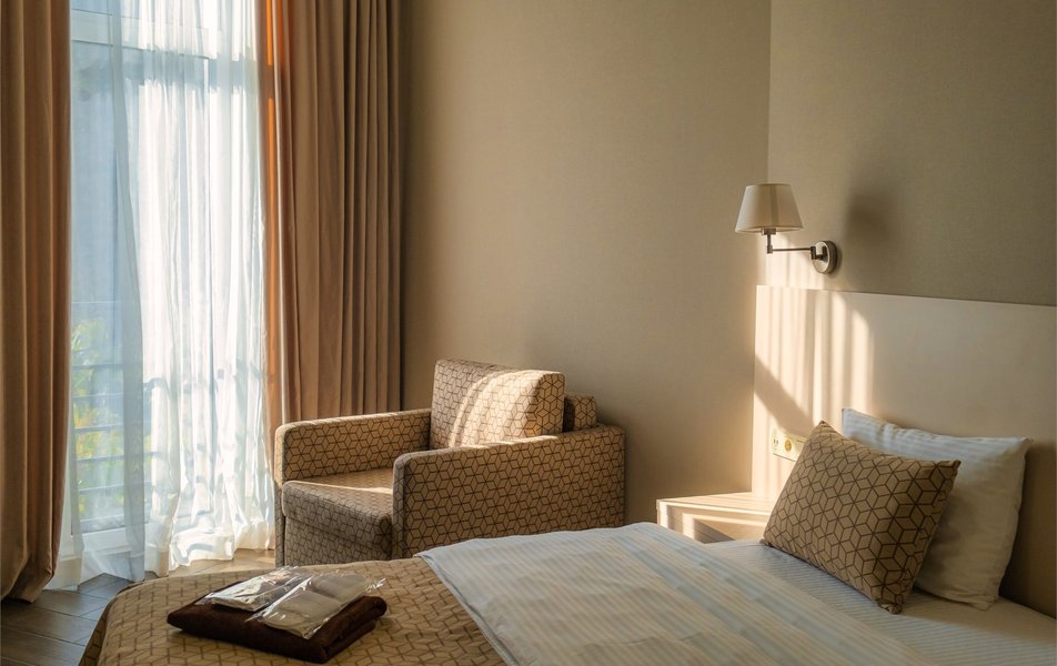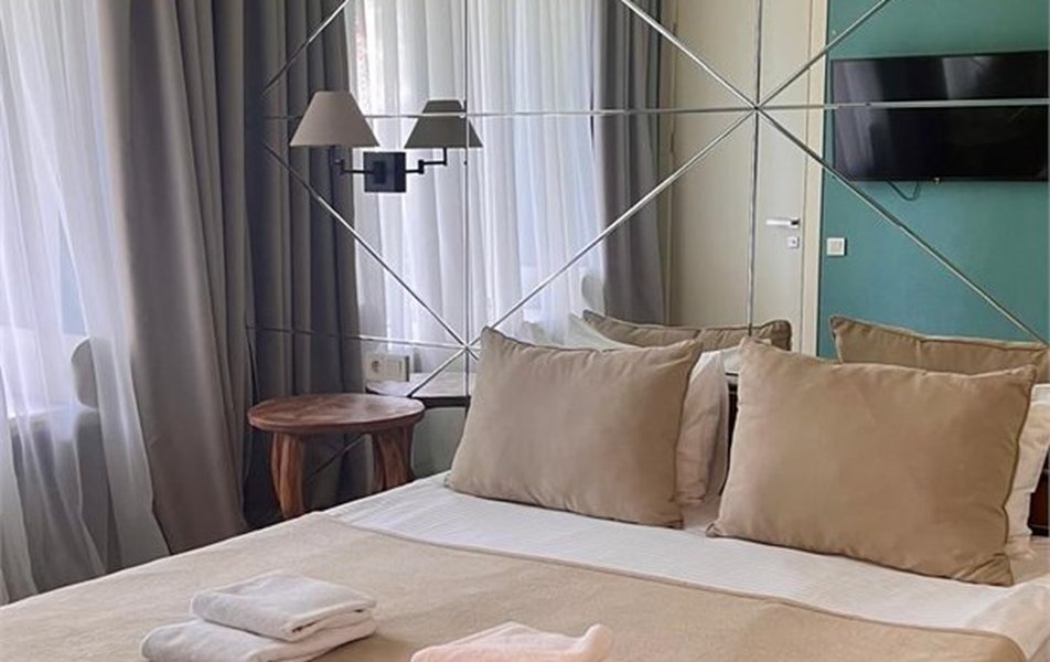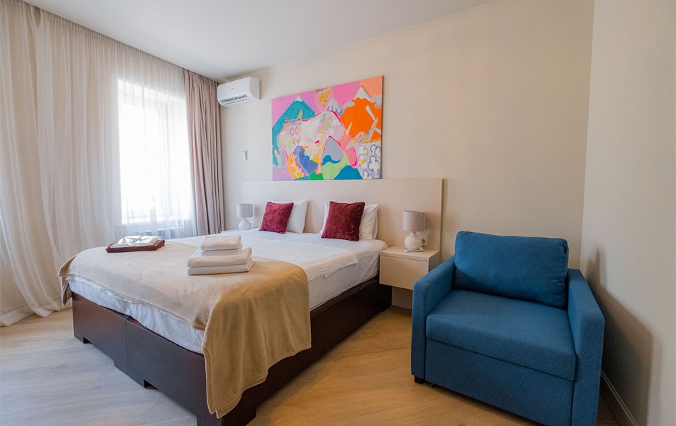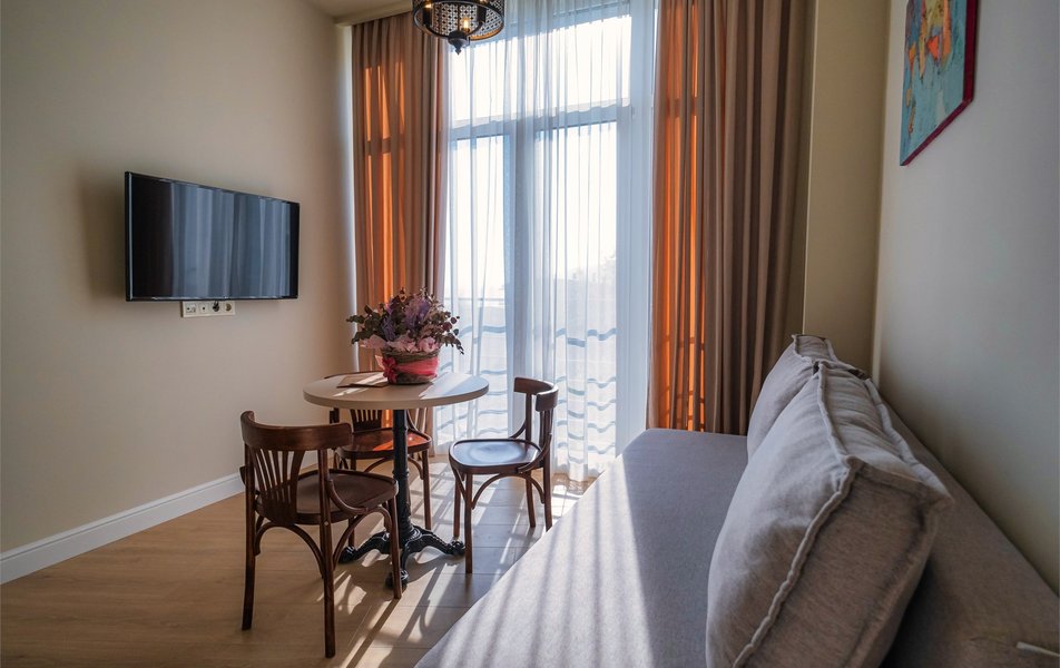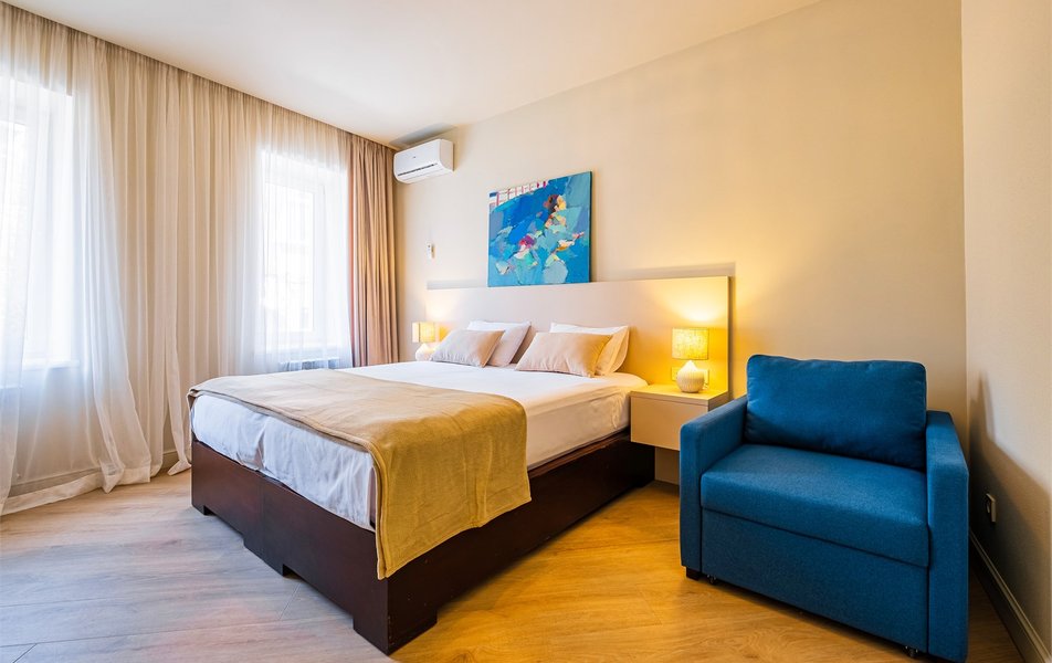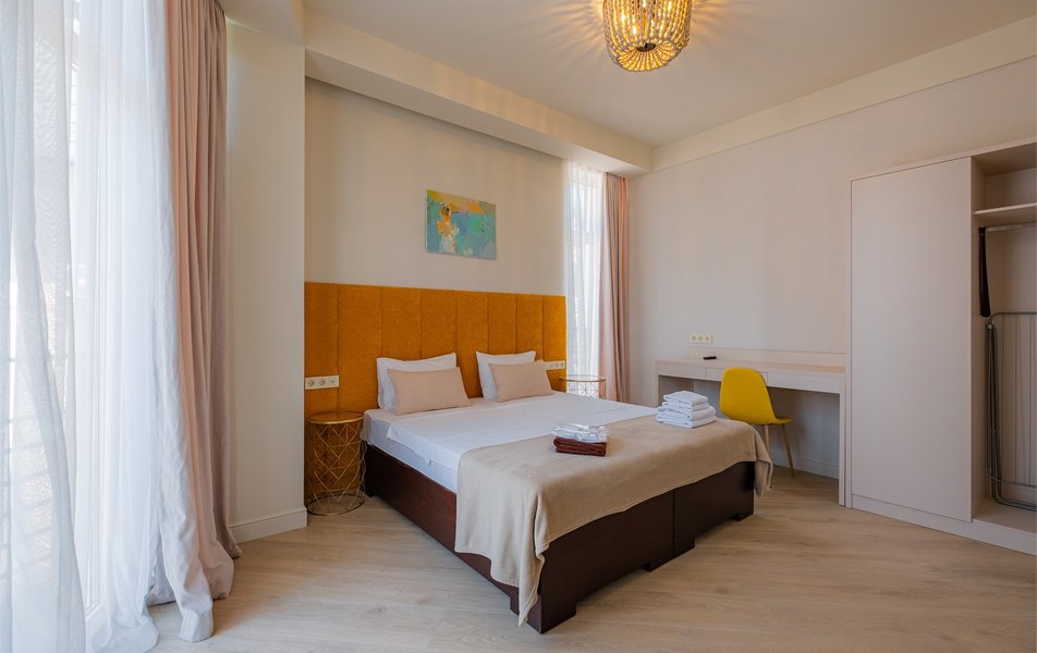 Апартаменты 4-местный 2-комнатный Количество комнат: 2-комнатный Тип номера: Апартаменты Вид из номера: частичный вид на море Кол-во основных мест: 4 Площадь (кв. м): 40 Балкон: с мебелью Мебель: вешалка, диван раскладной, зеркало, кровать двуспальная, кухонная мебель, прикроватные тумбочки, стол обеденный, стулья, шкаф Оборудование: кофемашина, мини-холодильник, набор посуды, сейф, сплит-система, сушилка для белья, телевизор, чайный набор посуды, электрочайник Санузел: с душем, тапочки, туалетные принадлежности, фен, халат Сервис: Wi-Fi бесплатно, смена полотенец, смена постельного белья, уборка номера