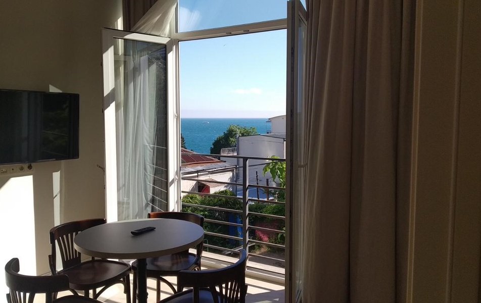 Апартаменты 5-местный 3-комнатный (Видовой, с террасой, №13) Количество комнат: 3-комнатный Тип номера: Апартаменты Вид из номера: на море Кол-во доп. мест: 1 Кол-во основных мест: 5 Мебель: вешалка, диван раскладной, зеркало, кровать двуспальная: 2, кухонная мебель, прикроватные тумбочки, прикроватный столик, пуфик, столик журнальный, стол обеденный, стулья, тумба, шкаф Оборудование: кондиционер, набор посуды, плита индукционная, стиральная машина, телевизор: 3, утюг, холодильник, чайный набор посуды, электрочайник Санузел: с душем, тапочки, туалетные принадлежности, фен, халат Сервис: Wi-Fi бесплатно, смена полотенец, смена постельного белья, уборка номера Терраса: оборудована мебелью