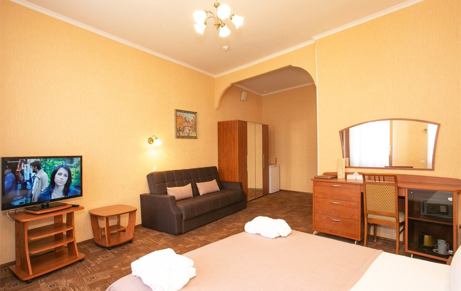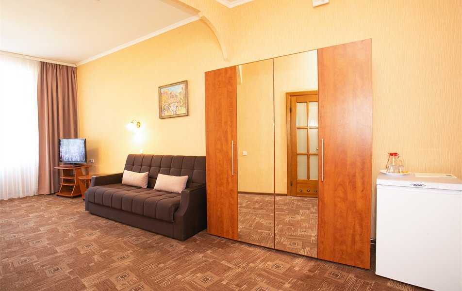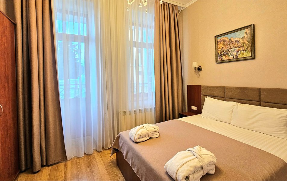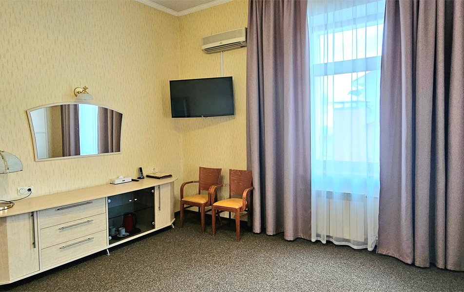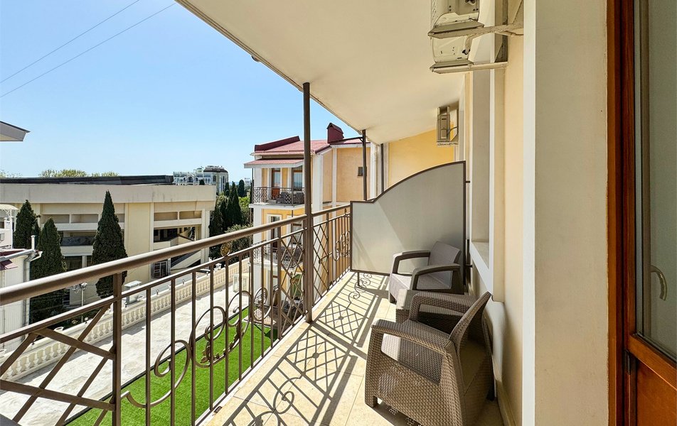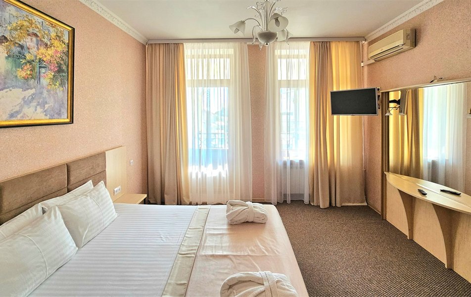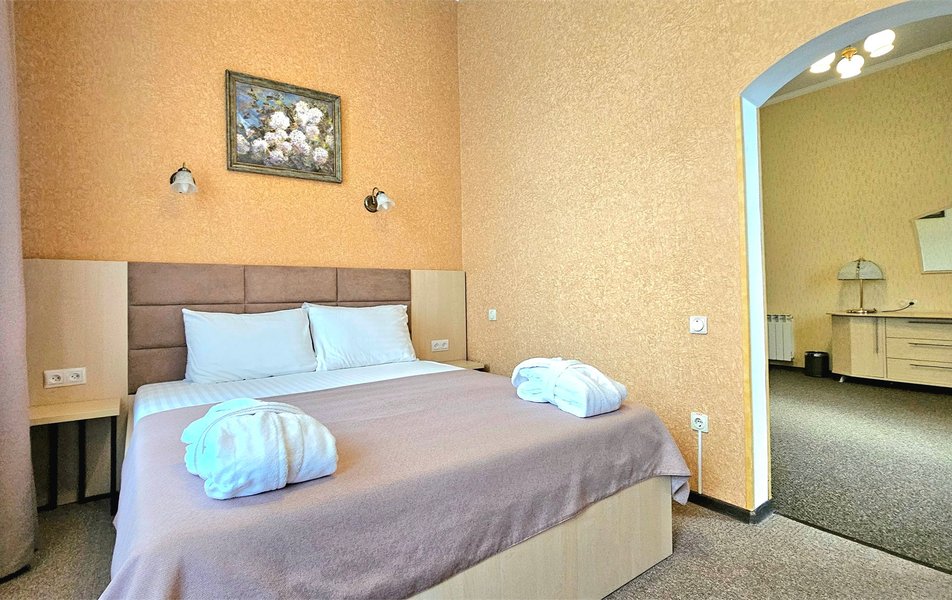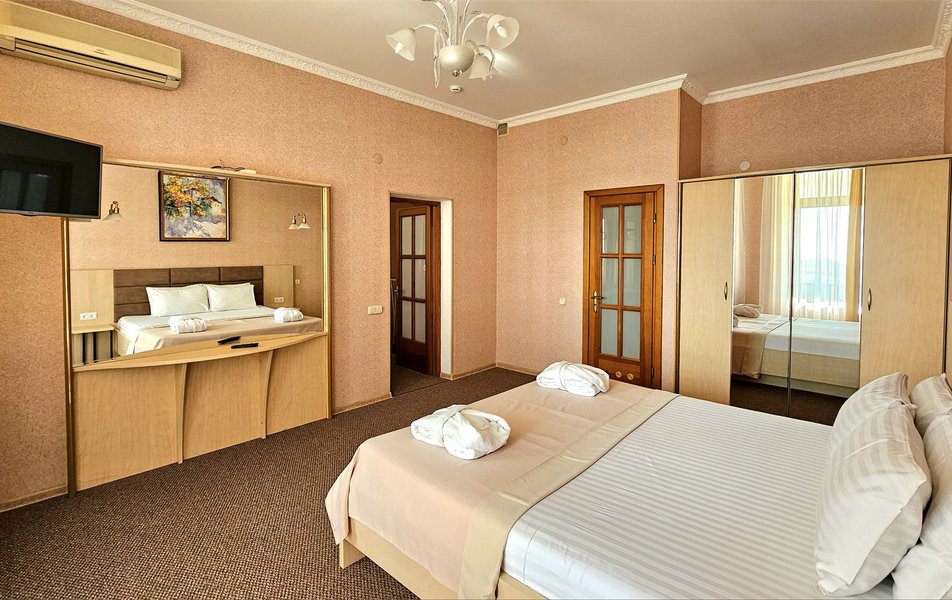 Джуниор Сьюит 2-местный 1-комнатный Количество комнат: 1-комнатный Дополнительное место: диван Кол-во доп. мест: 2 Кол-во основных мест: 2 Балкон: с мебелью Мебель: вешалка, диван раскладной, зеркало, кровать двуспальная, прикроватные тумбочки, стол, стулья, шкаф Оборудование: кондиционер, набор посуды, сейф, телевизор, телефон, холодильник, электрочайник Санузел: биде, с ванной, тапочки, туалетные принадлежности, фен Сервис: Wi-Fi бесплатно, room-сервис, смена полотенец: 1 раз в 3 дня, смена постельного белья: 1 раз в 5 дней, уборка номера: ежедневно, услуги внутренней телефонной связи
