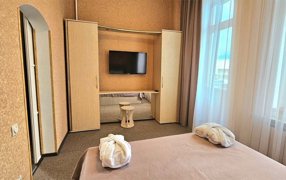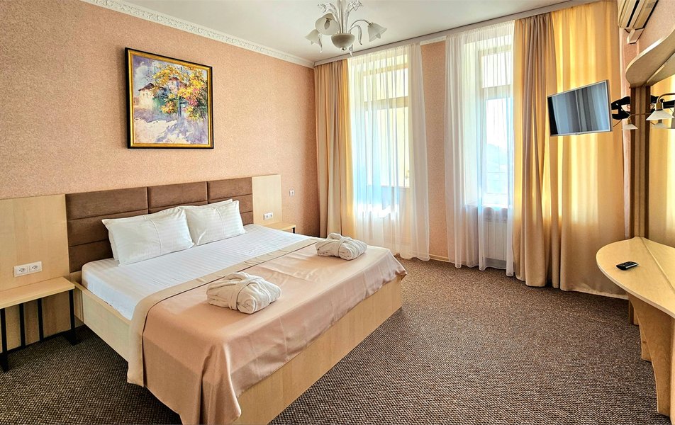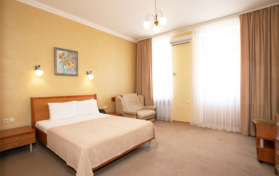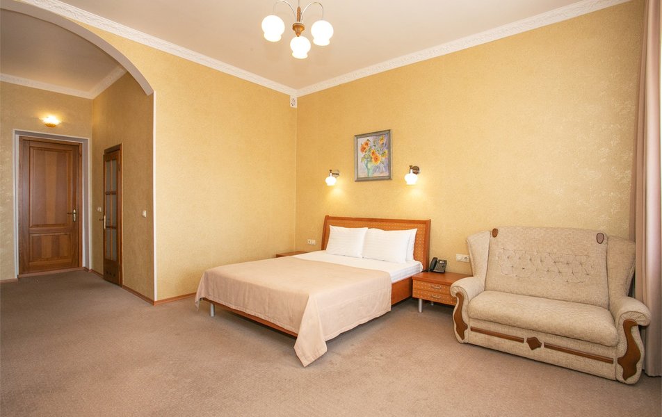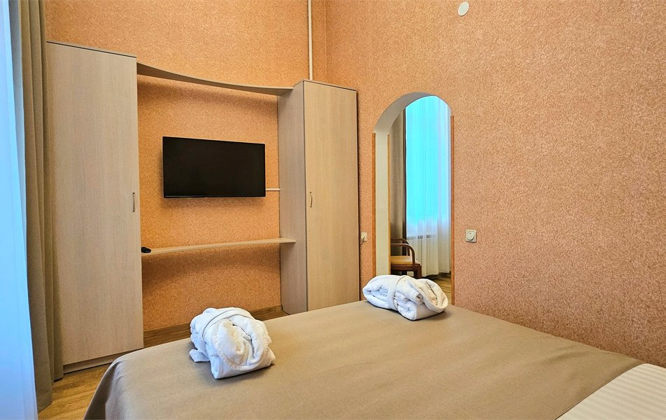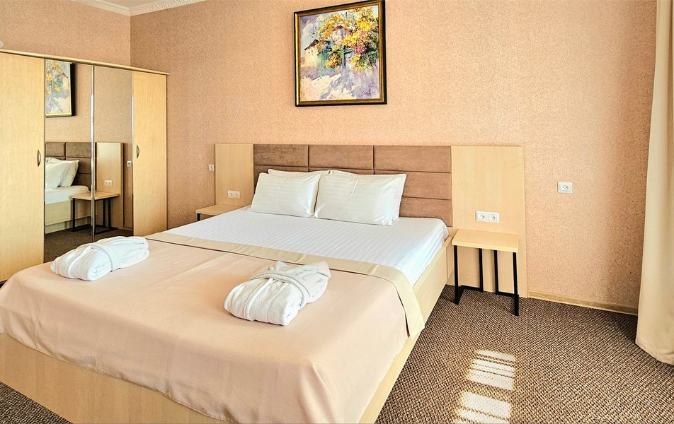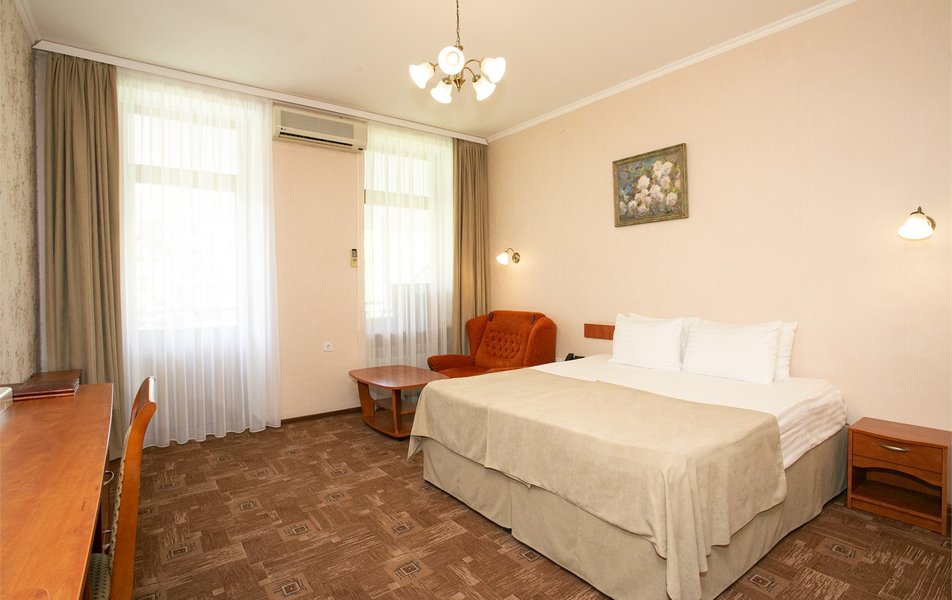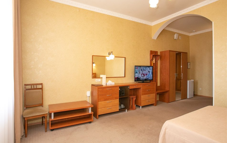 Джуниор Сьюит 2-местный 1-комнатный Количество комнат: 1-комнатный Дополнительное место: диван Кол-во доп. мест: 2 Кол-во основных мест: 2 Балкон: с мебелью Мебель: вешалка, диван раскладной, зеркало, кровать двуспальная, прикроватные тумбочки, стол, стулья, шкаф Оборудование: кондиционер, набор посуды, сейф, телевизор, телефон, холодильник, электрочайник Санузел: биде, с ванной, тапочки, туалетные принадлежности, фен Сервис: Wi-Fi бесплатно, room-сервис, смена полотенец: 1 раз в 3 дня, смена постельного белья: 1 раз в 5 дней, уборка номера: ежедневно, услуги внутренней телефонной связи