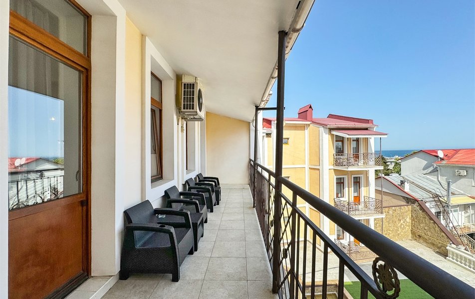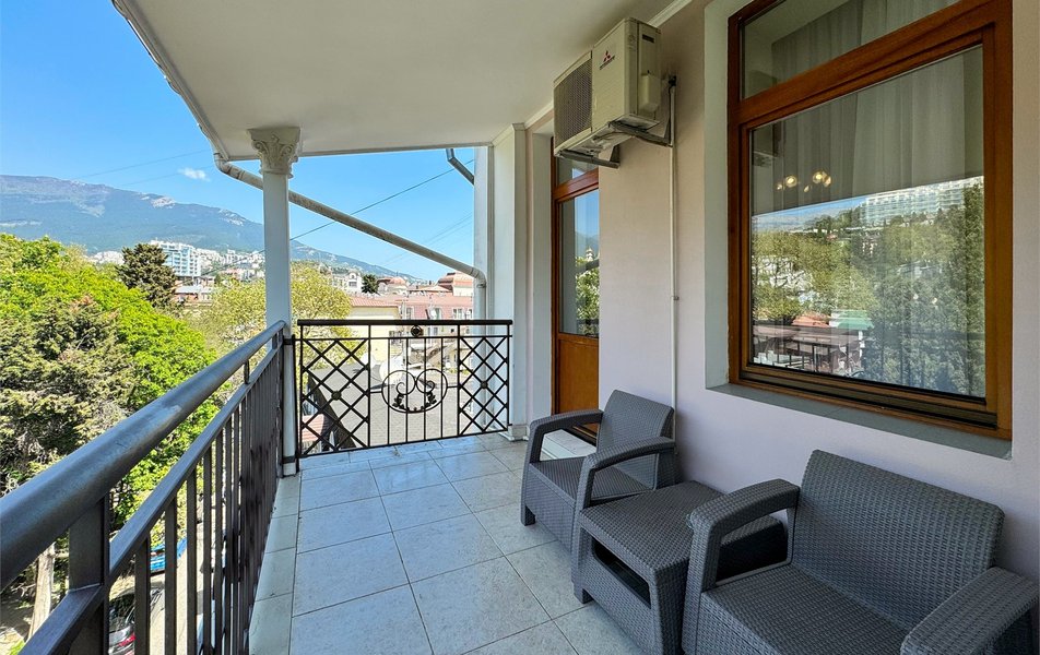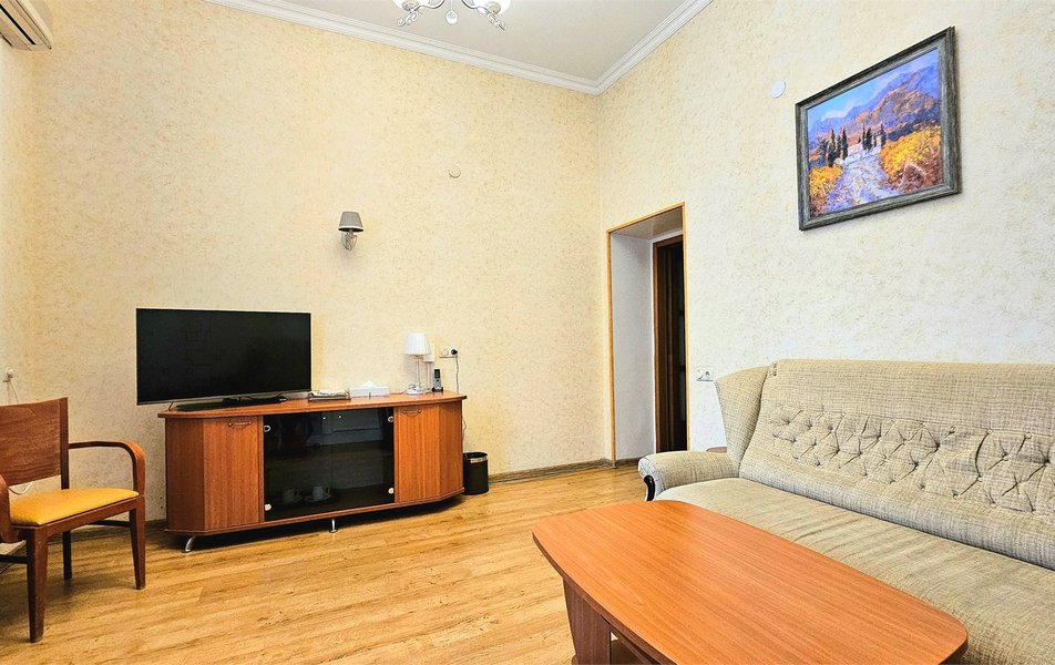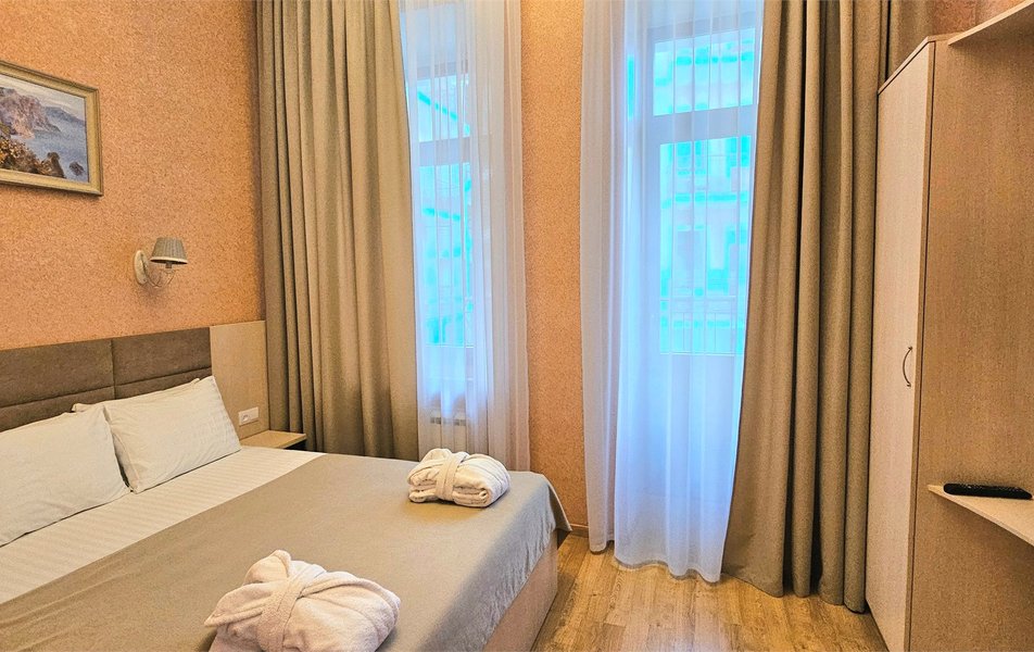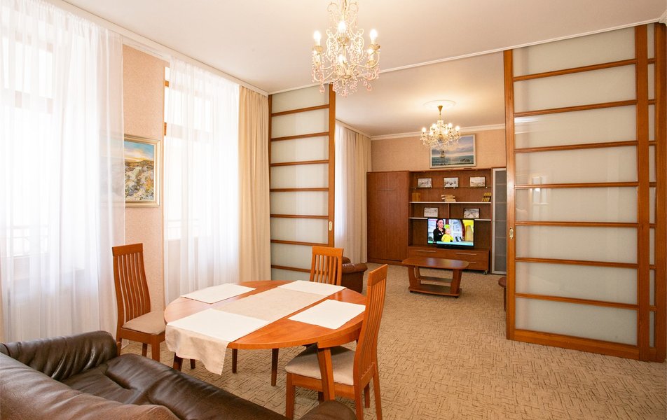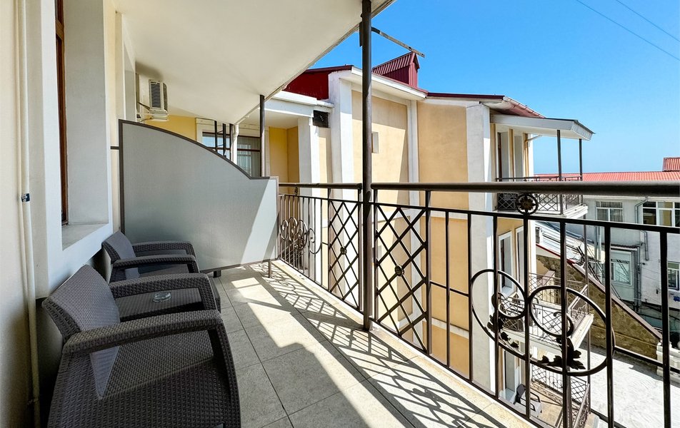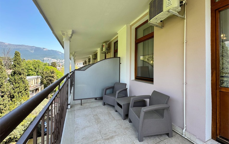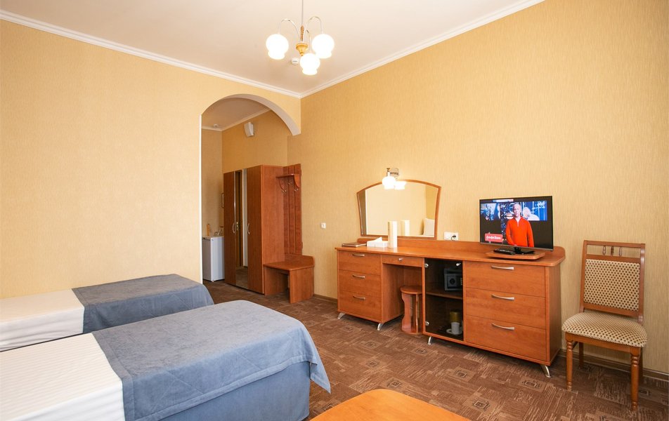 Джуниор Сьюит 2-местный 1-комнатный Количество комнат: 1-комнатный Дополнительное место: диван Кол-во доп. мест: 2 Кол-во основных мест: 2 Балкон: с мебелью Мебель: вешалка, диван раскладной, зеркало, кровать двуспальная, прикроватные тумбочки, стол, стулья, шкаф Оборудование: кондиционер, набор посуды, сейф, телевизор, телефон, холодильник, электрочайник Санузел: биде, с ванной, тапочки, туалетные принадлежности, фен Сервис: Wi-Fi бесплатно, room-сервис, смена полотенец: 1 раз в 3 дня, смена постельного белья: 1 раз в 5 дней, уборка номера: ежедневно, услуги внутренней телефонной связи