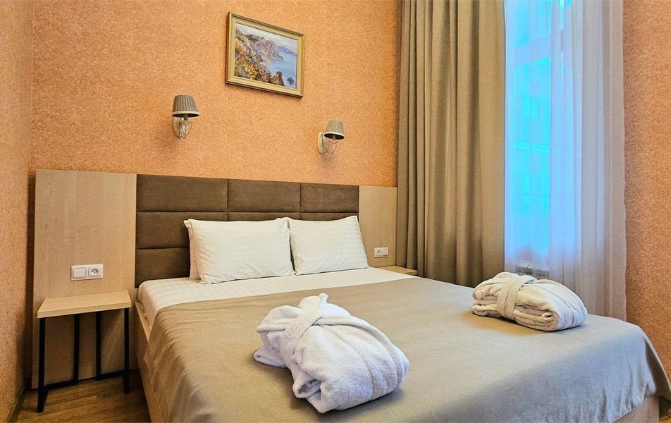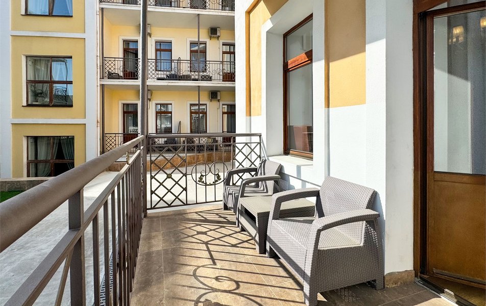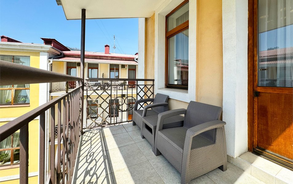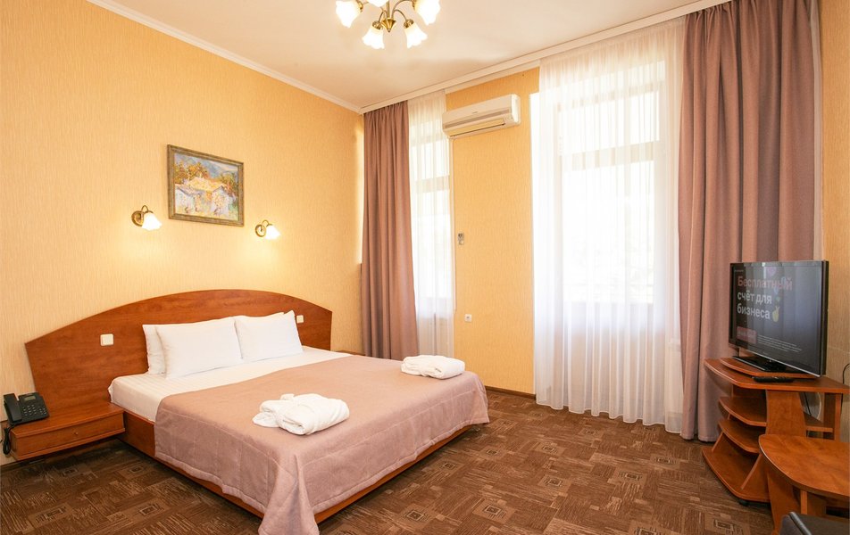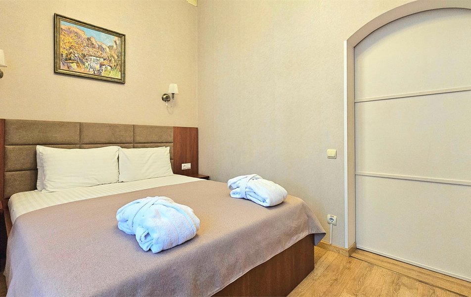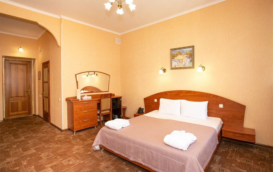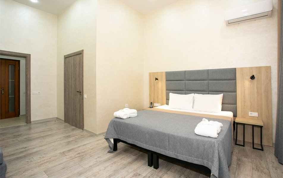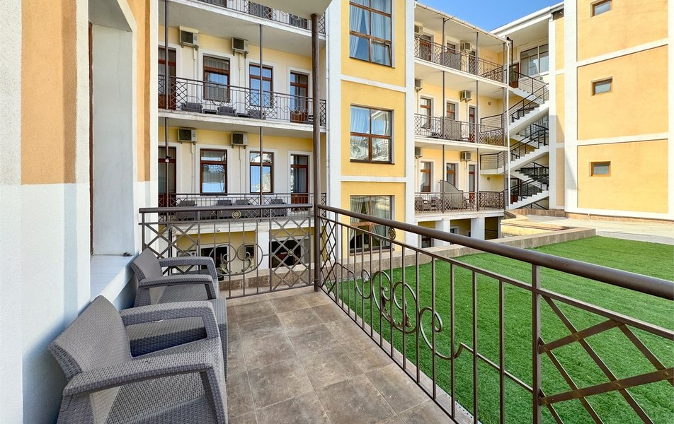 Джуниор Сьюит 2-местный 2-комнатный (с двориком) Количество комнат: 2-комнатный Тип номера: Люкс Дополнительное место: диван Кол-во доп. мест: 2 Кол-во основных мест: 2 Площадь (кв. м): 45 Мебель: вешалка, диван раскладной, зеркало, кровать двуспальная, мягкий уголок, прикроватные тумбочки, стол, столик журнальный, столик туалетный, стулья, тумба багажная, шкаф Оборудование: кондиционер, сейф, телевизор, телефон, холодильник, чайный набор посуды, электрочайник Санузел: биде, с ванной, тапочки, туалетные принадлежности, фен, халат Сервис: Wi-Fi бесплатно, room-сервис, смена полотенец: 1 раз в 3 дня, смена постельного белья: 1 раз в 5 дней, уборка номера: ежедневно, услуги внутренней телефонной связи