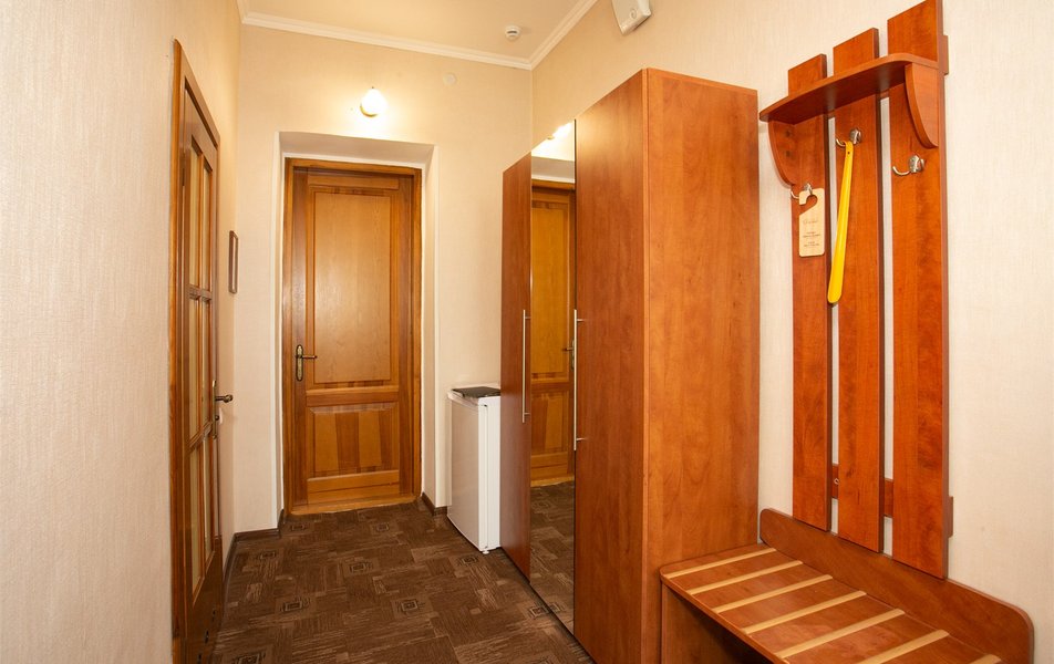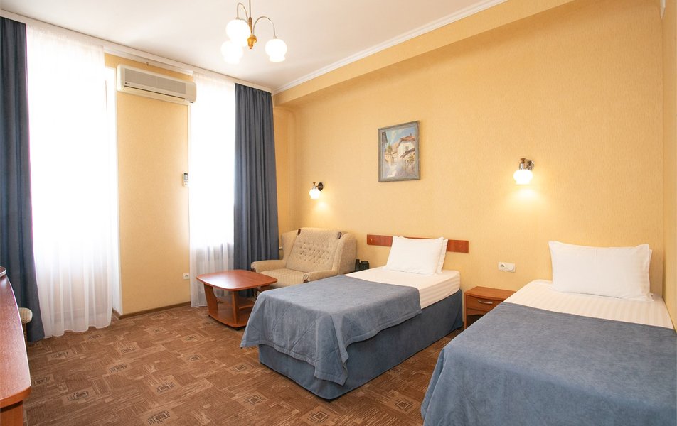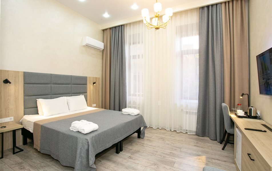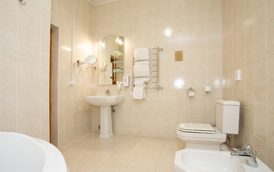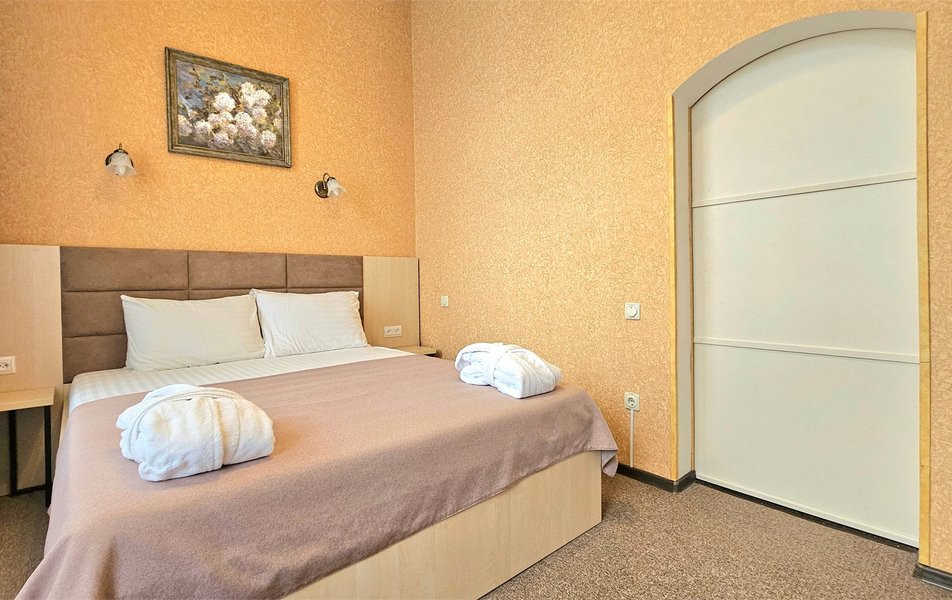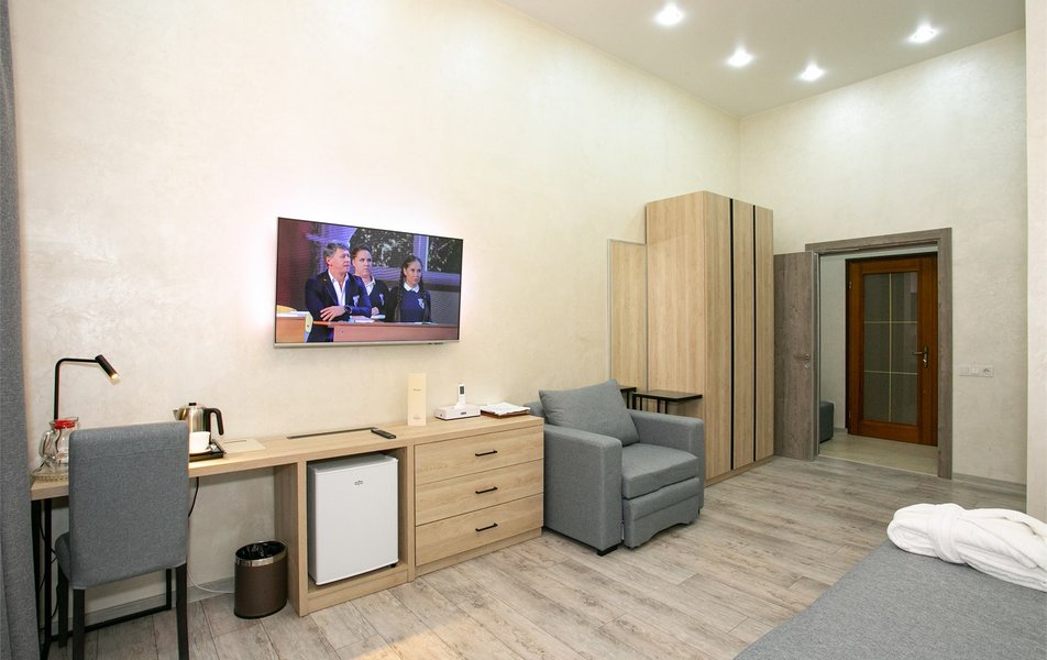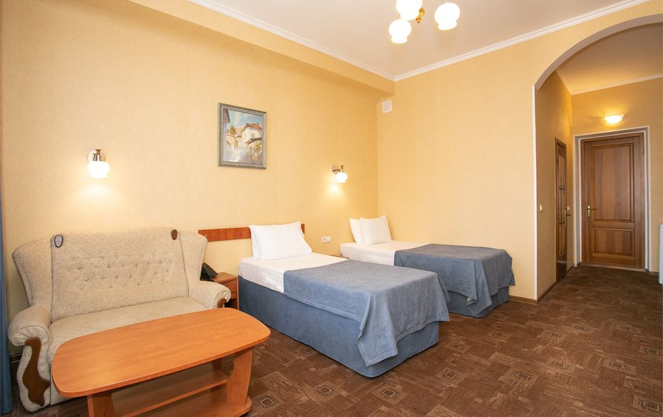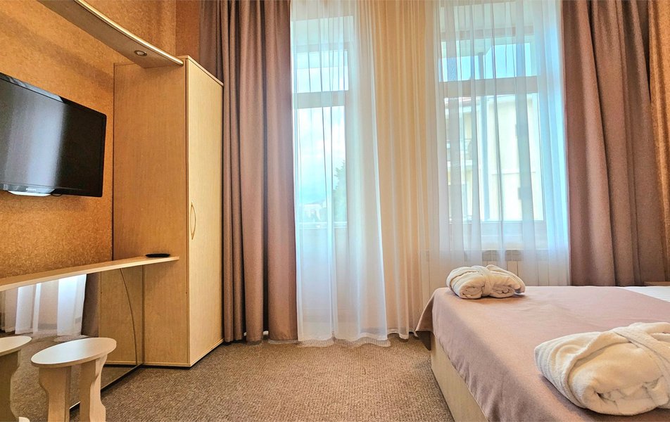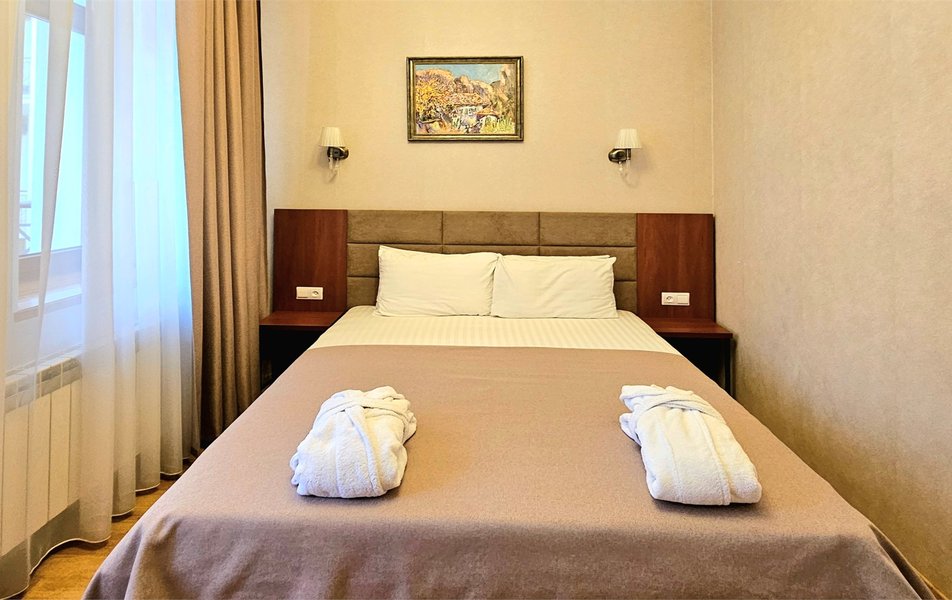 Джуниор Сьюит 2-местный 2-комнатный (с двориком) Количество комнат: 2-комнатный Тип номера: Люкс Дополнительное место: диван Кол-во доп. мест: 2 Кол-во основных мест: 2 Площадь (кв. м): 45 Мебель: вешалка, диван раскладной, зеркало, кровать двуспальная, мягкий уголок, прикроватные тумбочки, стол, столик журнальный, столик туалетный, стулья, тумба багажная, шкаф Оборудование: кондиционер, сейф, телевизор, телефон, холодильник, чайный набор посуды, электрочайник Санузел: биде, с ванной, тапочки, туалетные принадлежности, фен, халат Сервис: Wi-Fi бесплатно, room-сервис, смена полотенец: 1 раз в 3 дня, смена постельного белья: 1 раз в 5 дней, уборка номера: ежедневно, услуги внутренней телефонной связи