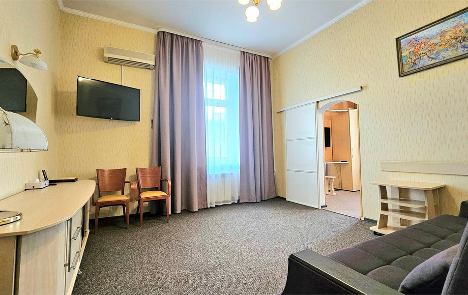 Джуниор Сьюит 2-местный 2-комнатный Количество комнат: 2-комнатный Дополнительное место: диван Кол-во доп. мест: 2 Кол-во основных мест: 2 Площадь (кв. м): 36 Балкон: с мебелью Мебель: вешалка, зеркало, кресла, кровать двуспальная, мягкий уголок, прикроватные тумбочки, стол, столик журнальный, стулья, шкаф Оборудование: кондиционер, сейф, телевизор, телефон, холодильник, чайный набор посуды, электрочайник Санузел: биде, с ванной, тапочки, туалетные принадлежности, фен, халат Сервис: Wi-Fi бесплатно, room-сервис, смена полотенец: 1 раз в 3 дня, смена постельного белья: 1 раз в 5 дней, уборка номера: ежедневно, услуги внутренней телефонной связи